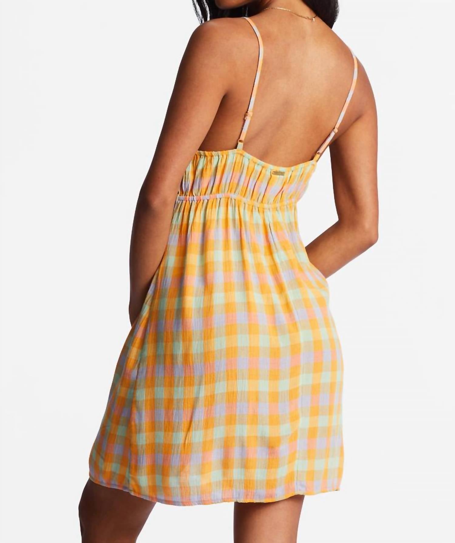 A dress you'll be reaching for season after season. Pair it with your favorite denim jacket for a more laid-back look. Embrace vibrant summer style with the Billabong As If Dress, featuring playful spaghetti straps and a fitted bodice. This women's dress is crafted from airy crinkle viscose fabric, showcasing a chic gingham pattern. The mini dress design is both comfortable and easy to wear, complete with a sophisticated v-neck and faux buttons on the front bust. Closure: Pull on. Care: Machine wash.