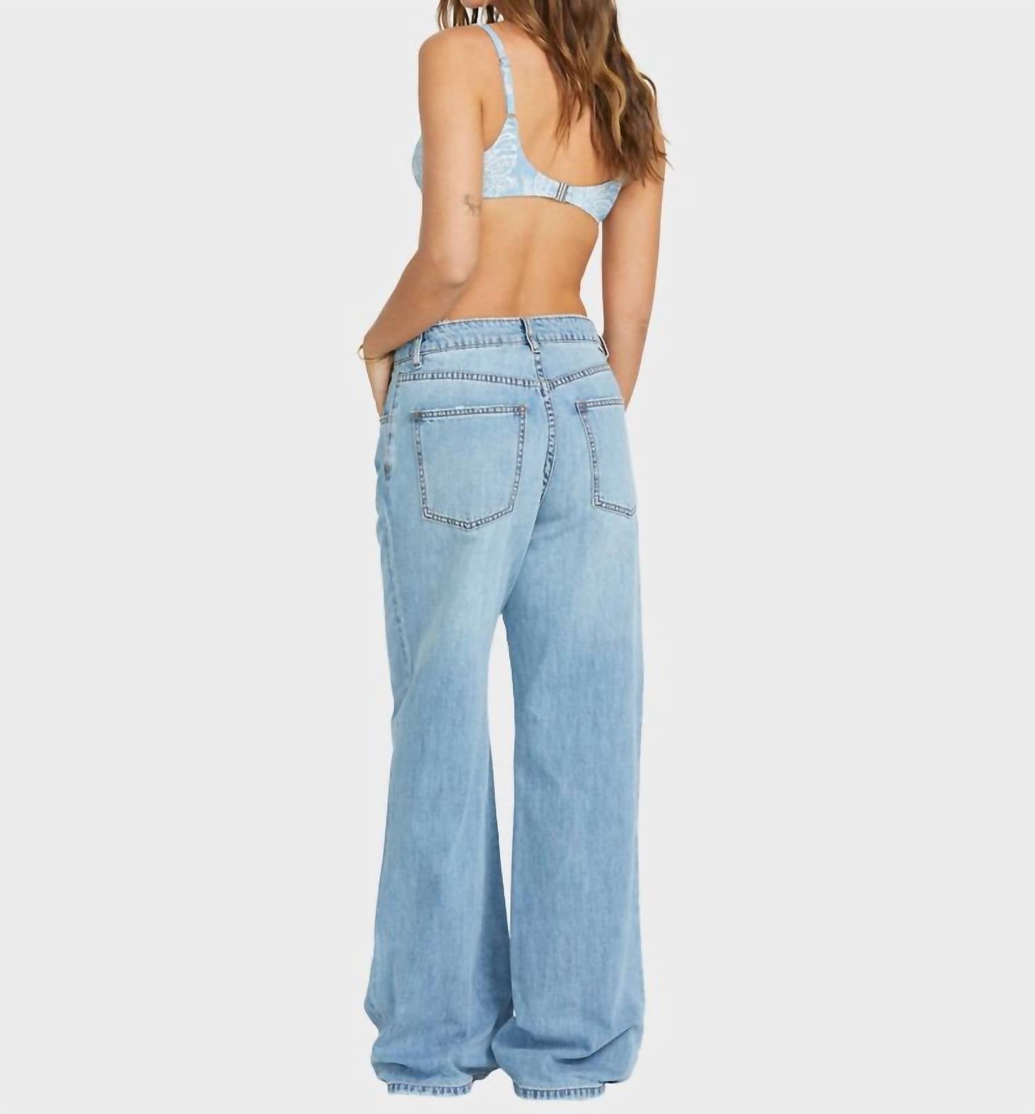 A flattering silhouette that's suprisingly versatile. Discover the Washed By The Sun Denim Jeans by Billabong, a standout addition to your wardrobe for a casual flair. Crafted from cotton denim, these jeans offer a baggy fit with a chic wide-leg style in the delightful Cali Blue hue. Featuring a high waist with a 12.5" rise, and a convenient zipper fly accompanied by a button closure, these jeans are designed for comfort and style. With an inseam of 31" and roomy 5-pocket styling, they are perfect for any holiday party or casual spring outing.