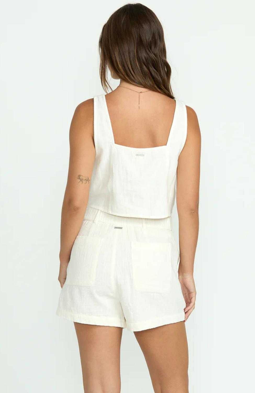 Fit, fabric and functionality. This tank top checks all the boxes. Introducing the Open Skies Woven Tank by Billabong, a perfect addition to your minimalist summer wardrobe. Designed in a flattering cropped fit with a stylish square neck, this sleeveless tank in Salt Crystal exudes effortless vacation vibes. Crafted from 100% cotton double slub gauze, it offers a lightweight and breathable feel. Closure: Pull-on style for easy wear.