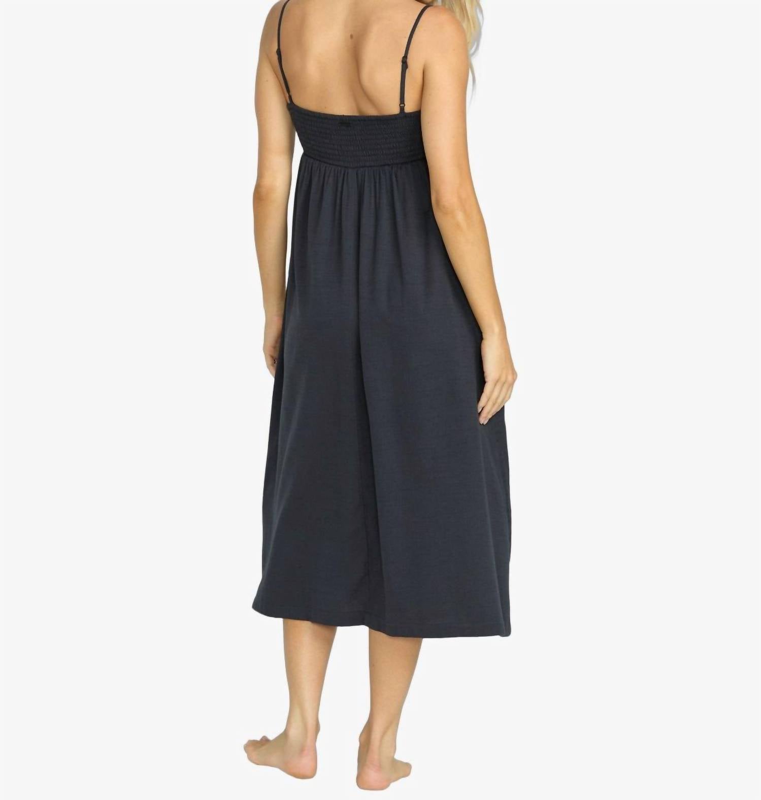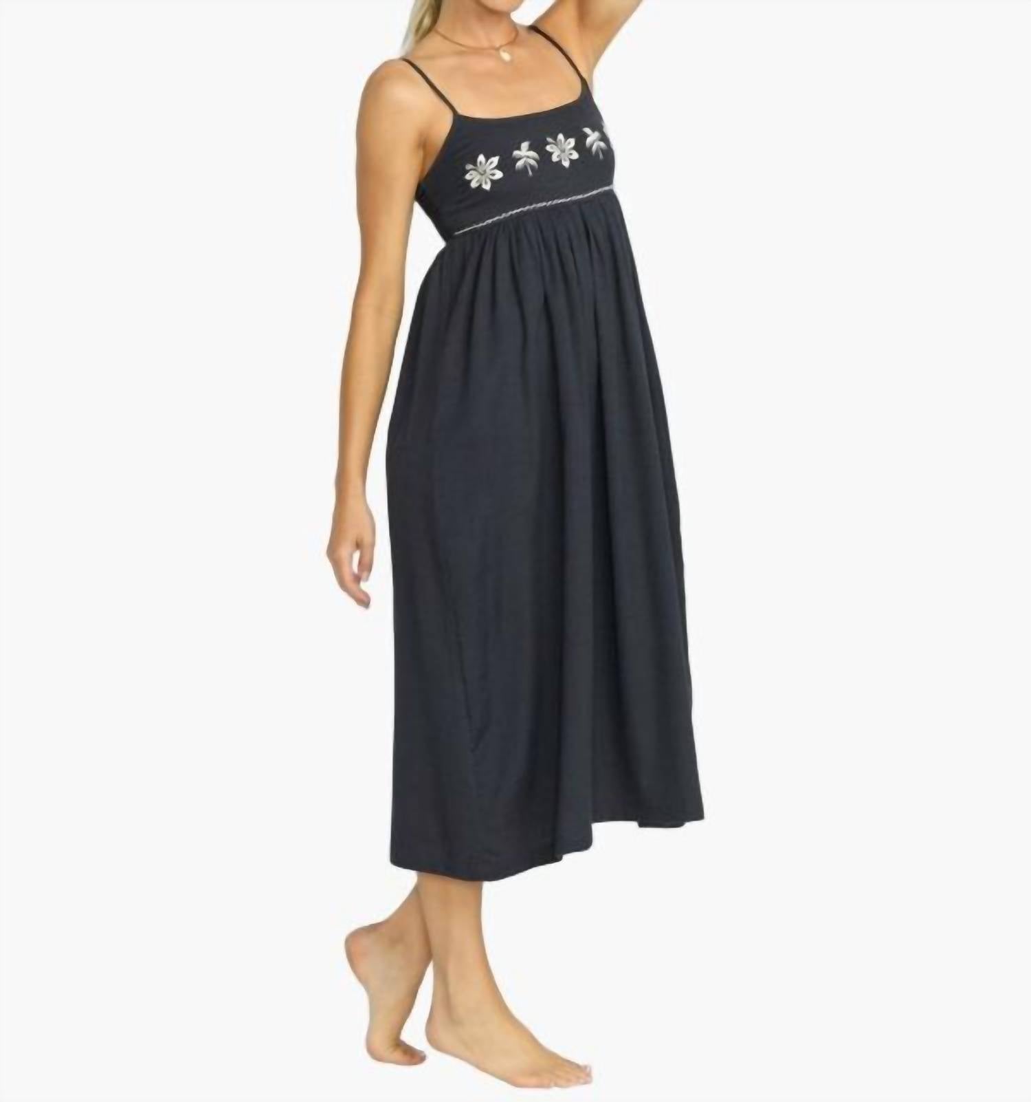 Pair with your favorite sandals for an effortlessly chic look. Introducing the Days End Dress by Billabong, a chic summer essential in classic black. With spaghetti straps and a flattering squareneck, this midi dress is crafted from a cotton blend of 60% cotton and 40% viscose in a cotton viscose slub. It features a fitted bodice, an easy A-line skirt, and intricate embroidery detail at the front bust, measuring HPS: 48" in length. Seamlessly designed with smocking at the back bodice for comfort, this pull-on dress is perfect for vacation or casual occasions.