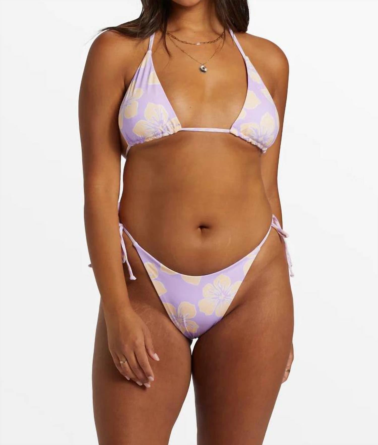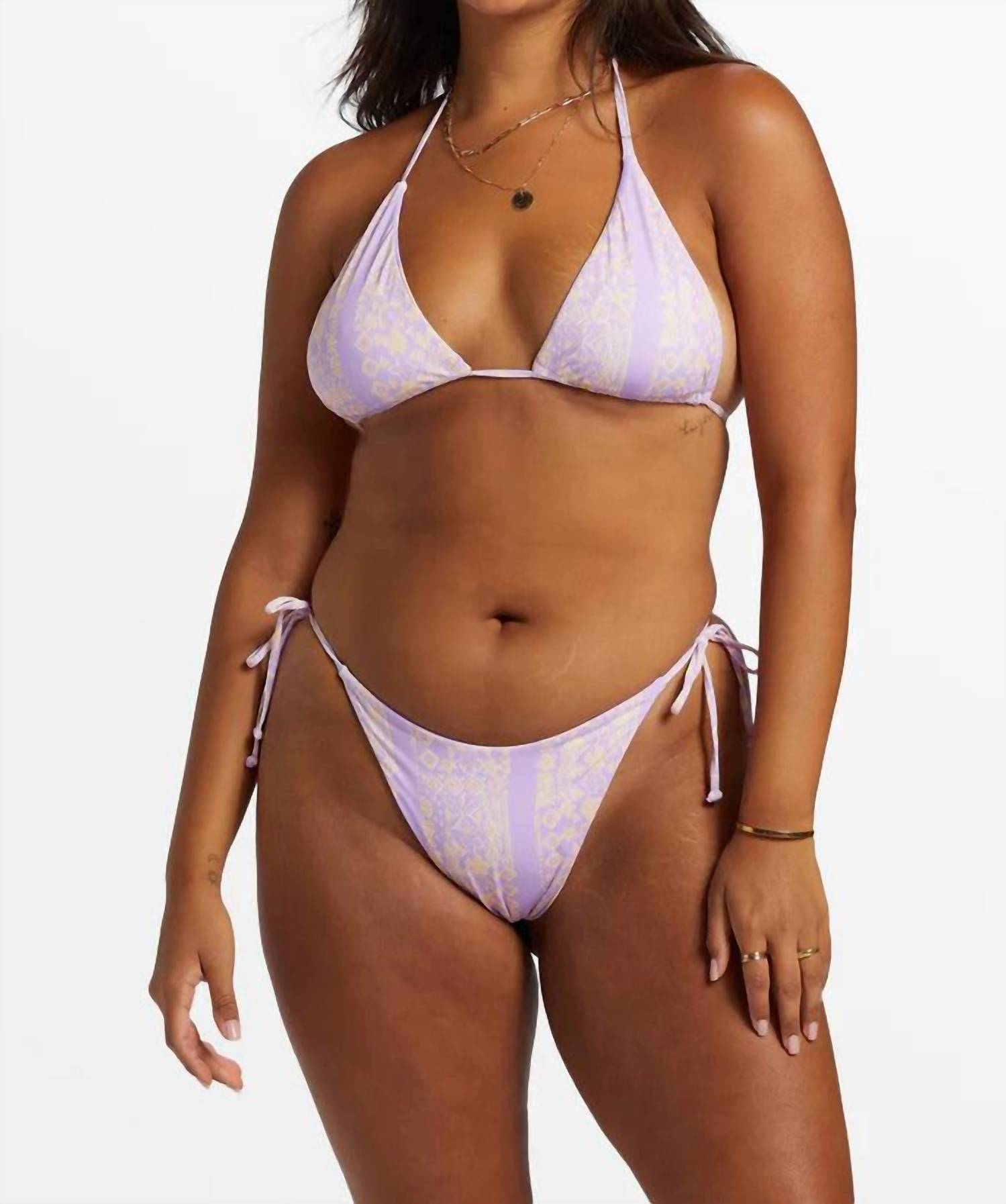 This cute and flattering swimsuit is perfect for making a splash at the pool, lounging on sun-kissed beaches, and staying stylish throughout the upcoming summer season. The Catch the Sun Remi Top by Billabong, in a vibrant multi-color print, is the perfect addition to your summer beachwear collection. Crafted from a 78% recycled nylon and 22% elastane blend, this swim top offers a soft feel and excellent stretch. Featuring a triangle shape and halter neck with spaghetti ties at the neck and back, it combines comfort with luxury, thanks to its metal trim details. Designed for moderate coverage, it is fully reversible, offering a versatile style option for any beach day.