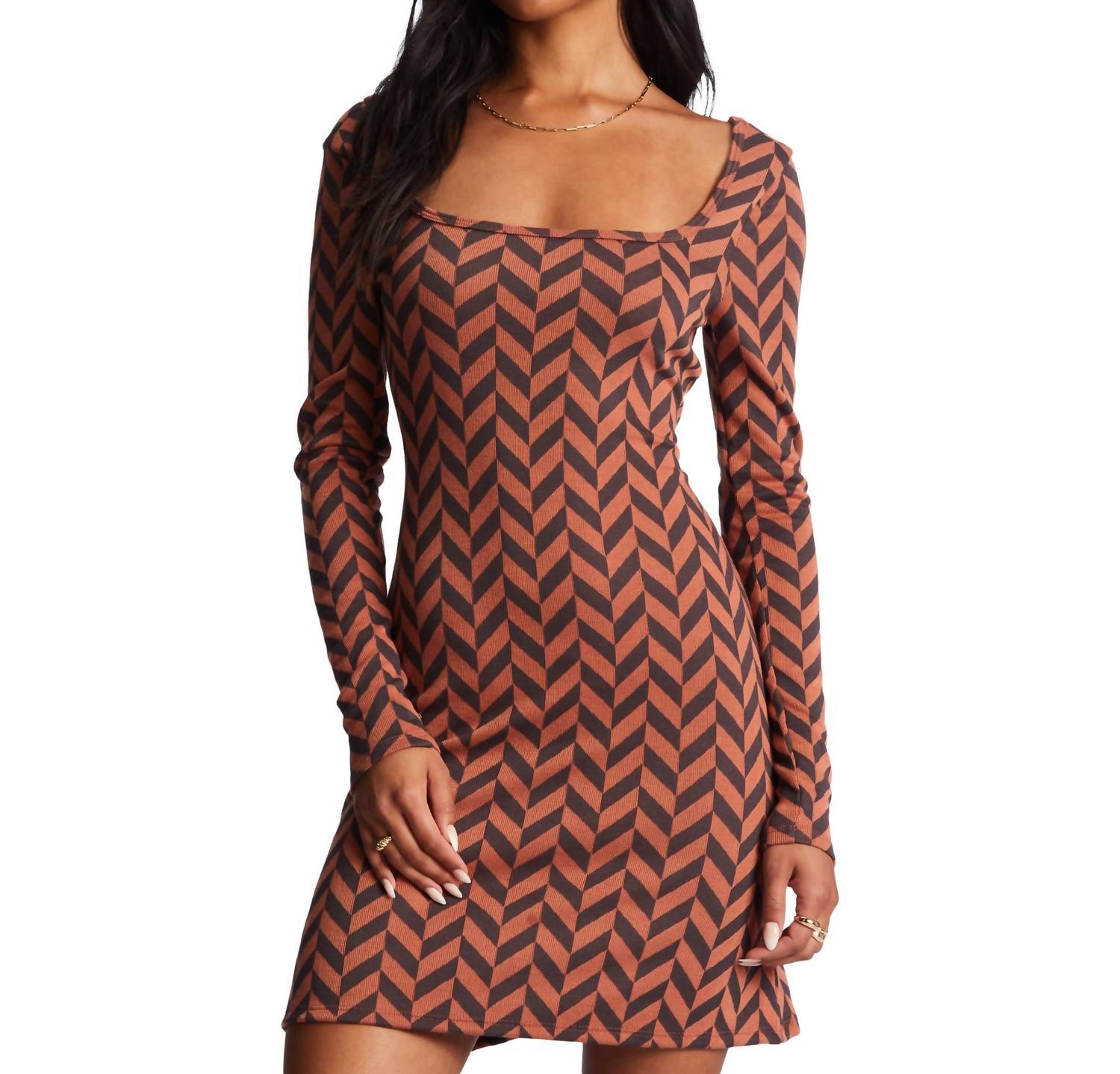 A short and breezy dress for those warmer days. The Still Your Girl Long Sleeve Mini Dress by Billabong is a perfect blend of style and elegance for any cocktail party, especially suited for Valentine's Day. Crafted in a captivating brick color, this patterned mini dress features a fitted bodycon silhouette with a sophisticated square neckline and long sleeves. The unique cutout back design adds a trendy touch, aligning with the Quiet Luxury trend. Closure: Pull on. Care: Hand wash and lay flat to dry.