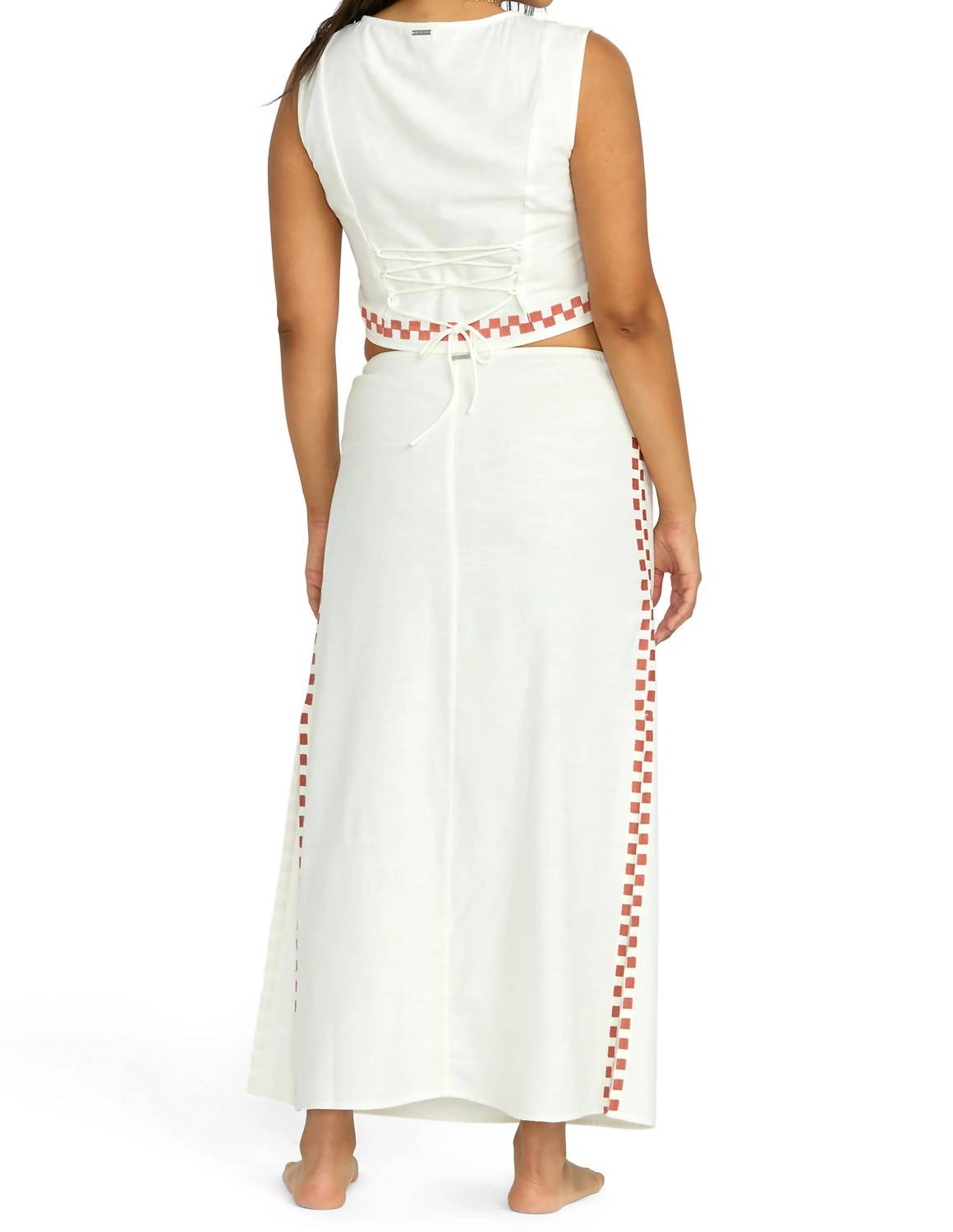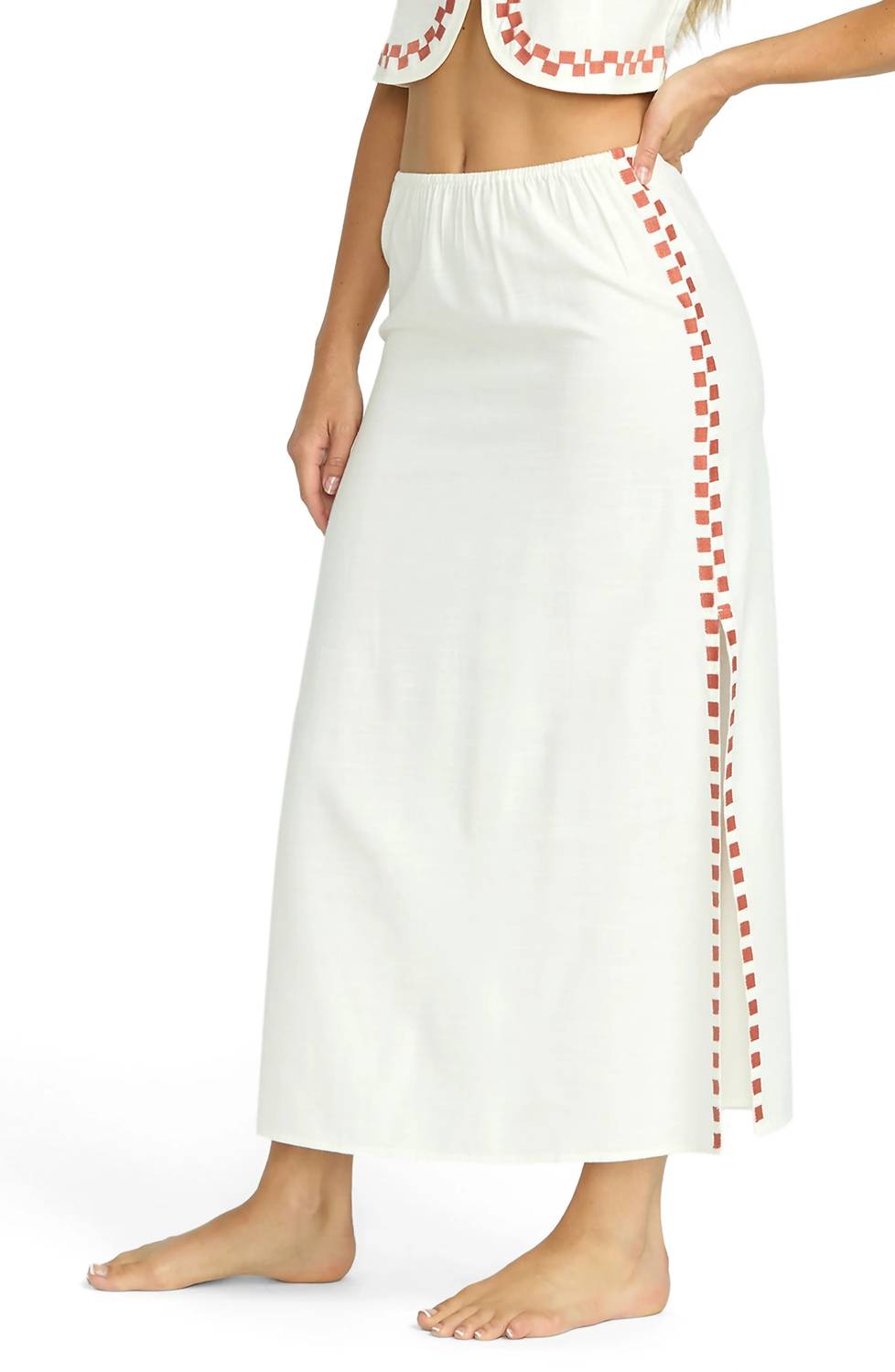 The midi length skirt is here to stay and we especially love this style. Introducing the Secret Cove Skirt by Billabong, a perfect blend of comfort and style for your vacation wardrobe. This white, patterned midi skirt is crafted from a cotton blend of 60% cotton and 40% viscose, offering a body-skimming fit with a length of 35 1/4". It features an elastic waist for easy wear, complemented by embroidery and splits at the side seams. This pull-on skirt is designed for summer getaways, embracing both elegance and ease.