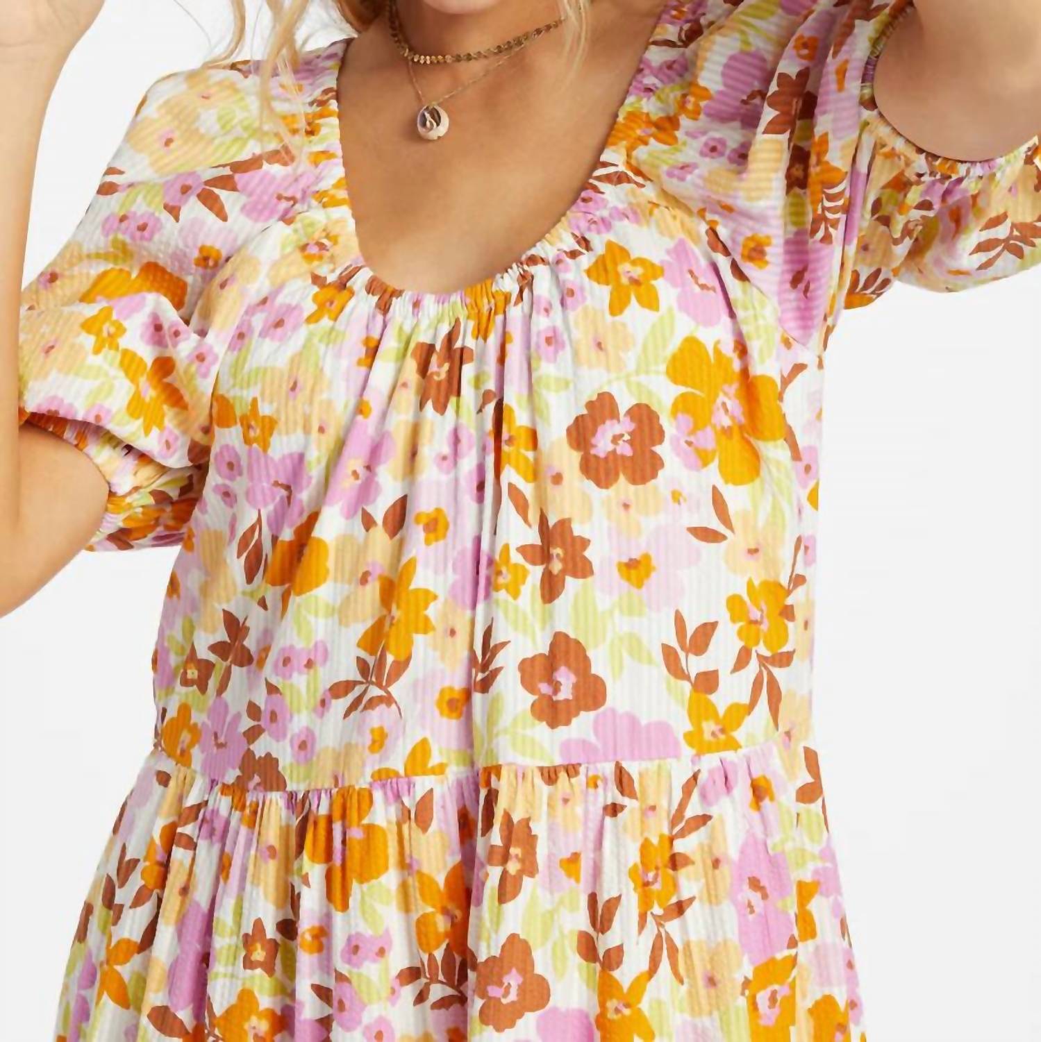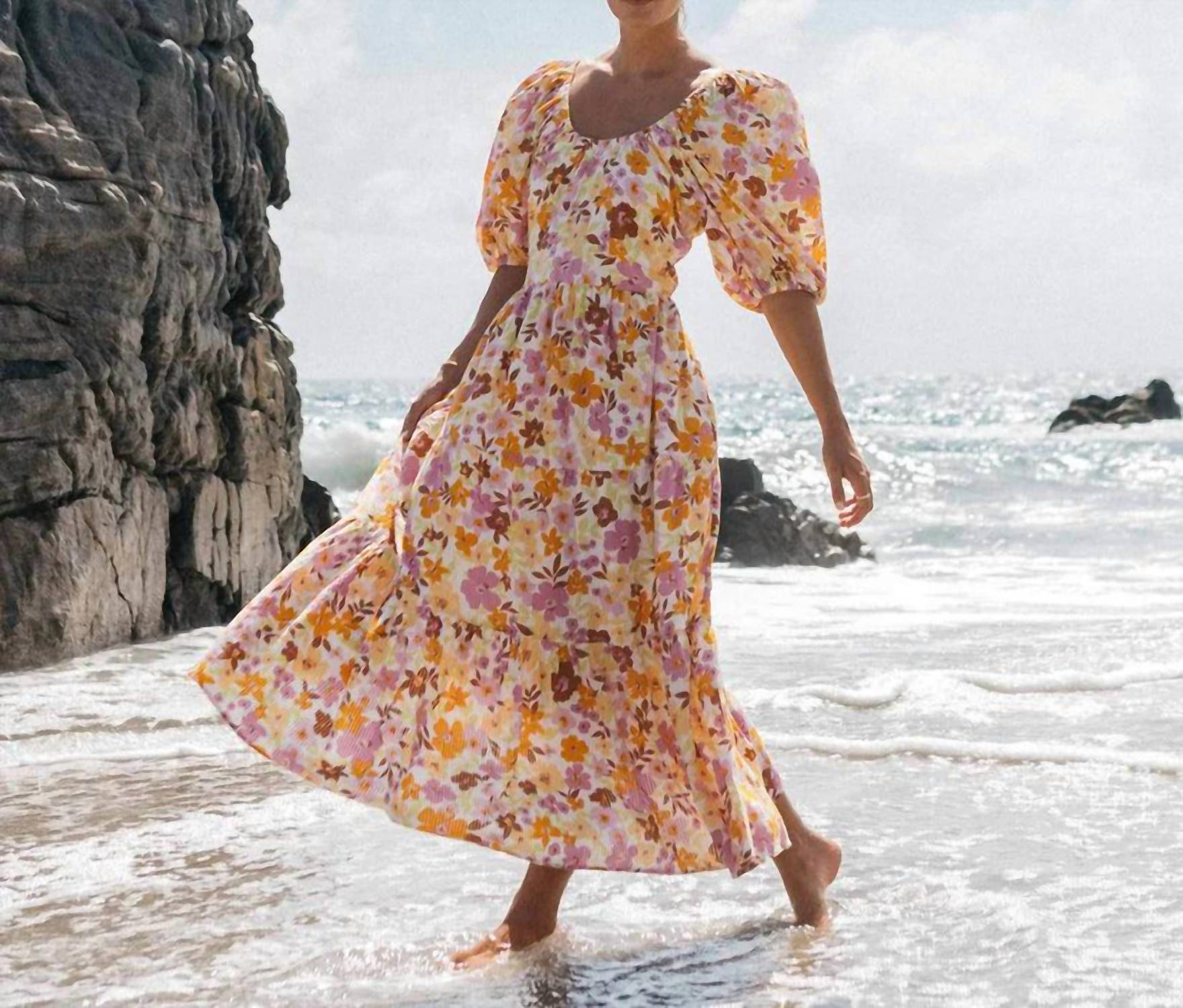 Comfortable and cute, this casual day dress has it all. Elevate your summer wardrobe with the Endless Shore Dress by Billabong, a charming piece in stunning yellow floral. This casual dress features short puff sleeves crafted from seersucker cotton stripe fabric, offering a floaty fit with a scoop neck for a touch of style. Designed in a kaftan silhouette with a tiered skirt, it delivers effortless elegance perfect for vacation vibes. Closure: Pull on.