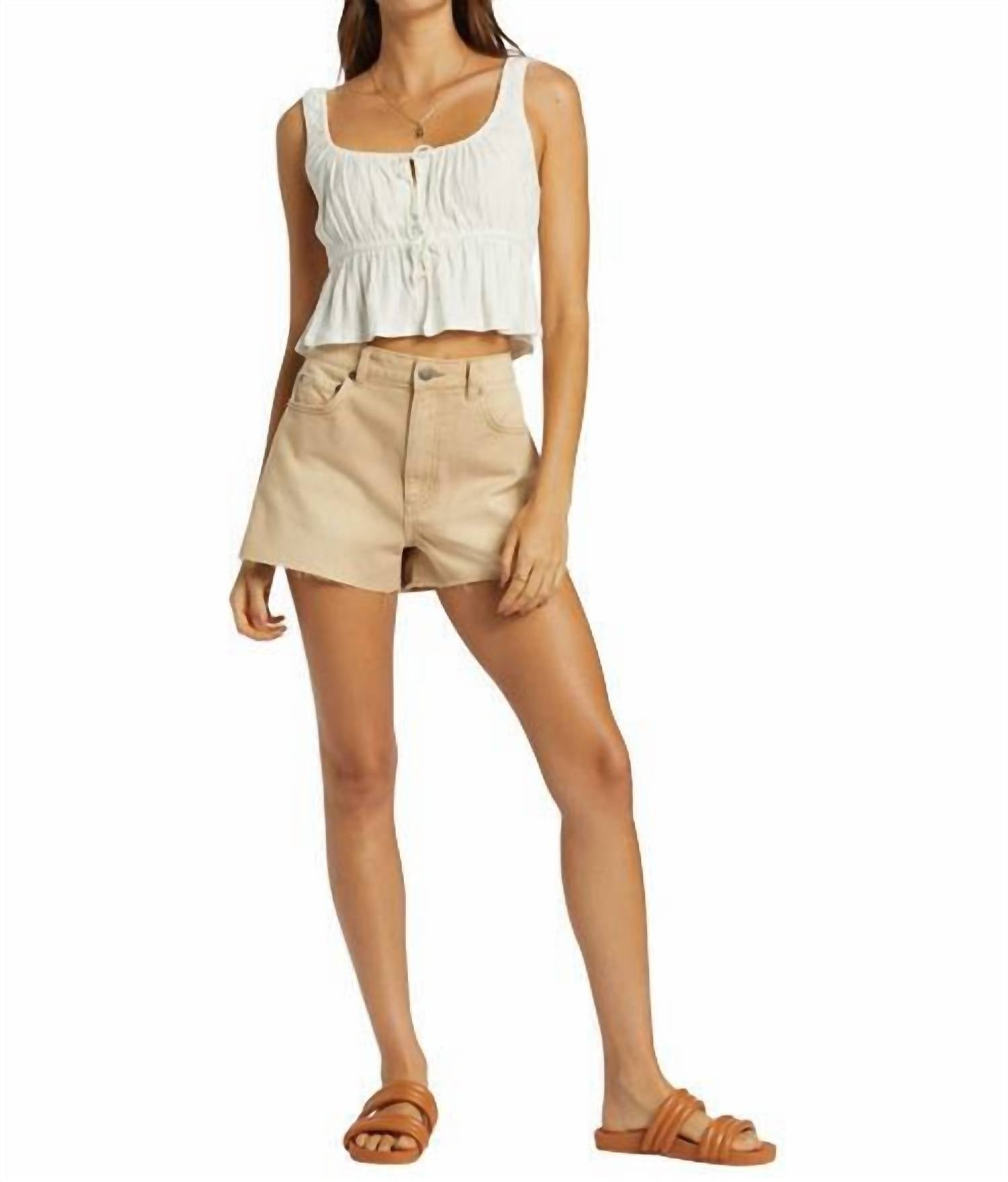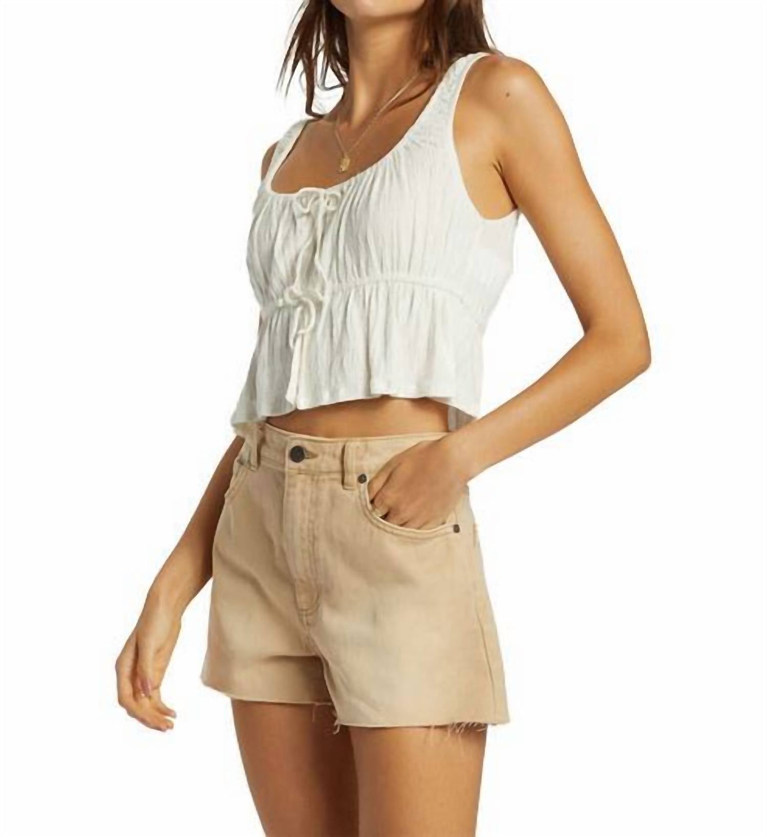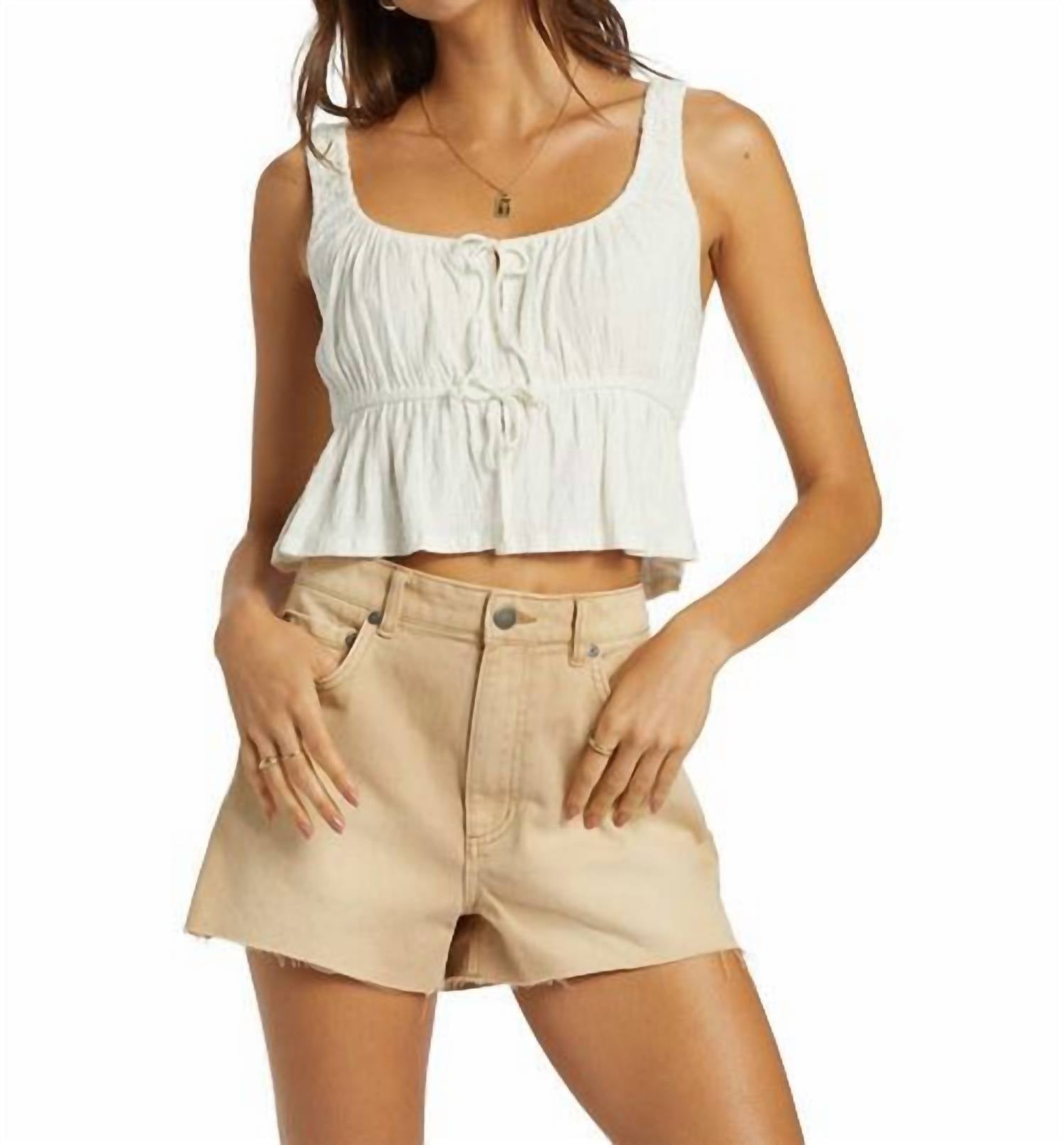 The perfect crop top for those warmer weather days. Elevate your summer wardrobe with the June Top by Billabong, a chic choice for vacation adventures. This sleeveless crop top, crafted from a viscose blend, boasts a solid white hue and a flattering scoopneck. Closure comes in the form of a stylish tie, adding a unique touch to your ensemble. Model wearing size small.