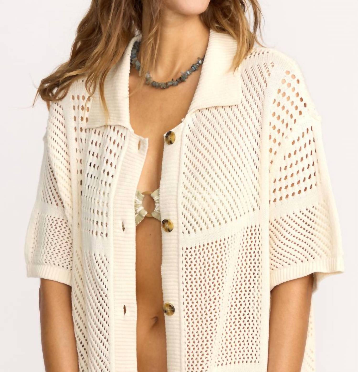 Experience the perfect blend of comfort and style with this trendy crew neck sweater, designed to effortlessly elevate your wardrobe. Pair it with your favorite denim and loafers for the perfect look. Experience a blend of casual and chic with the Cool Down Short Sleeve Sweater by Billabong, crafted from 100% cotton in an open stitch weave. This airy sweater features an oversized fit with short sleeves, accented by a front button closure and metal plate detail. Enjoy the versatility of the Whitecap colorway, perfect for vacations and spring outings. Care: Machine wash.