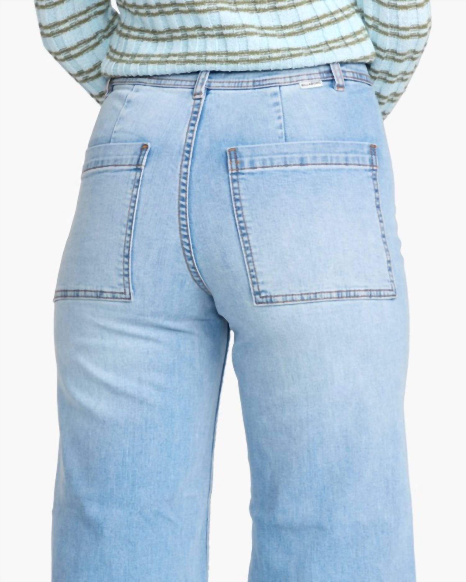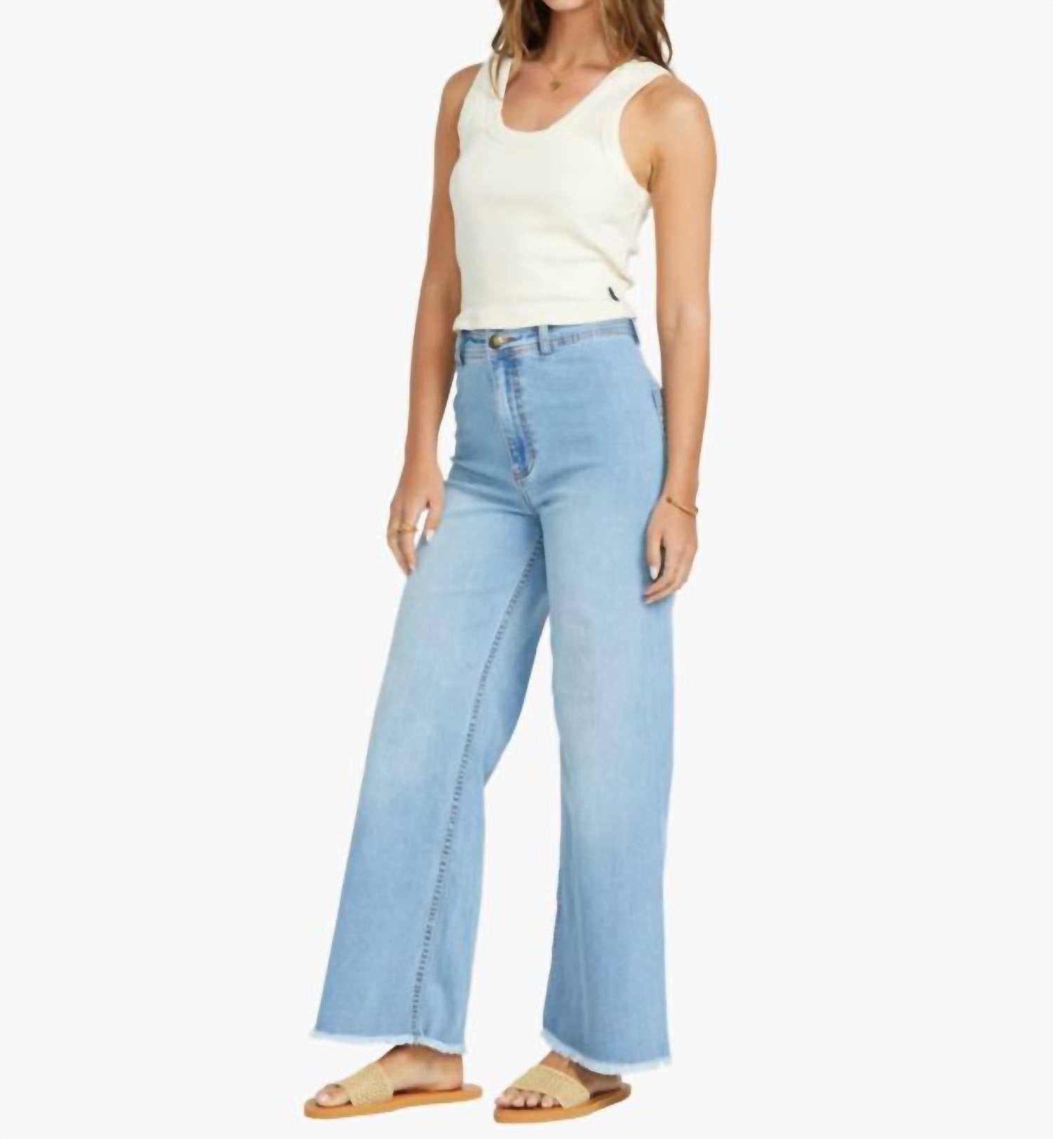 Discover the Billabong Free Fall Wide Leg Pant in Indigo Surf Spray, perfect for your summer streetwear wardrobe. These women's pants offer a relaxed fit with a stylish wide leg and a high-rise waist, featuring a distinctive frayed raw hem and logo flag at the hem. Made from a cotton elastane blend fabric (98% Cotton, 2% Elastane), they ensure comfort and stretch with a zip and button closure. Care is a breeze with machine wash and tumble dry instructions, making them a practical choice for travel and casual outings.