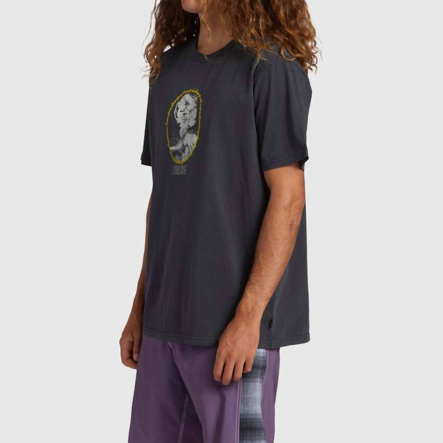 Experience the laid-back style of the Men's Slasher T-Shirt by Billabong, an ideal addition for your summer collection in a washed black hue. Featuring short sleeves and a streetwear surf graphic, this tee embodies a classic 'old-school' look with its heavyweight cotton composition. Designed with a crewneck and pull-on closure, it ensures comfort with the inclusion of a heat seal neck label. For best care, hand wash and line dry this non-activewear piece, perfect for travel or casual outings.