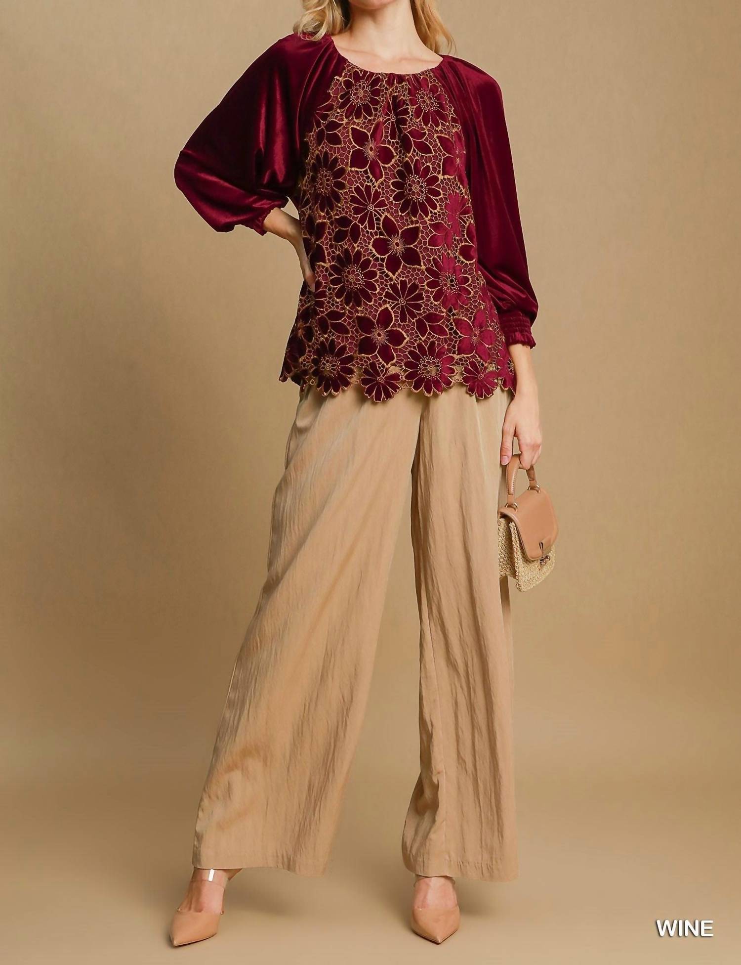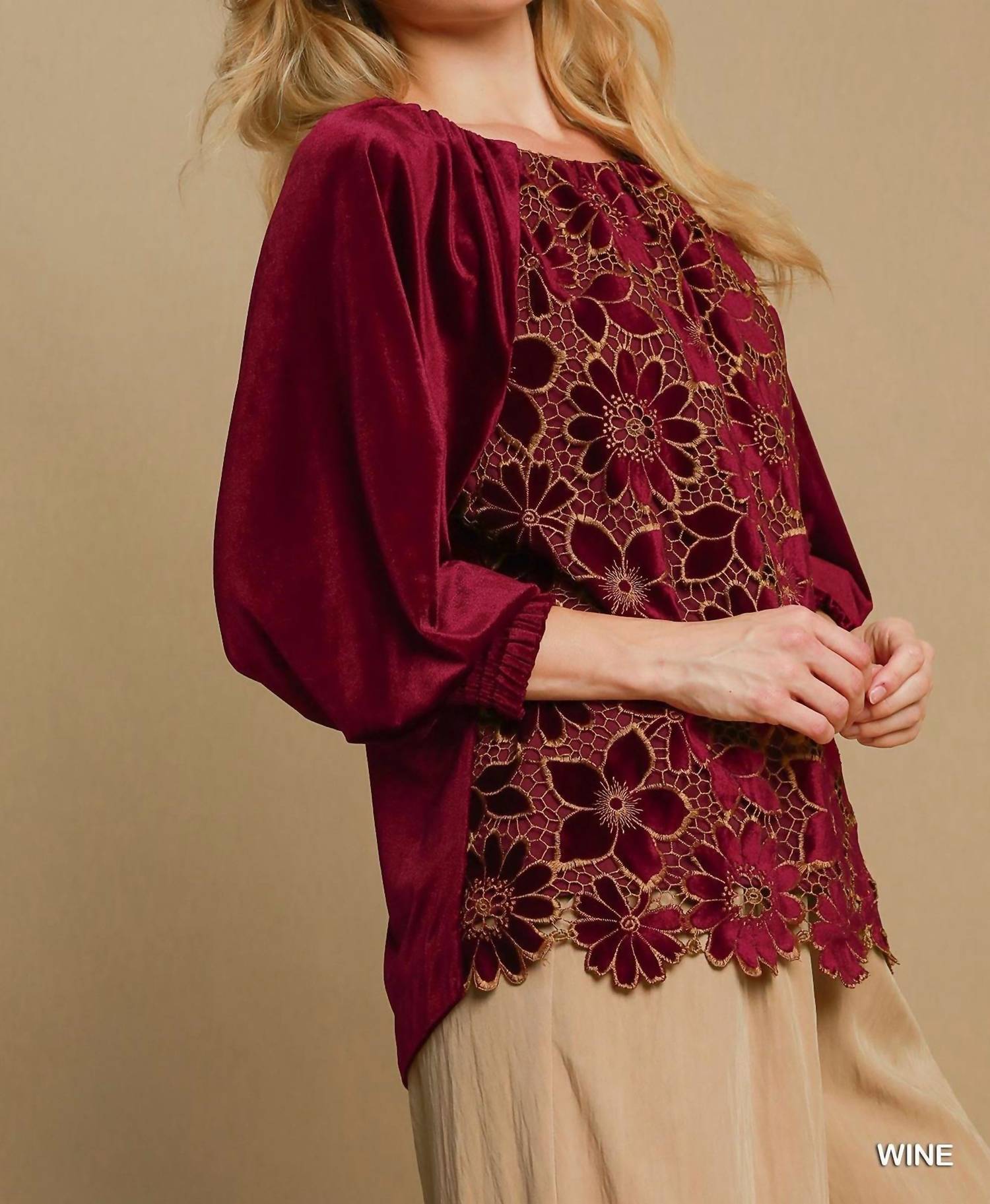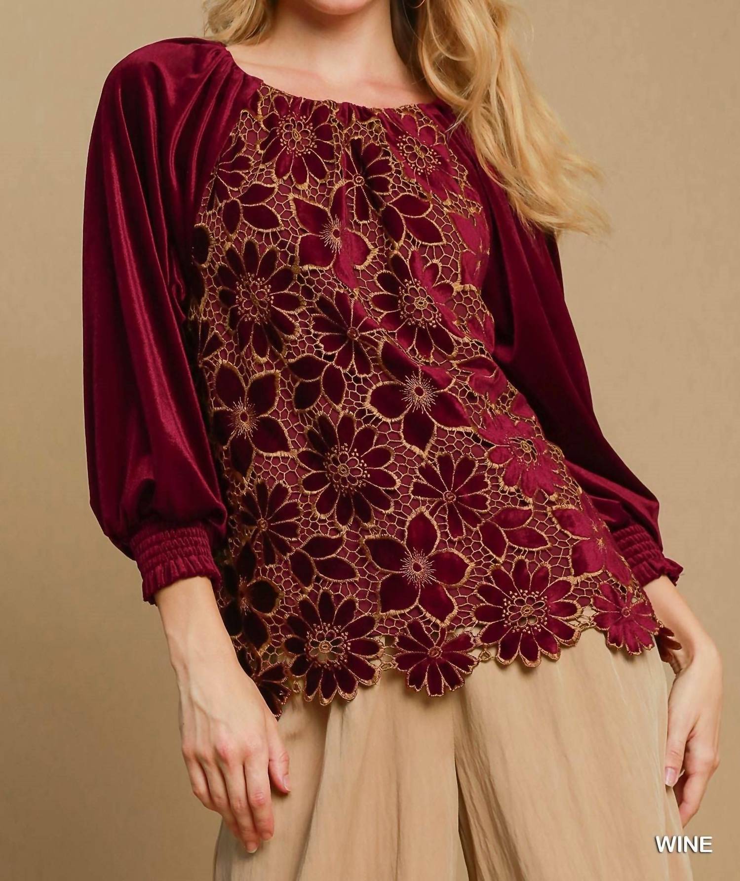 A versatile blouse that works from desk to dinner! Enhance your wardrobe with the exquisite Velvet Blossom Blouse by Umgee, crafted in a rich burgundy velvet with an intricate floral lace overlay. The blouse features three-quarter raglan sleeves with smocked cuffs, offering a romantic silhouette perfect for holiday parties. Made from 95% polyester and 5% spandex, it ensures both comfort and durability. With a scoopneck design and front lining, this top provides a flattering fit with timeless sophistication.