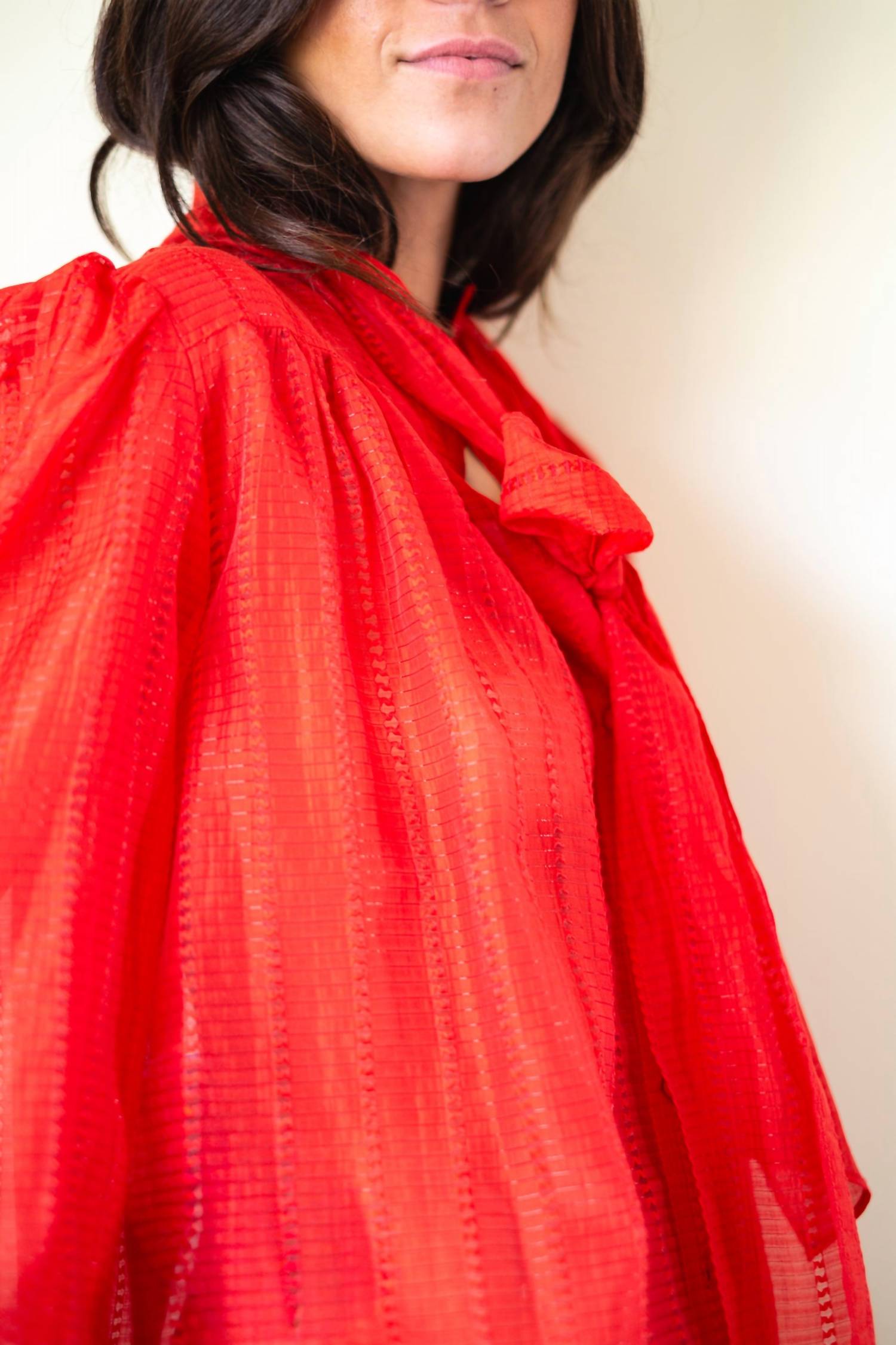 A timeless blouse that will never go out of style. Elevate your wardrobe with the Pointelle High-neck Bow Blouse by STELLA NOVA in vibrant Flame Red. This blouse features stylish three-quarter length sleeves and a loose fit, adding elegance with its high neck and a back button closure detailed with a large, tieable bow. Crafted from a lightweight, semi-transparent fabric composed of 85% Lyocell (TencelTM) and 15% Polyamide, it's perfect for a chic dinner party or celebrating New Year's Eve. Care instructions include machine wash at 30°C on a gentle cycle, avoiding tumble drying, and ironing at low temperature.