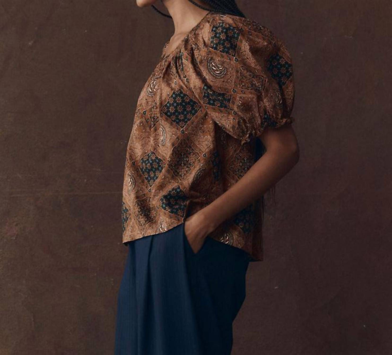 A versatile blouse that works from desk to dinner! Discover effortless style with The Moorland Puff-sleeve Top by THE GREAT., crafted from 100% cotton in a nostalgic geo bandana print. This short sleeve top features a scooped neckline with a deep V opening and romantic puff sleeves, further enhanced by delicate binding and trapunto stitching. With its swingy fit, it's perfect for a maximalist wardrobe, especially for Thanksgiving and vacation occasions. Care is simple with a pull-on closure and instructions to machine wash cold and tumble dry low.