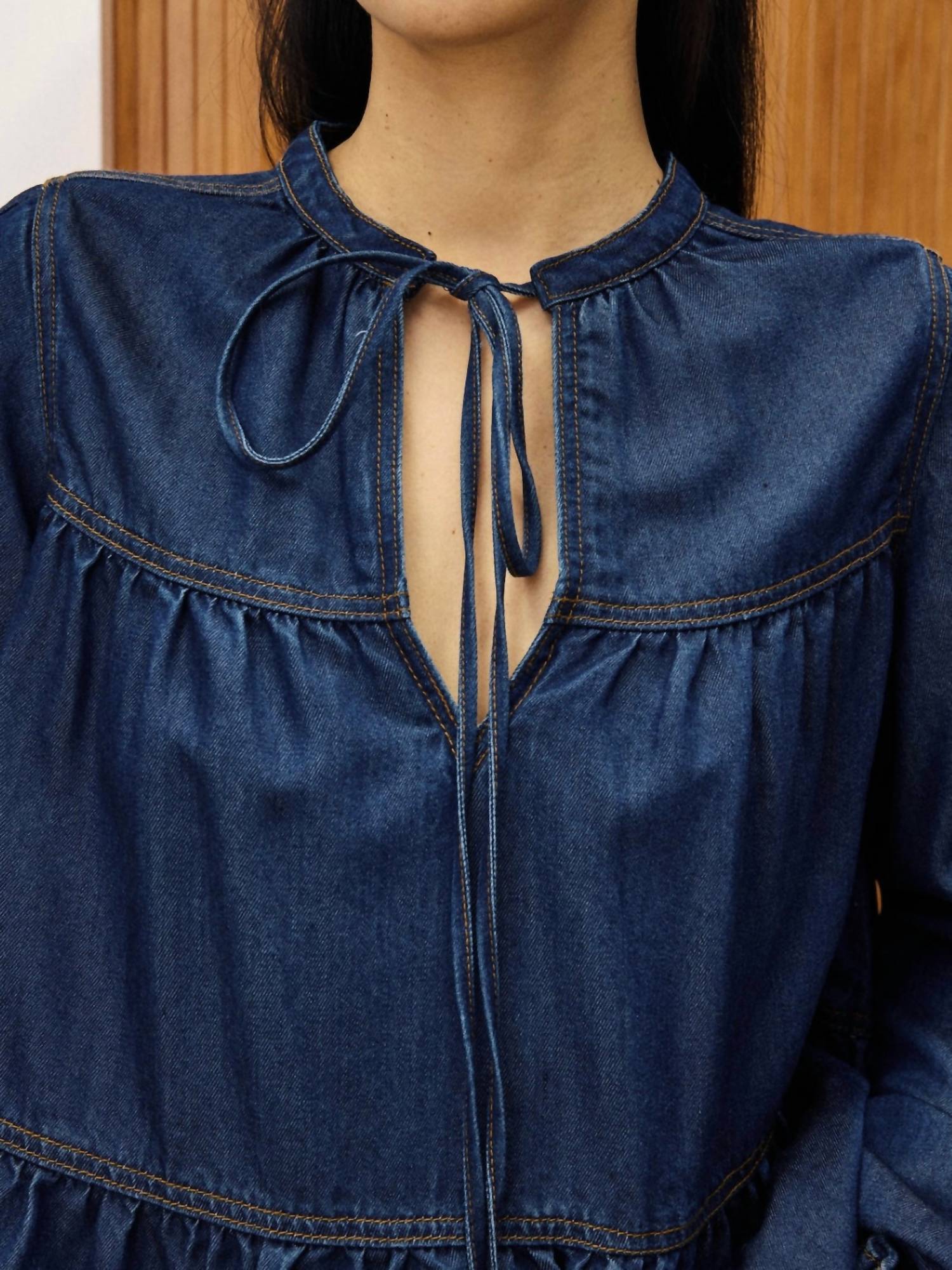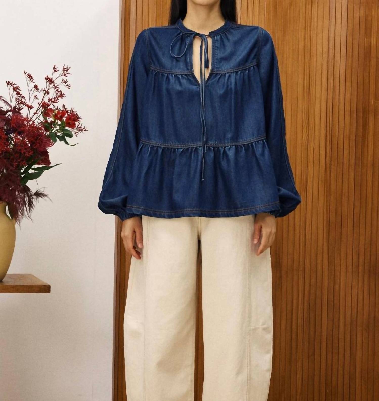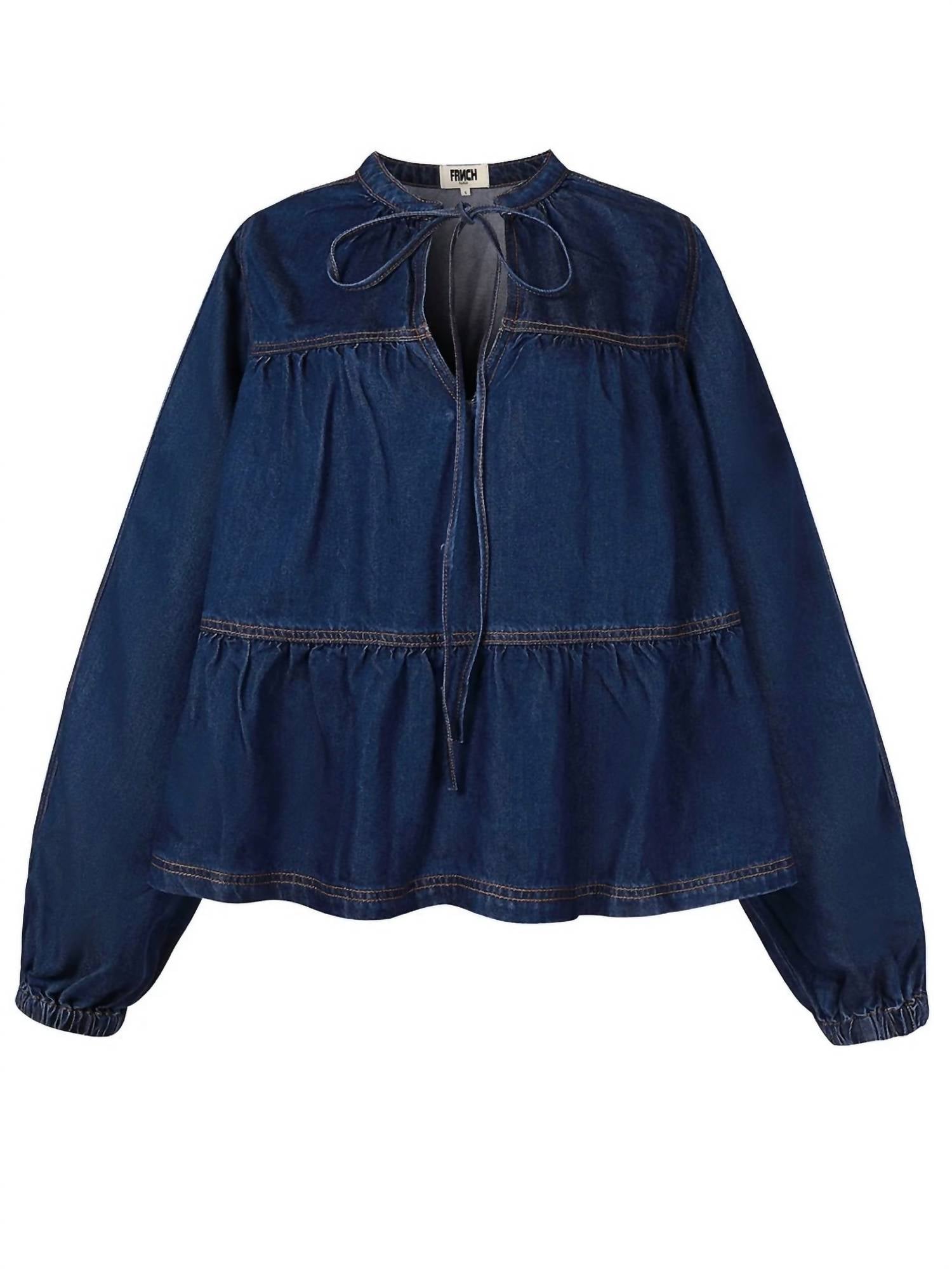 A timeless blouse that will never go out of style. Introducing the Cixous Denim Babydoll Blouse by FRNCH, a charming piece designed for the modern woman in dark wash denim. This blouse features long, blouson sleeves and a stylish V-neck, highlighted by a tie-front keyhole detail. Made from 100% Lyocell, this fabric offers a soft, exclusive feel. Care for this elegant top with a gentle machine wash. Model is wearing size XS.