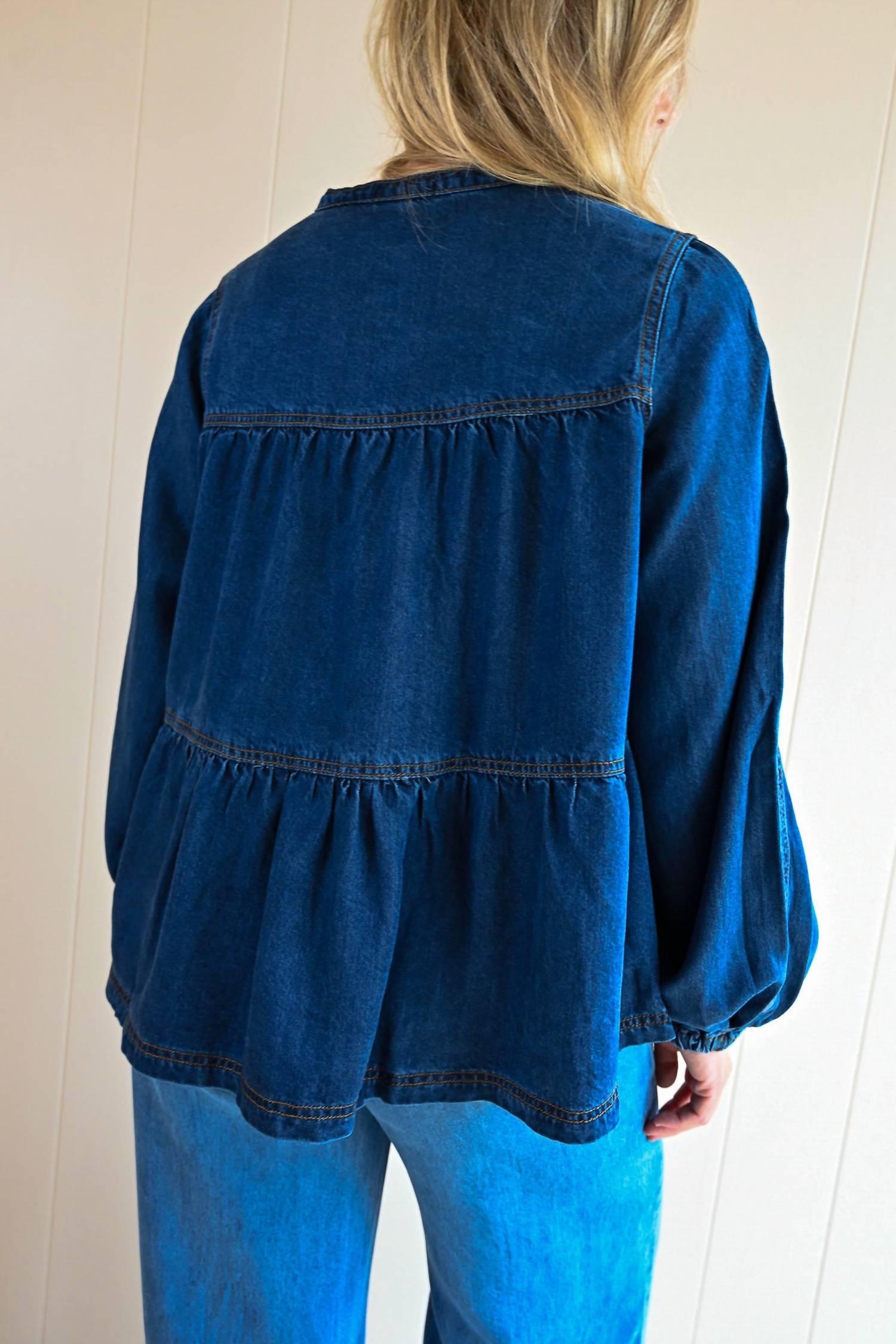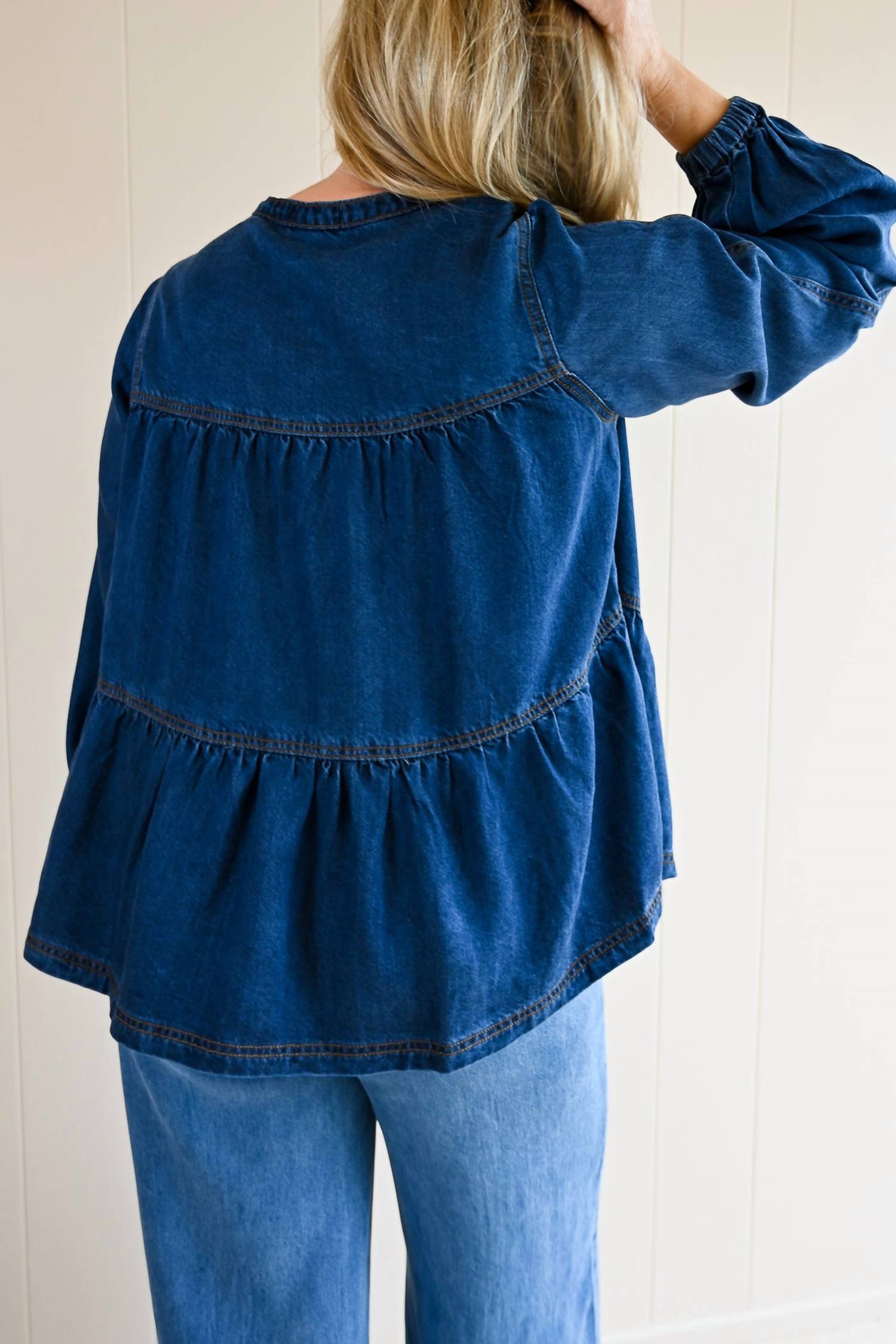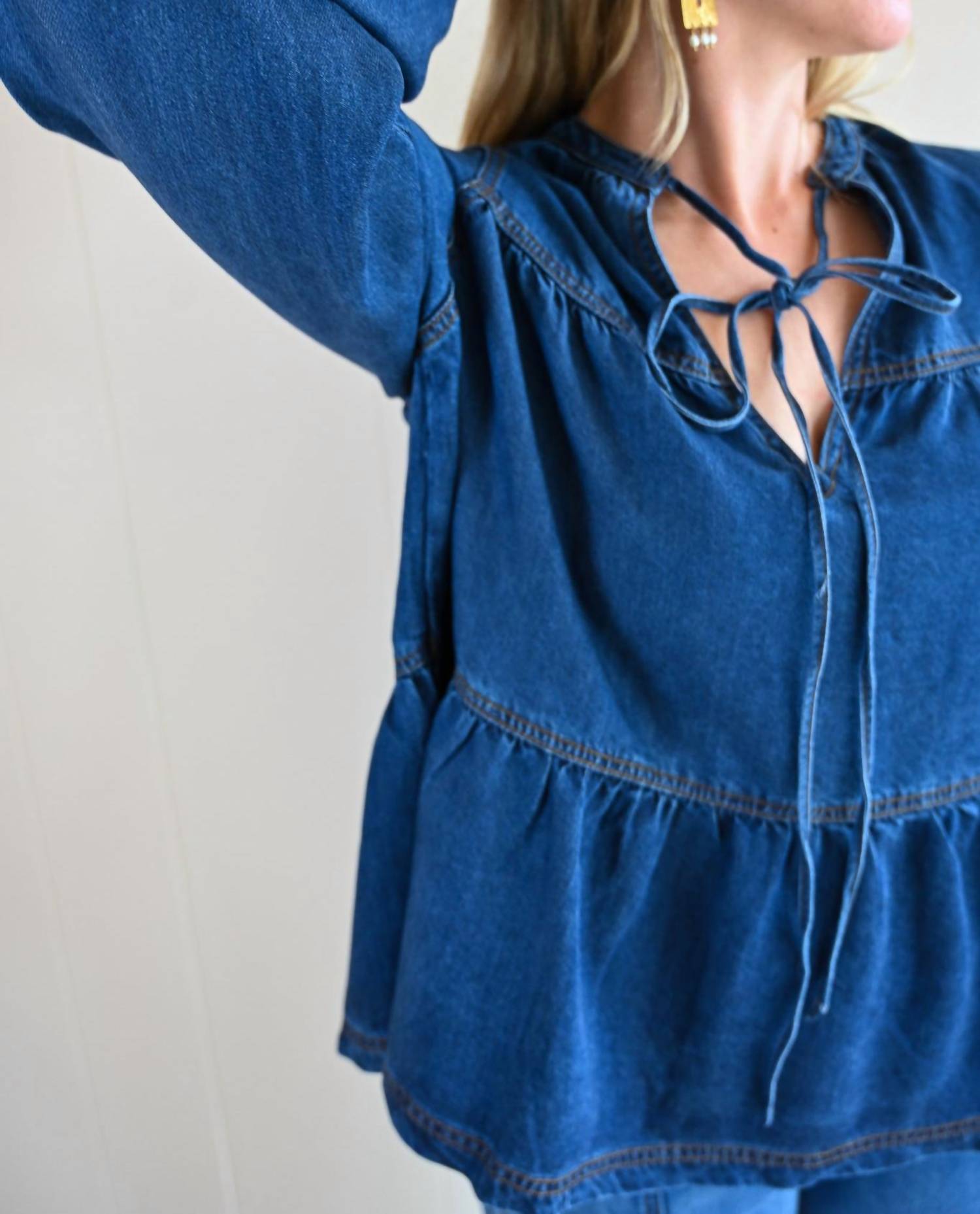 A timeless blouse that will never go out of style. Embrace effortless style with the Women's Quarterdeck Denim Tie Top by FRNCH, designed for the modern woman. This blouse features long voluminous sleeves and a chic V-neckline with a feminine tie closure, perfect for a laid-back, vacation-ready vibe. Crafted from 100% lyocell, it boasts a soft structure for comfort and elegance. Complete with a solid blue hue, this piece runs true to size, with size medium modeled at a height of 5'4".