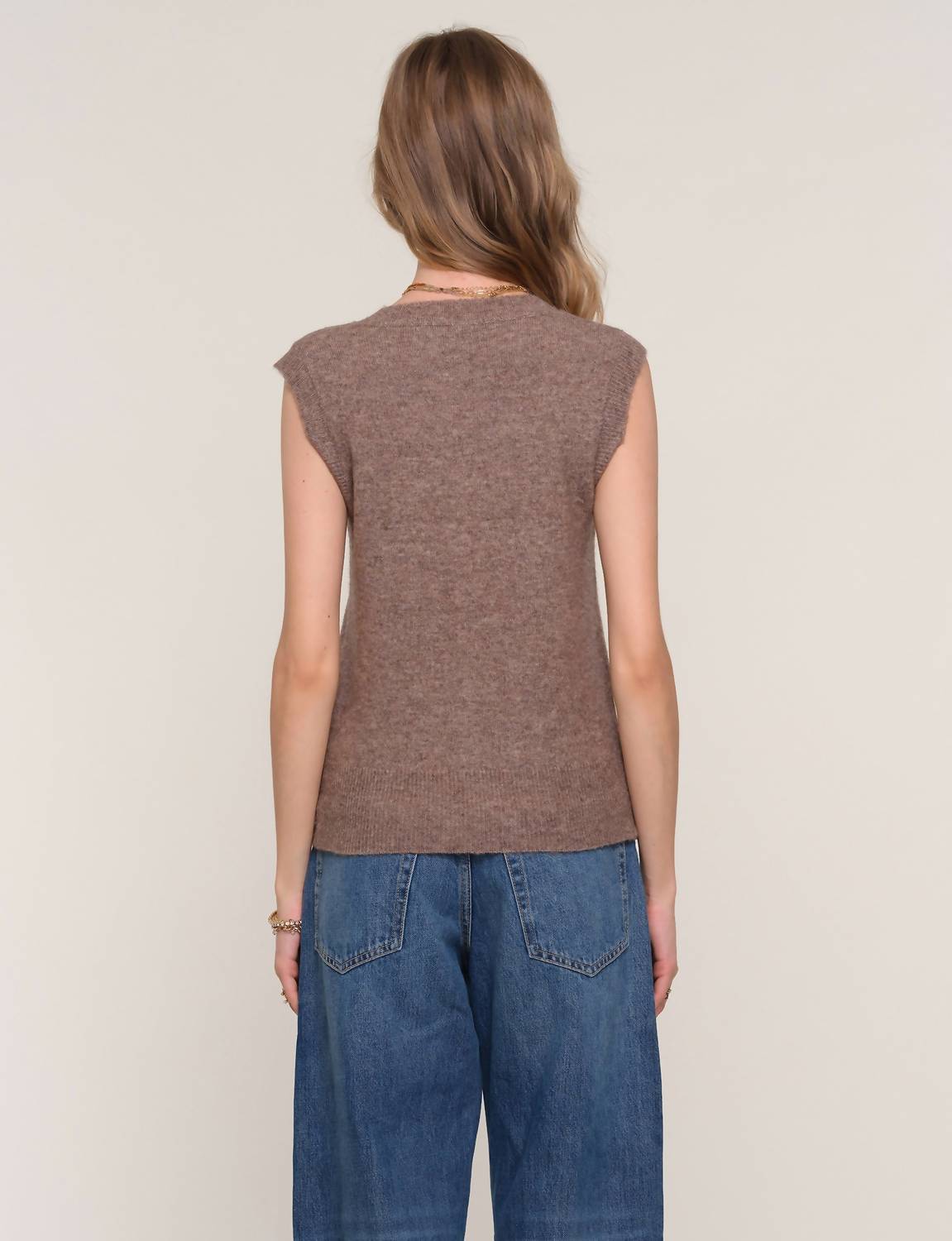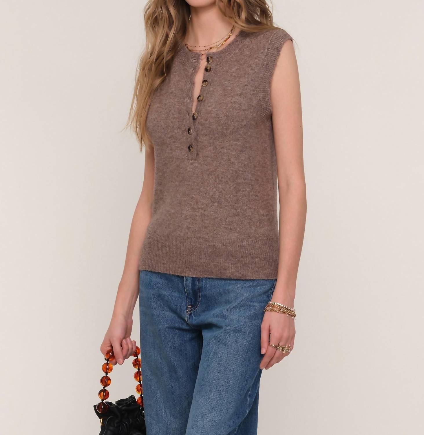 A versatile blouse that works from desk to dinner! Discover the Bianca Top by Heartloom in elegant taupe, a chic Henley that's perfect for holiday parties and summer gatherings. This sleeveless blouse is crafted from a soft melange knit, featuring a relaxed fit and a half placket with faux horn buttons. Composition includes 74% Acrylic, 22% Polyester, and 4% Spandex, with a length of 20.5" from the high point of shoulder. Designed for easy wear with a pull-on closure, it's a versatile piece with a crewneck ideal for layering or wearing as is. Model is wearing size XS (5'10" height, 34" bust, 24" waist, 35" hips).