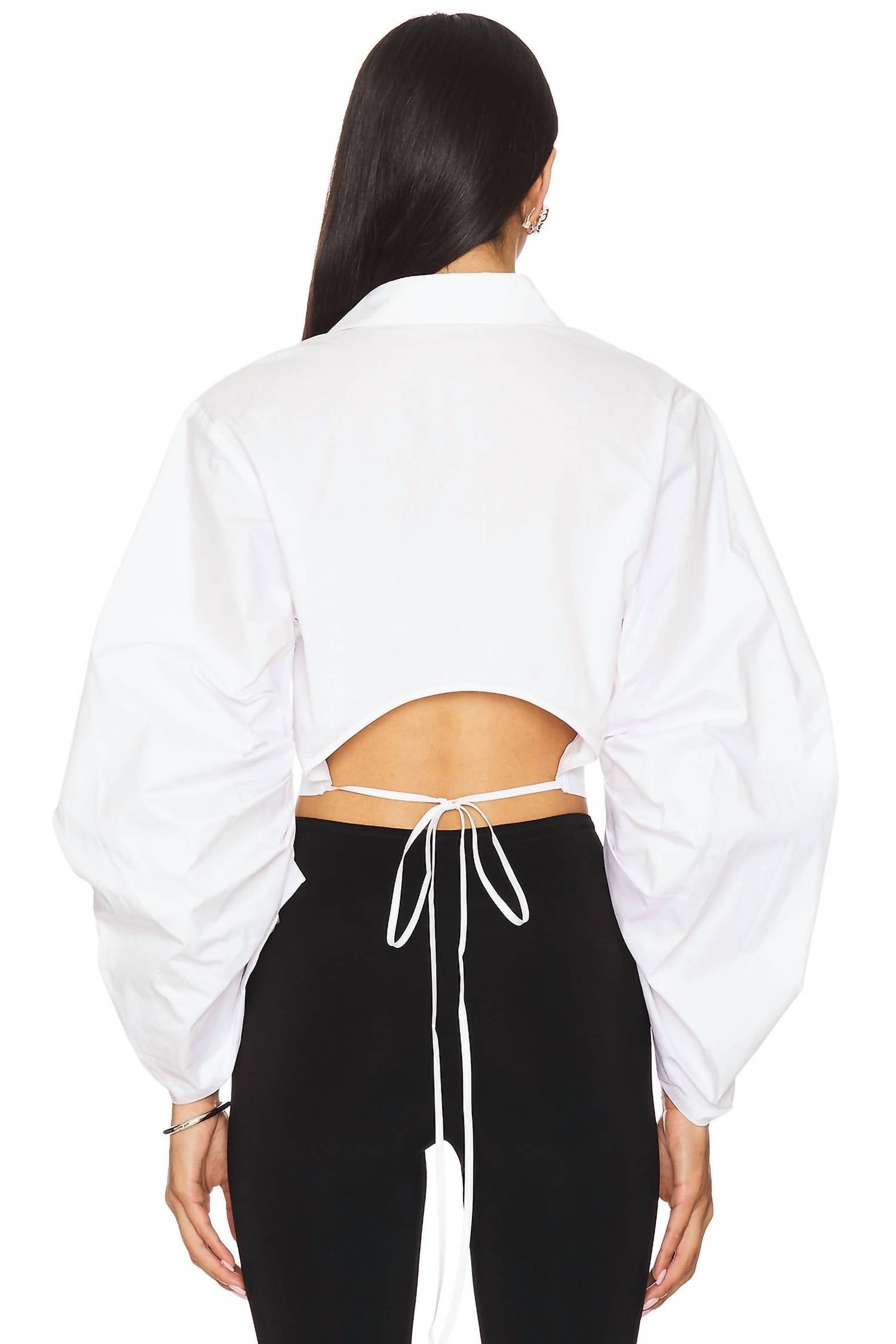 Pair this with your favorite jeans and slides for your next girls night out. Introducing the Raquel Top by Hevron, a stylish blouse crafted from 100% Cotton for a comfortable and breathable fit. This white poplin shirt features long sleeves with a gathered design, adding a touch of whimsy to its minimalist, solid pattern. Its button closure and unique back ties accentuate its modern silhouette, perfect for vacation wear or expressing personal style. Care: Machine wash cold or dry clean for lasting quality.