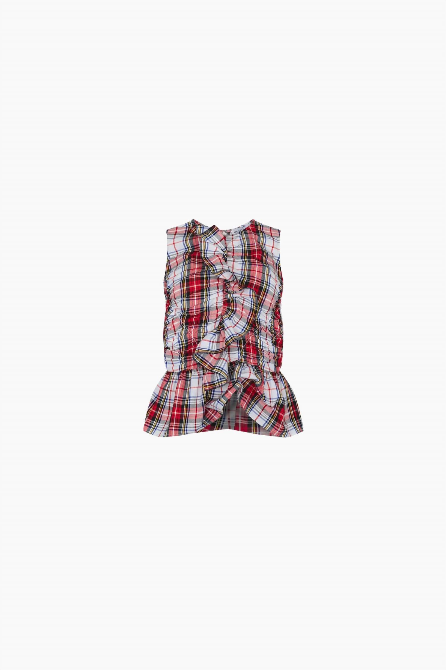 A timeless blouse that will never go out of style. Introducing the Doering Sleeveless Top by Hunter Bell in the eye-catching Carlyle Plaid. This women's blouse showcases a fitted V-neckline, cascading ruffles, and a peplum waist for a sculptural statement. Crafted from a cotton blend of 60% cotton and 40% polyester, the top measures 22 inches from the shoulder and is designed with a pull-on closure. Care for this stylish piece by hand washing and line drying, making it perfect for both holiday parties and summer outings.