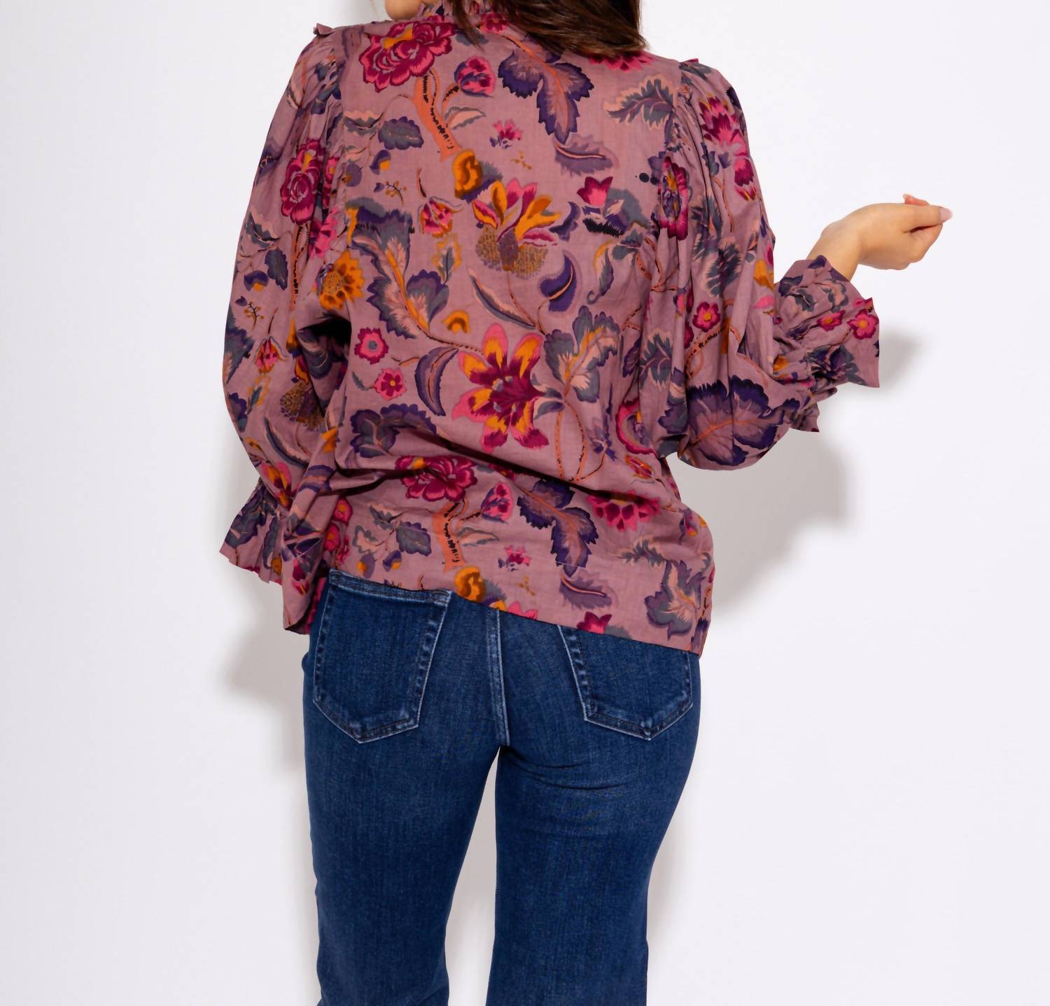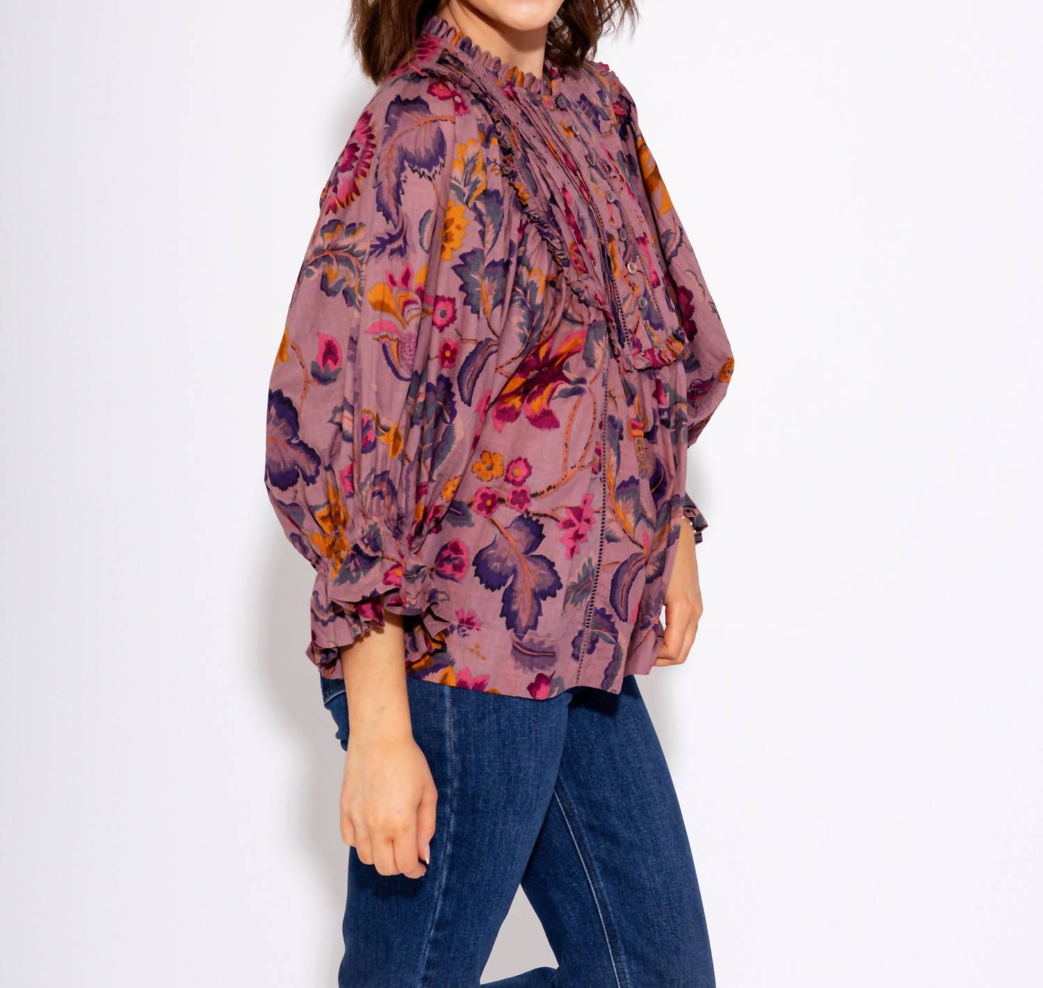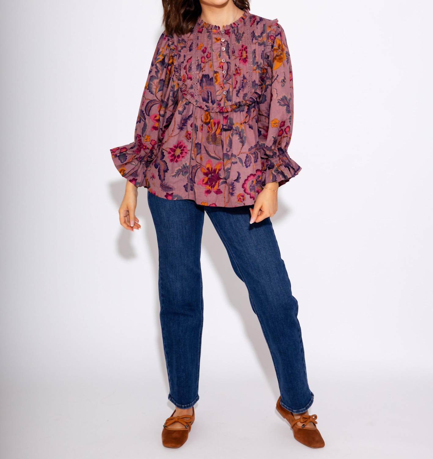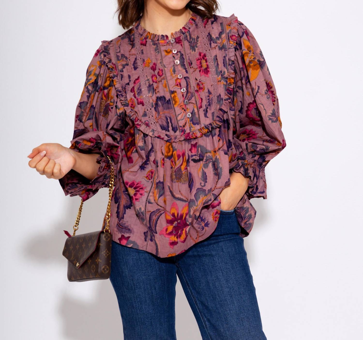 A timeless blouse that will never go out of style. Enhance your wardrobe with the Ivy Jane Tucked Bib Top in a rich grape hue, adorned with bright floral pops for a fresh, elegant appeal. Featuring three-quarter sleeves and a delicate ruffle neck, this top exudes feminine charm. Closure: Button closure. Perfect for both casual and dressy occasions.