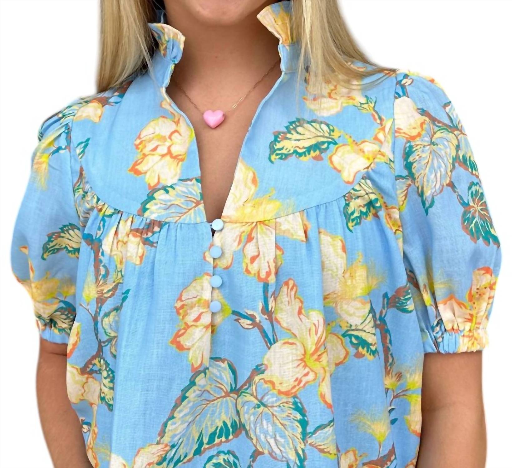 Pair this with your favorite jeans and slides for your next girls night out. Introducing the Golden Lillies Yoke Button Top by Jade, a charming floral blouse perfect for your next vacation. With short sleeves and a boho-chic vibe, this multi-color top is sure to add a touch of springtime whimsy to your wardrobe. Featuring a V-neckline and a button closure, it combines style and ease for effortless wear. Ideal for women who appreciate vibrant, cheerful patterns and comfortable fits.