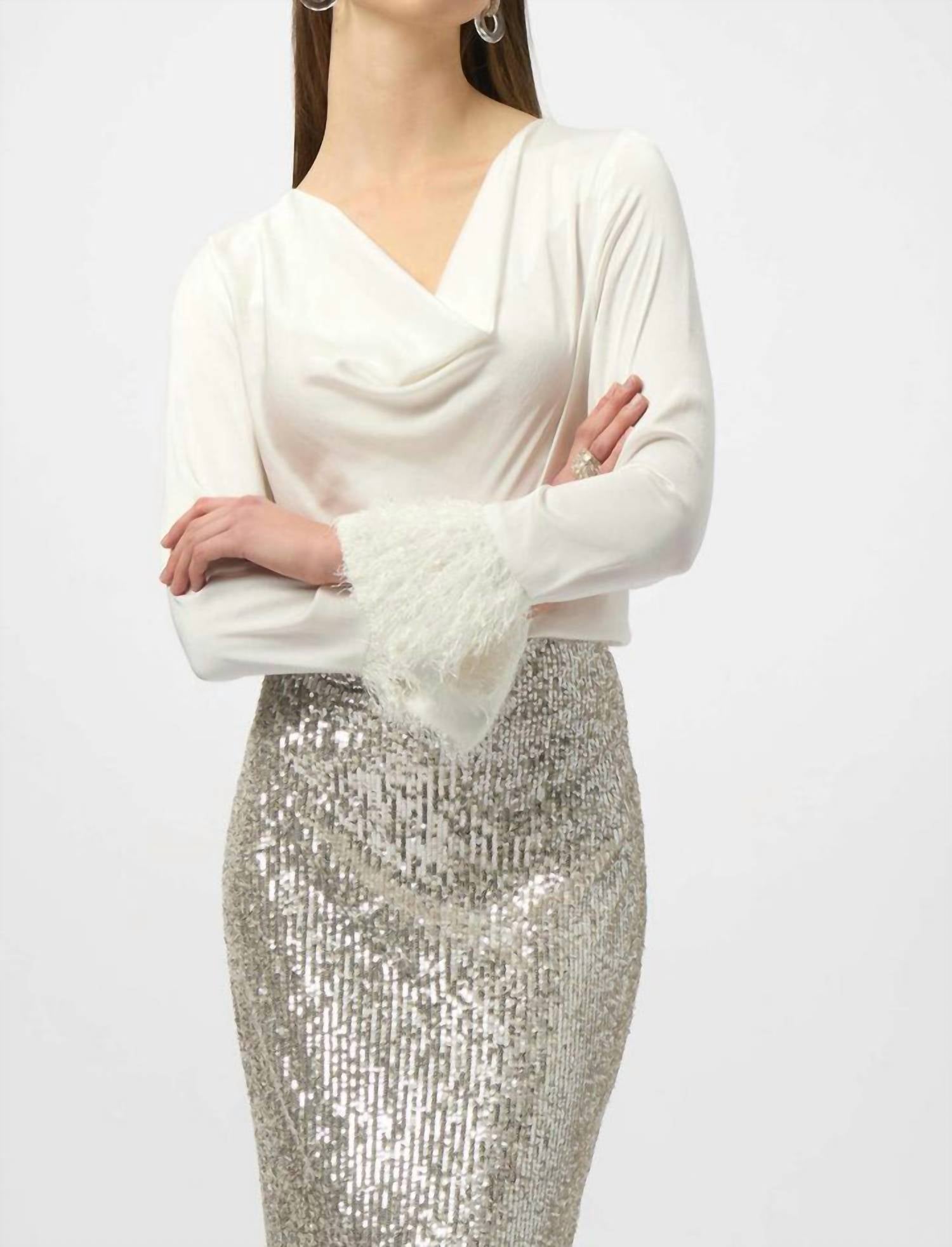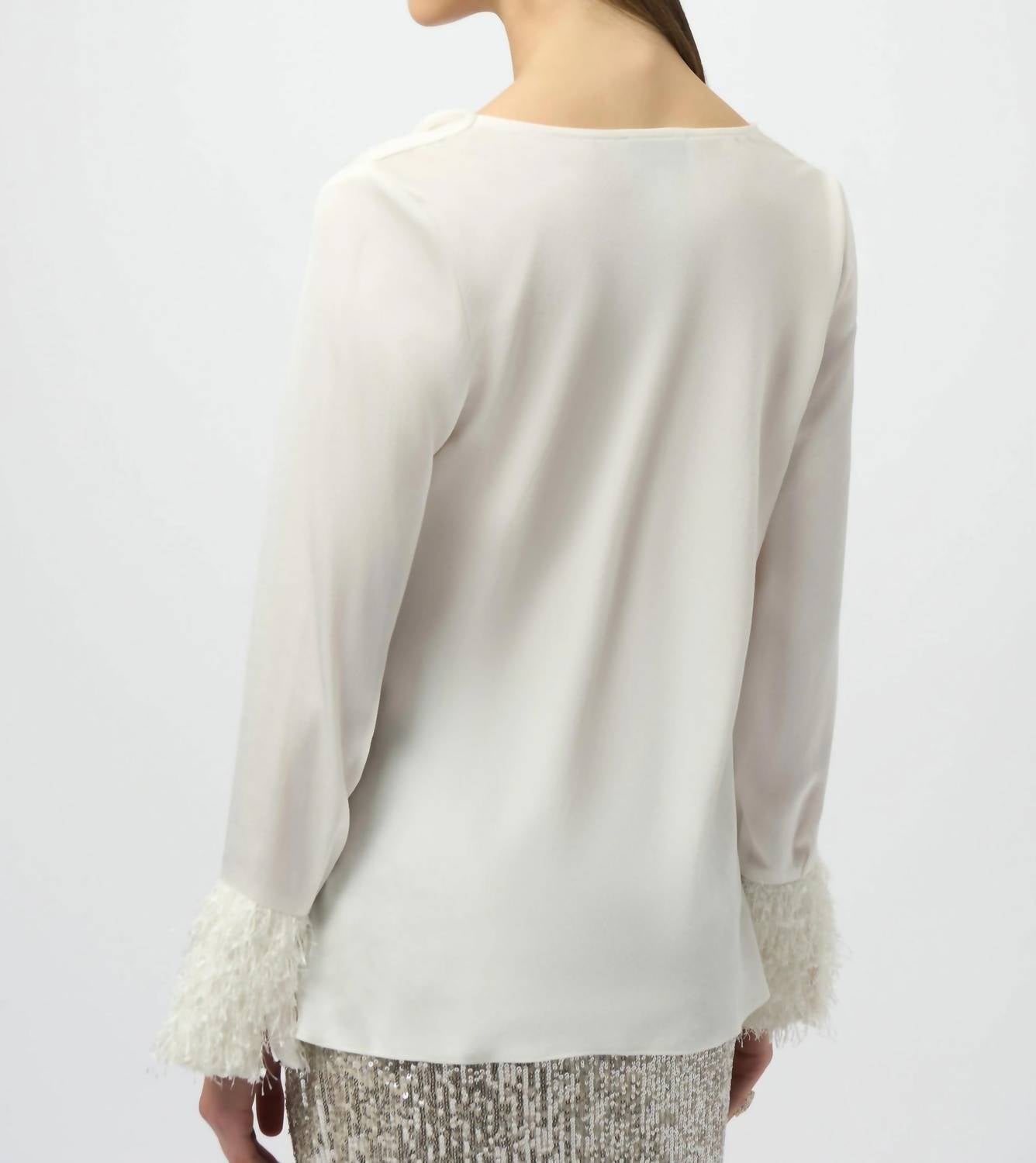 A timeless blouse that will never go out of style. Elevate your wardrobe with the Fringe Cuff Top by Joseph Ribkoff in an elegant Winter White hue. This women's blouse features long, cuffed sleeves with slits and a sophisticated cowl neck design. Crafted from luxurious recycled hammered satin fabric, it combines 67% recycled polyester with 33% polyester for a sustainable yet stylish option. For care, simply hand wash and lay flat to dry, ensuring your top remains pristine for every occasion.