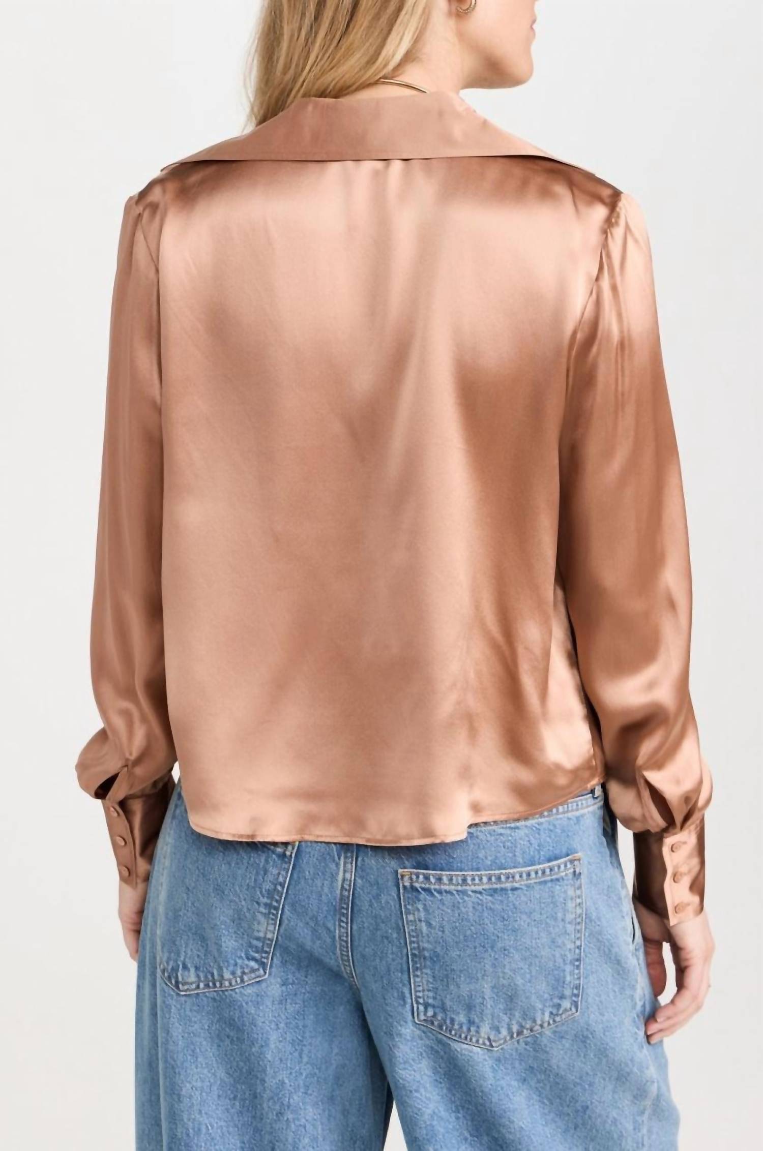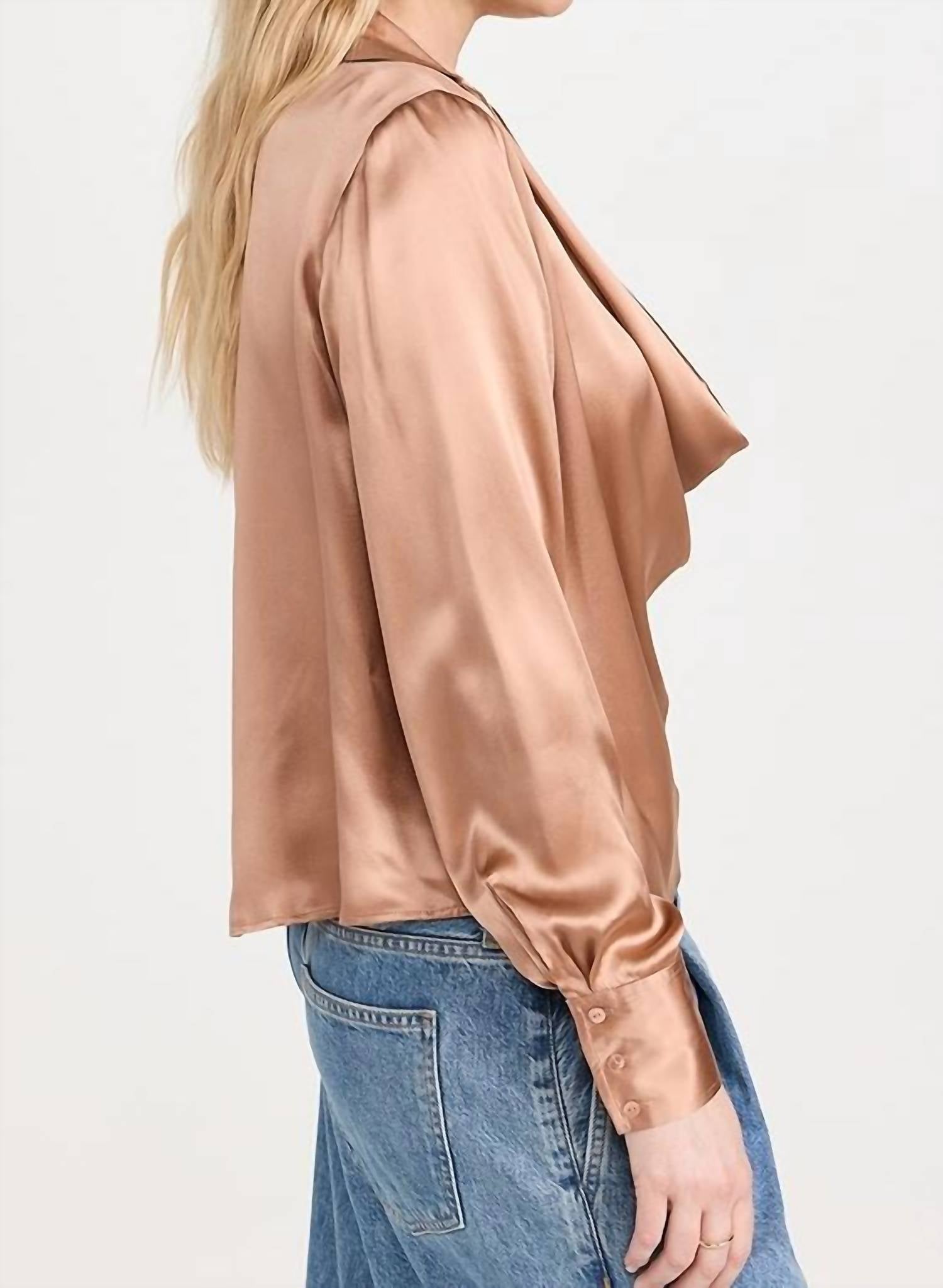 A versatile blouse that works from desk to dinner! Introducing the Lotus Cowl Neck Top by L'Agence, a sophisticated blouse crafted for evening elegance in a rich mocha hue. Featuring long sleeves, this luxurious piece is made entirely from silk, offering an exquisite drape through its silk charmeuse fabrication. The blouse is crafted with a polished collar and an extended three-button cuff, enhancing its sartorial finesse. Closure: Pull-on. Care: Dry clean only.