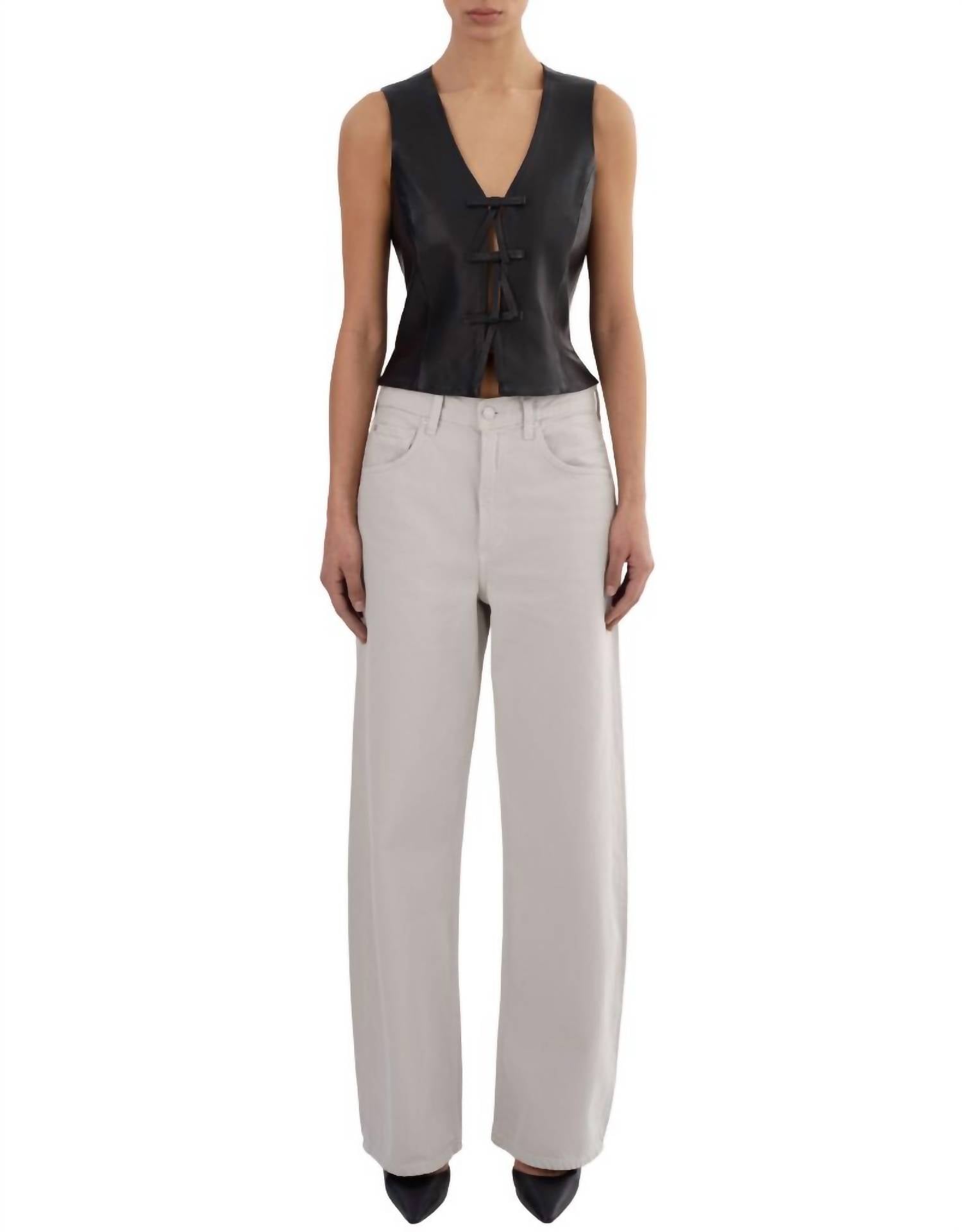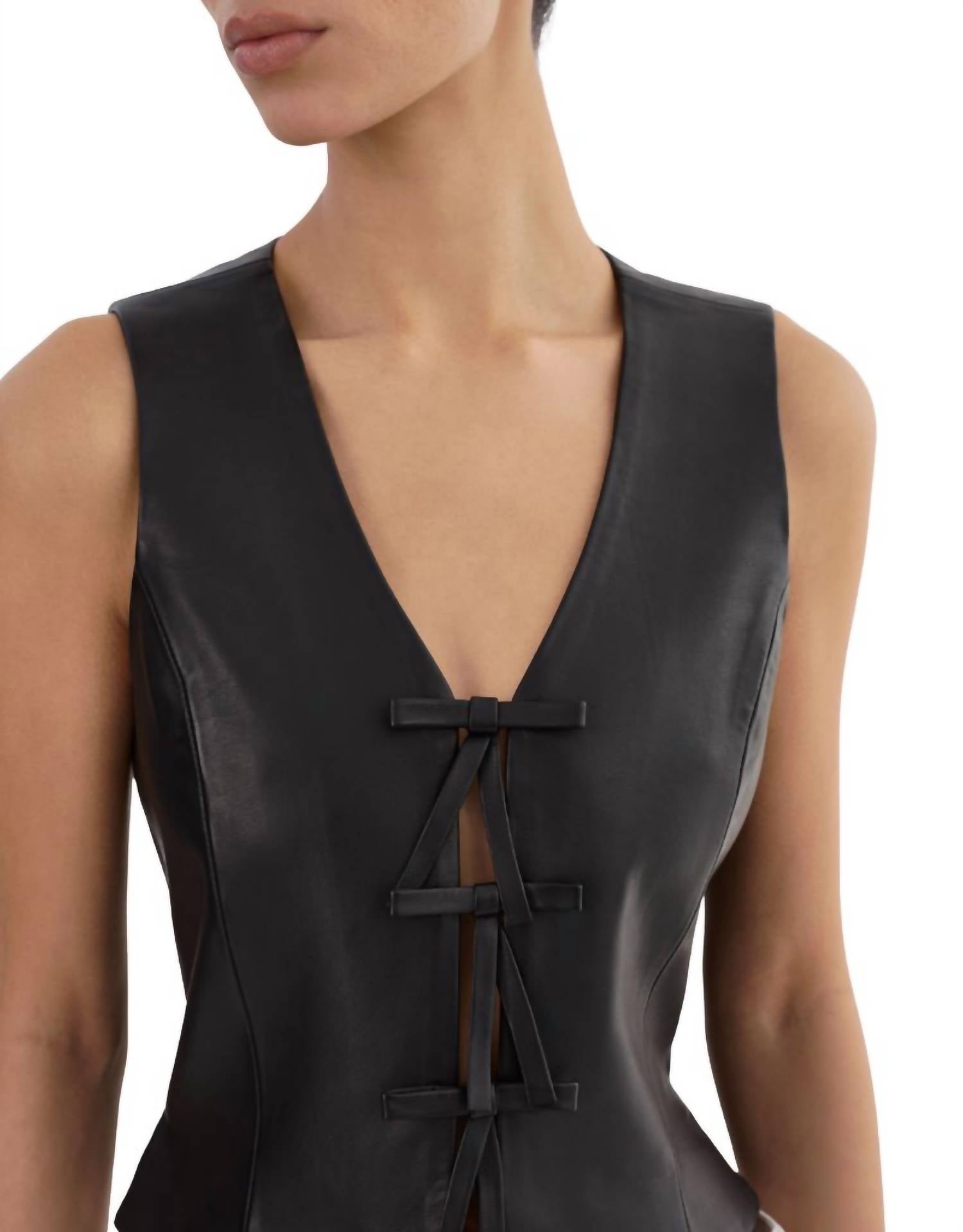 A versatile blouse that works from desk to dinner! Introducing the BASTINA Leather Bow Top by LAMARQUE, a sleek and daring piece that effortlessly commands attention. This sleeveless blouse is crafted from textured leather in classic black, featuring a striking plunging V-neckline and delicate bow closures. Highlighting your waist with subtle tailoring, it's the perfect blend of refined and bold style. Closure: Zip closure.