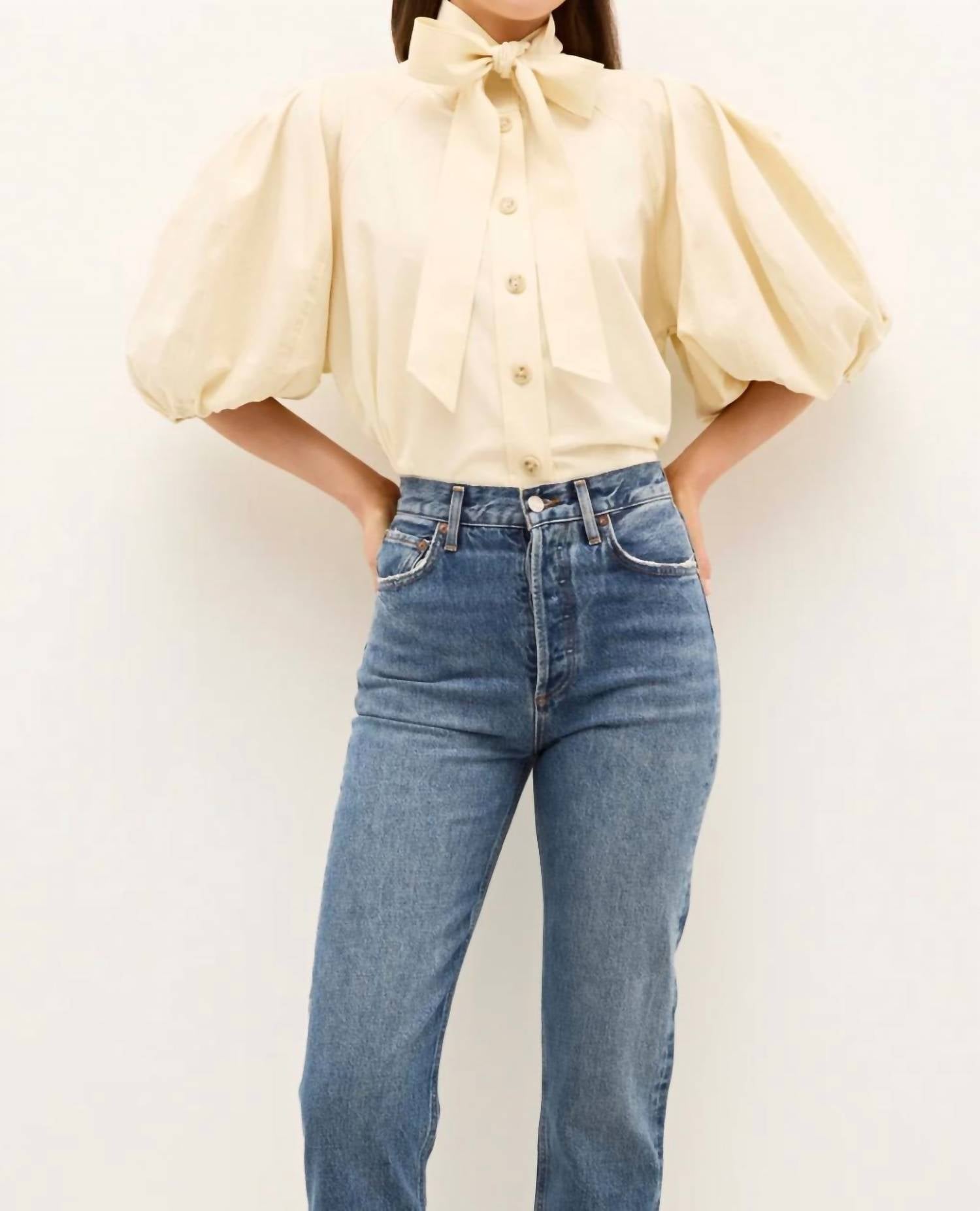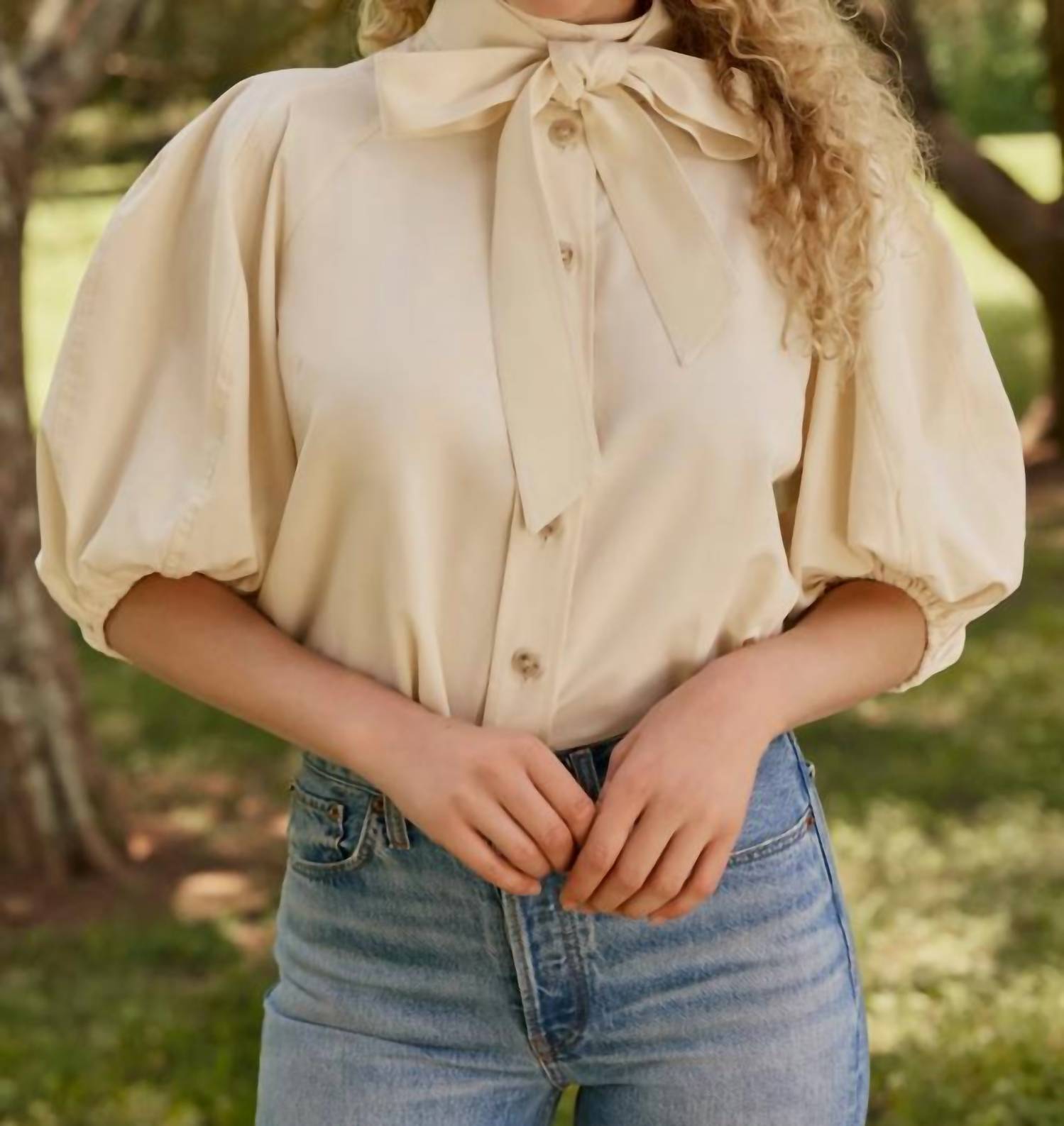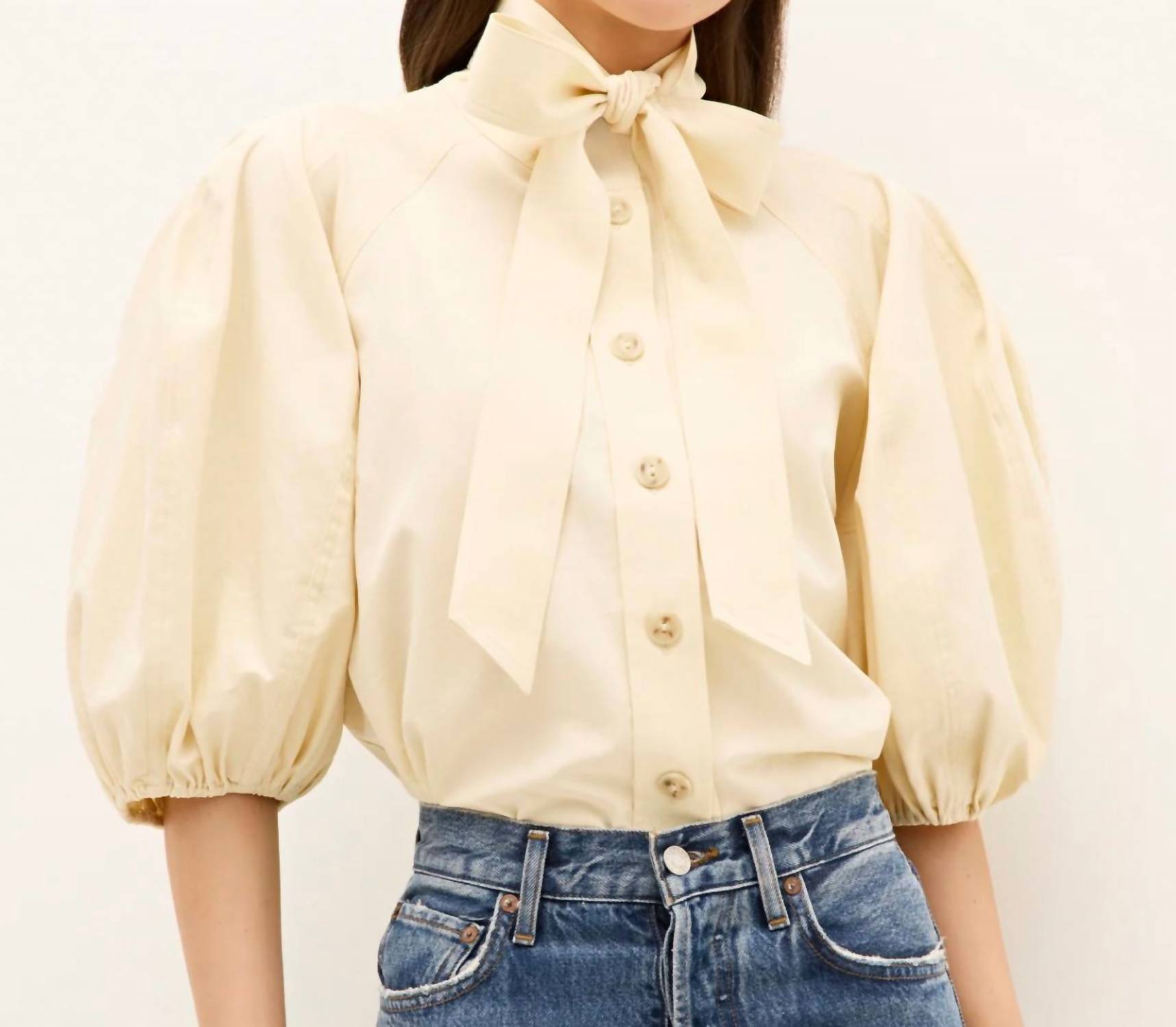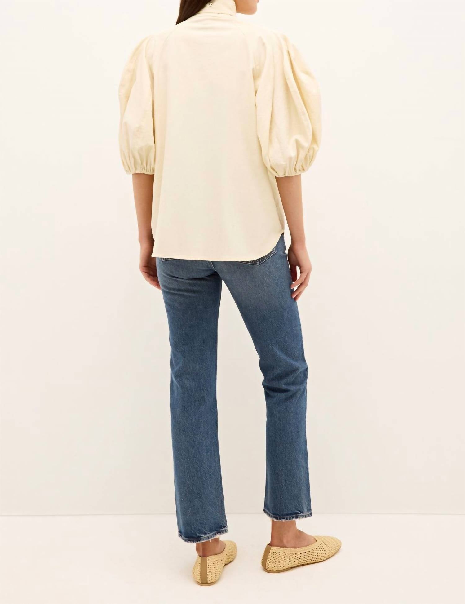 A versatile blouse that works from desk to dinner! Introducing the Navi Top by Marie Oliver in an elegant turtledove shade, perfect for elevating your off-duty ensemble. With elbow-length dramatically puffed sleeves and a refined mockneck featuring an optional neck tie, this piece combines femininity with versatile style. Composition: 94% Lyocell, 6% Polyamide, adorned with delicate stitch detailing along the shoulder and a button-front placket. Care: Machine wash on a gentle cycle and hang dry, or opt for dry cleaning for longevity.