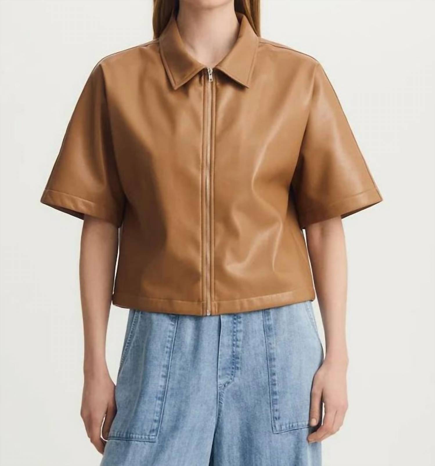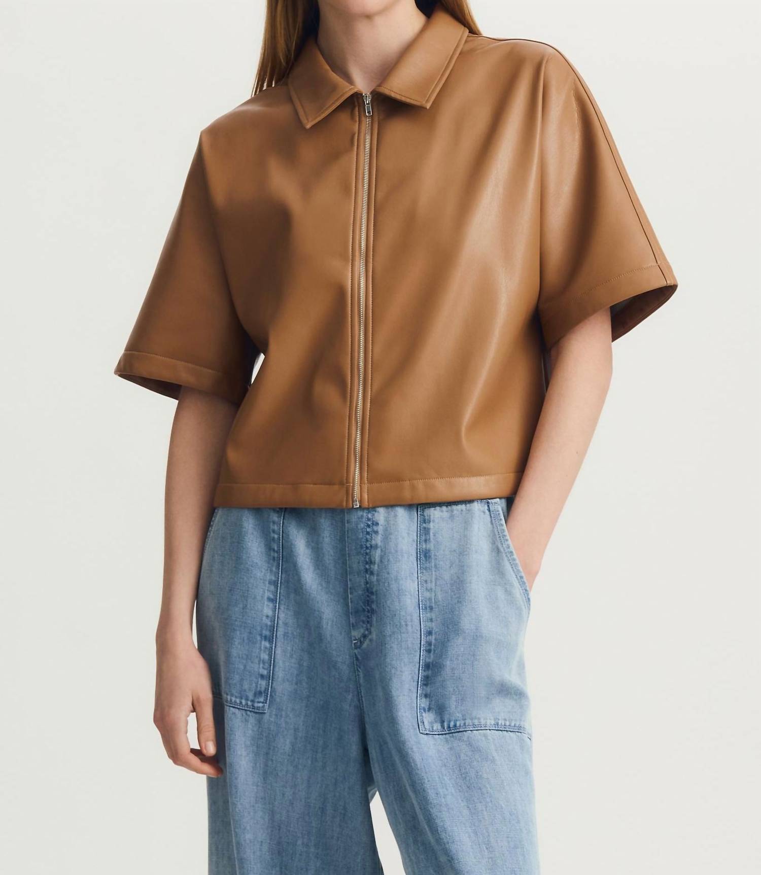 A versatile blouse that works from desk to dinner! Introducing the Anaia Top by MELISSA NEPTON, a striking addition to elevate your look with bold amber tones. This women's vest top features short sleeves and a structured design crafted from 100% vegan faux leather, adding a modern edge to any ensemble. Closure: Zip closure ensures a sleek silhouette. Perfect for minimalist holiday parties, this piece encapsulates both utility and style for a standout impression.
