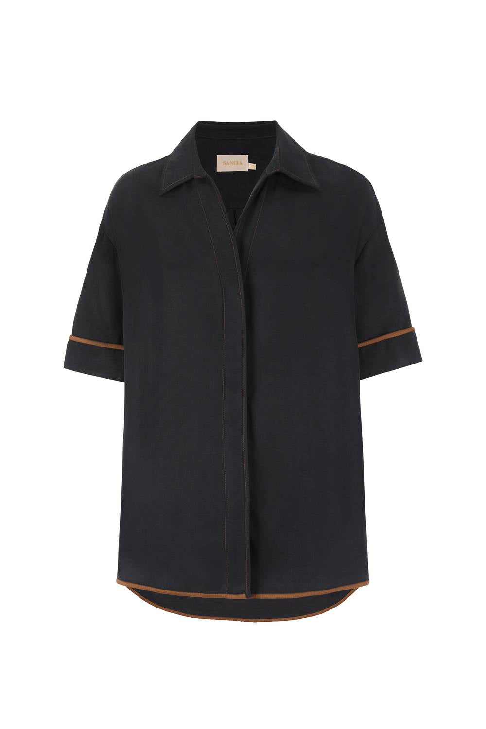 A classic button down shirt that will never go out of style. Meet the Sancia Khoen Shirt, a perfect blend of style and comfort in the captivating Eclipse hue. This short sleeve button-down features a relaxed fit and a distinctive long back hemline, accentuated by contrast binding and embroidery. Crafted from 100% Lyocell, it offers a luxurious feel and is best worn with Tansy Pants for a coordinated look. Care involves gentle hand washing in cold water, line drying in the shade, and warm ironing if needed. Model is wearing a size XS, and the shirt measures 72cm from shoulder to hem.