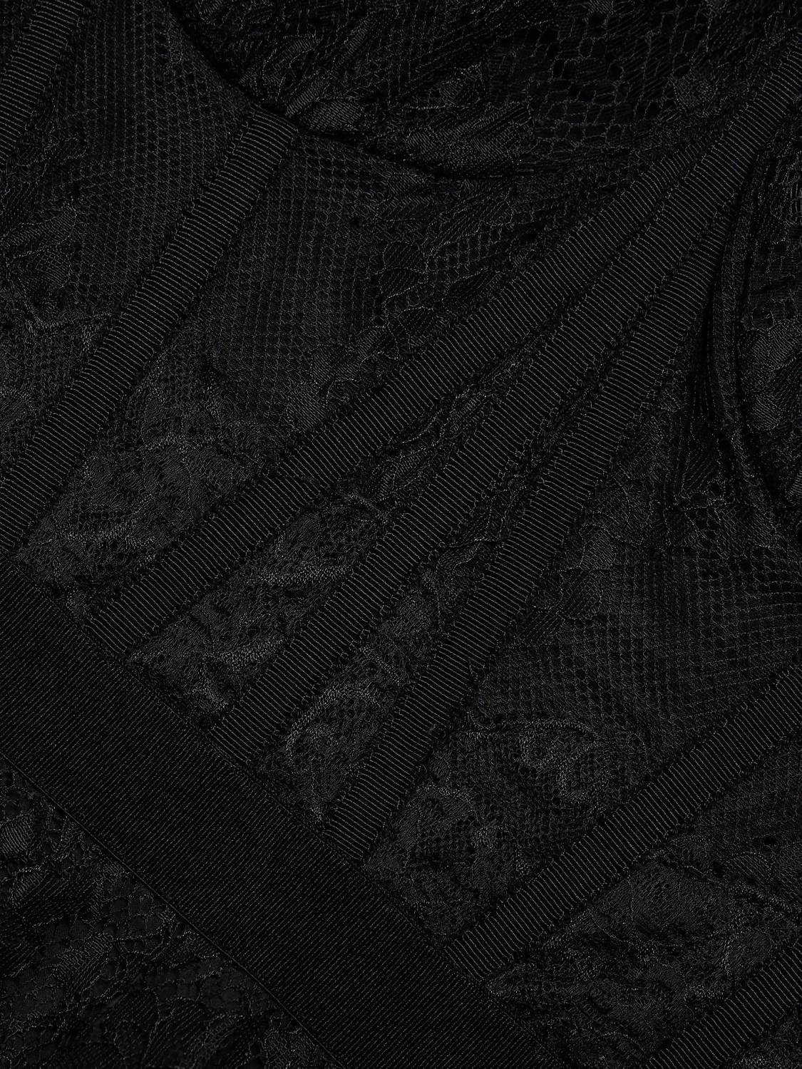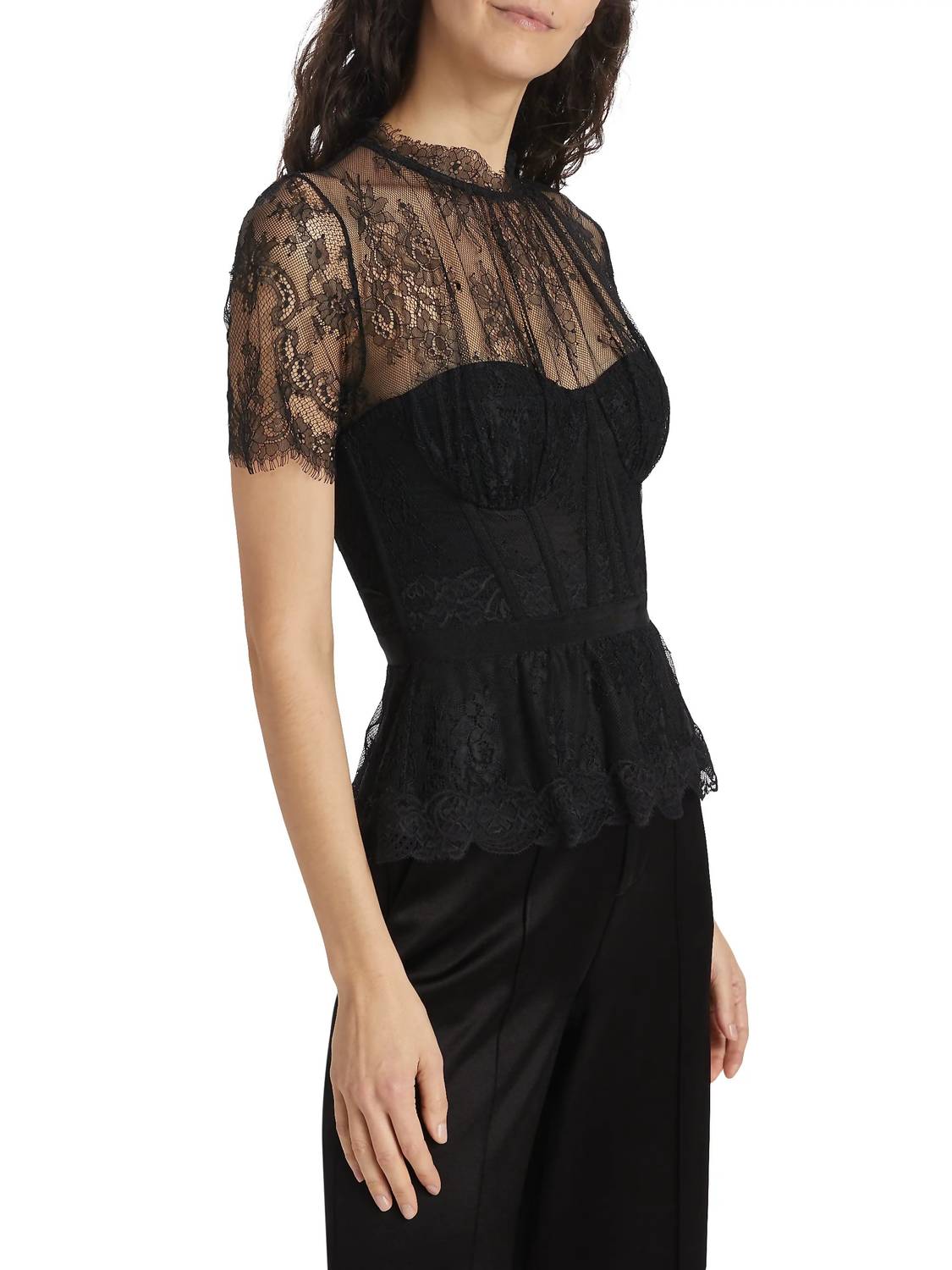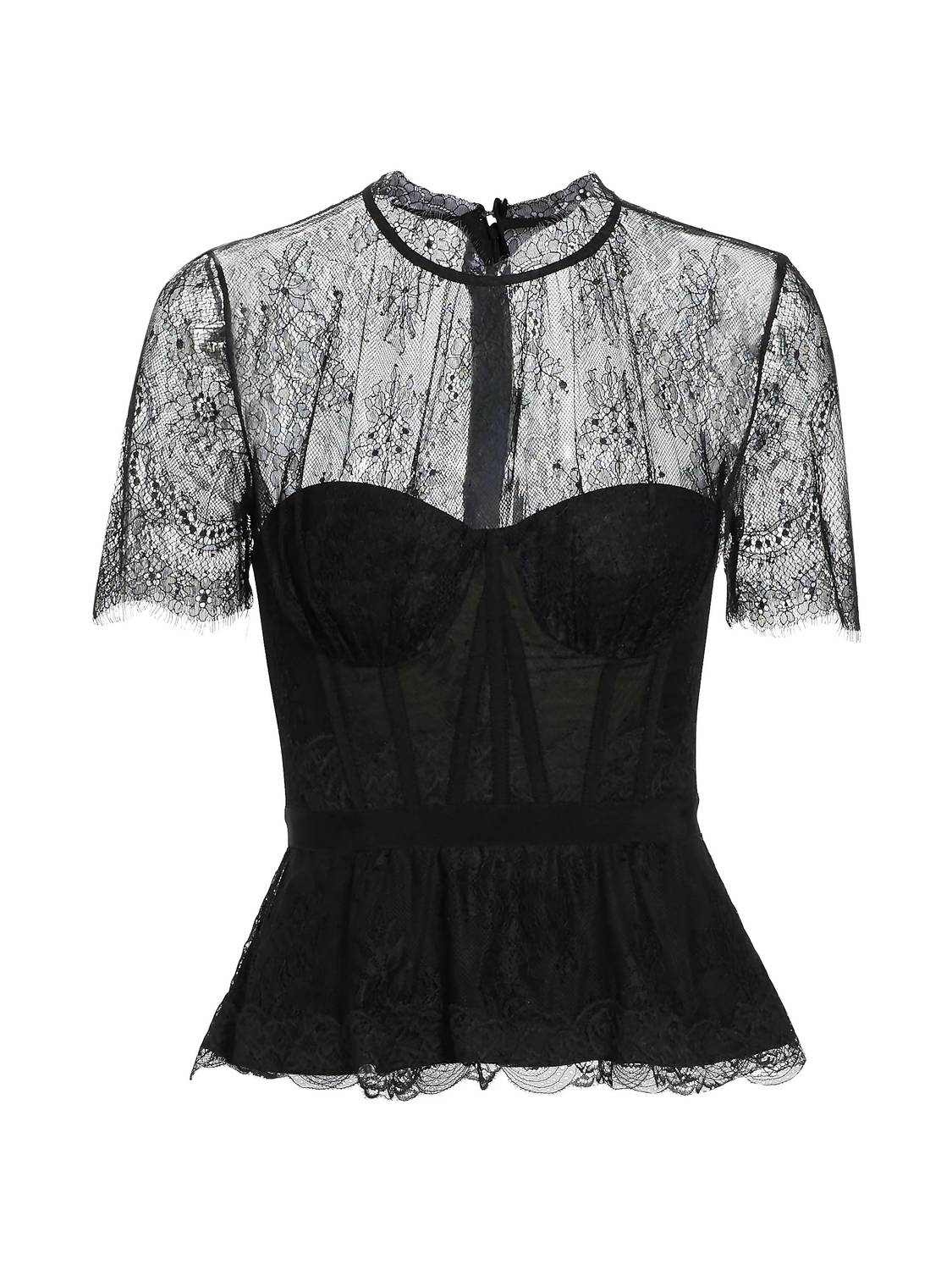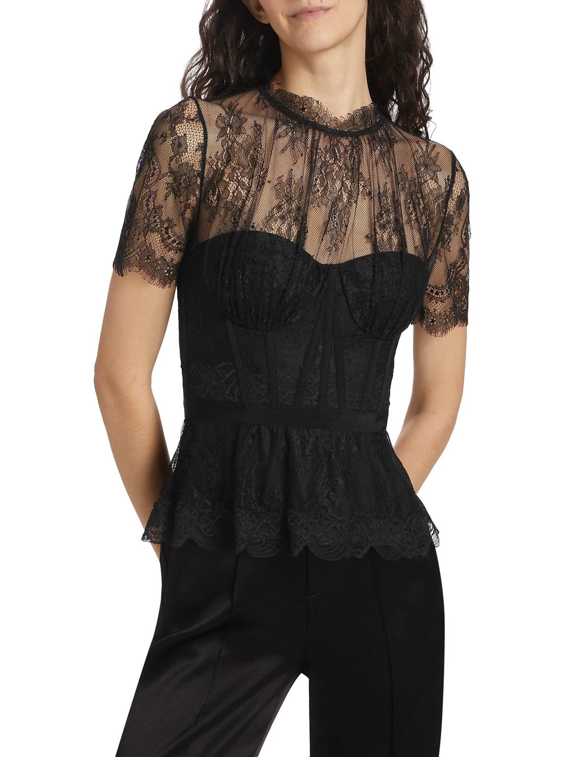 A timeless blouse that will never go out of style. Introducing the Kehlani Lace Bustier Top by SIMKHAI, a luxurious choice for your next evening event. This vintage-inspired blouse features short sleeves and a round neck, intricately crafted from floral lace with a structured bustier bodice. Made from 100% nylon with delicate scalloped trim, this piece includes a concealed back zip closure for a seamless fit.