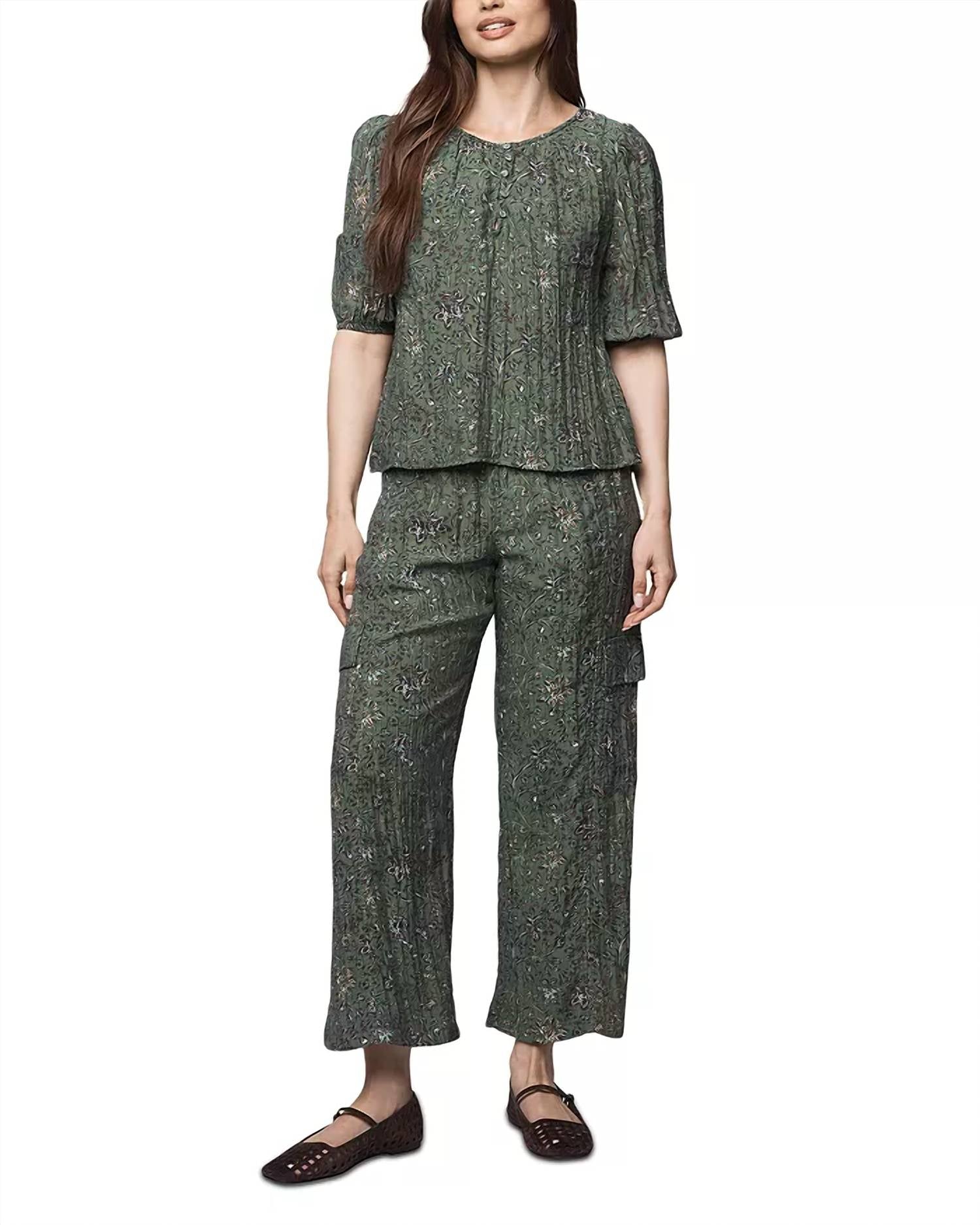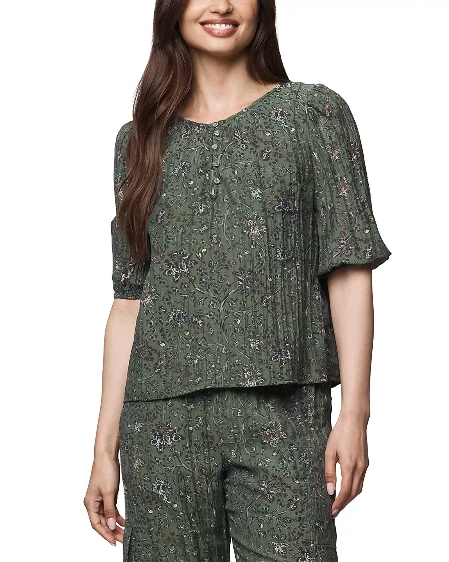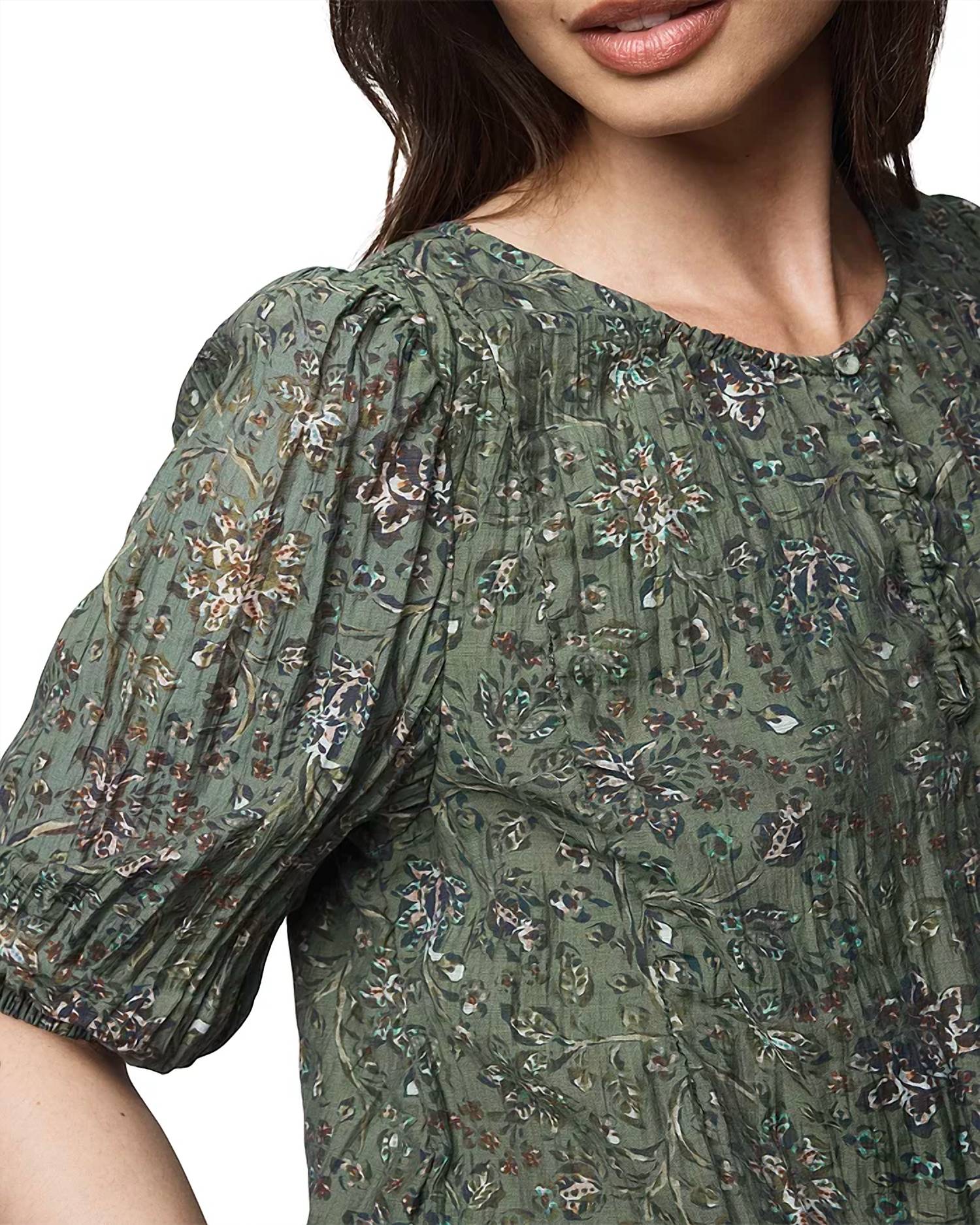 A versatile blouse that works from desk to dinner! Elevate your spring wardrobe with the Splendid Versailles Floral Top, a stylish addition in a vibrant Vine hue. This blouse features a crewneck and short puff sleeves, creating a relaxed fit that hits at the hip. Crafted from 68% Lyocell and 32% Nylon with a 100% Viscose lining, it's a testament to comfort and quality. Designed with a front quarter button placket, it offers both functionality and flair. Care: Machine wash. Imported.