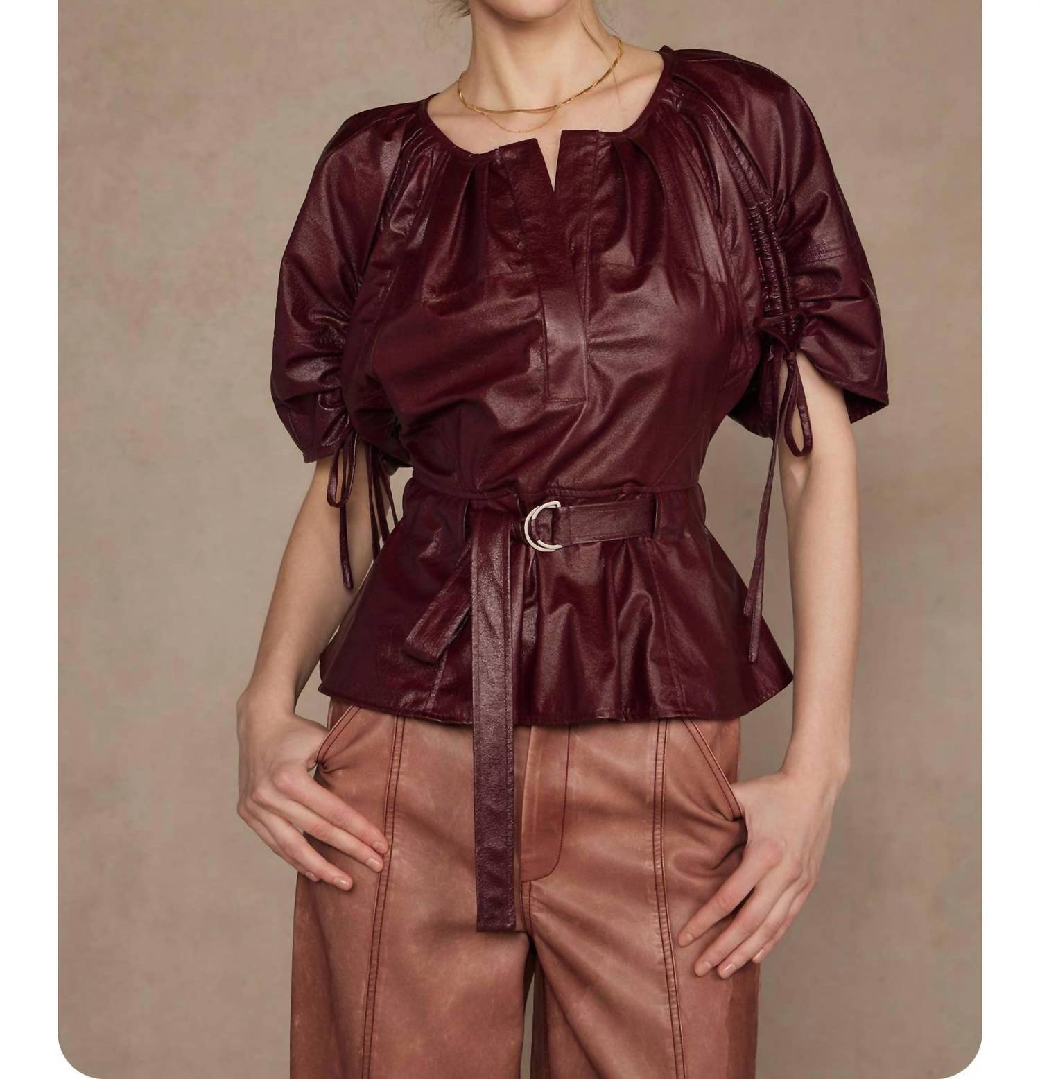 A timeless blouse that will never go out of style. Make a statement at your next event with the Puff Sleeve Faux Leather Top by Strut & Bolt in a rich burgundy hue. This stunning women's blouse features cinched puff short sleeves with an adjustable drawstring and button detailing, complemented by a soft peplum hemline. Crafted from solid faux leather, it’s designed with a belted waist for a flattering fit and a scoopneck for added elegance. Closure: Tie closure. Care: Dry clean only.