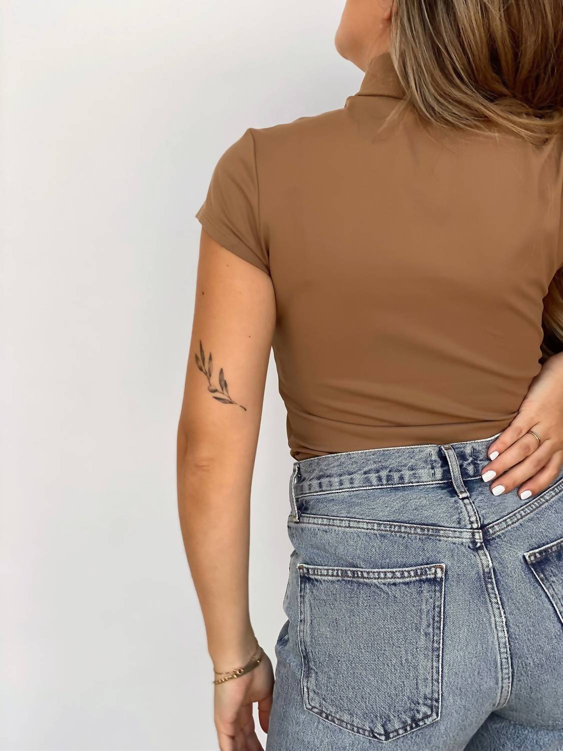 Pair this with your favorite jeans and slides for your next girls night out. Discover effortless style with the Susana Monaco Short Sleeve Mock Neck Top in Toasted Almond. This women's top features a flattering mock neck and cap sleeves, crafted from a stretchy mid-weight jersey fabric composed of 86% nylon and 14% spandex. Made in the USA, it sports a pull-on closure for easy wear. Care instructions include machine washing on a delicate cycle and laying flat to dry, ensuring longevity and maintaining its sleek silhouette. The model is 5'3" and wears a size small.