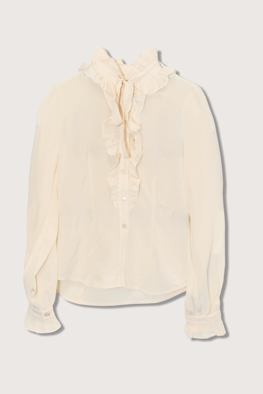 A versatile blouse that works from desk to dinner! Elevate your fall wardrobe with the Catroux Silk Blouse by Ulla Johnson, artfully crafted in luxurious pearl silk crepe de chine. This design features long sleeves with button cuffs and a mockneck adorned with neckties, finished with mother-of-pearl buttons through the front. Composition: 100% Silk. Care: Hand wash only. Model is 5'10" and the blouse is designed for a slightly loose fit, making it ideal for preppy vacation occasions.
