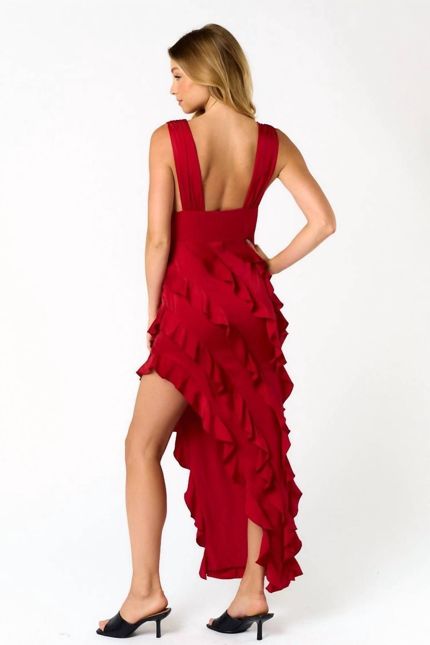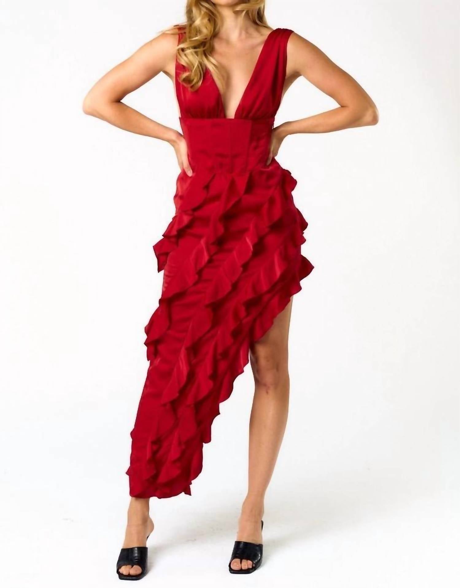Style this maxi with your favorite statement necklace and sandals for the perfect look. Step into elegance with the Blue Blush Ruffle Corset Maxi Dress in a striking red, designed for special occasions like a dinner party. This sleeveless dress features a plunge V-neckline and an exquisite ruffle skirt with an asymmetrical hem, embodying a sophisticated A-line silhouette. Crafted with self: 100% polyester and lining: 97% polyester, 3% spandex, it boasts a side zipper closure for a seamless fit. For care, it's best to hand wash cold, avoid bleach, line dry, and low iron if needed. Model is 5'10" and wearing a size M.