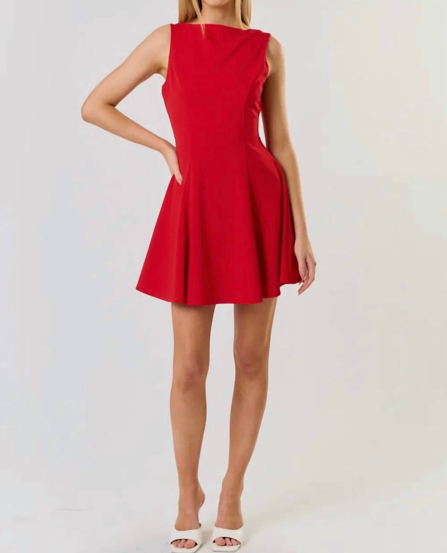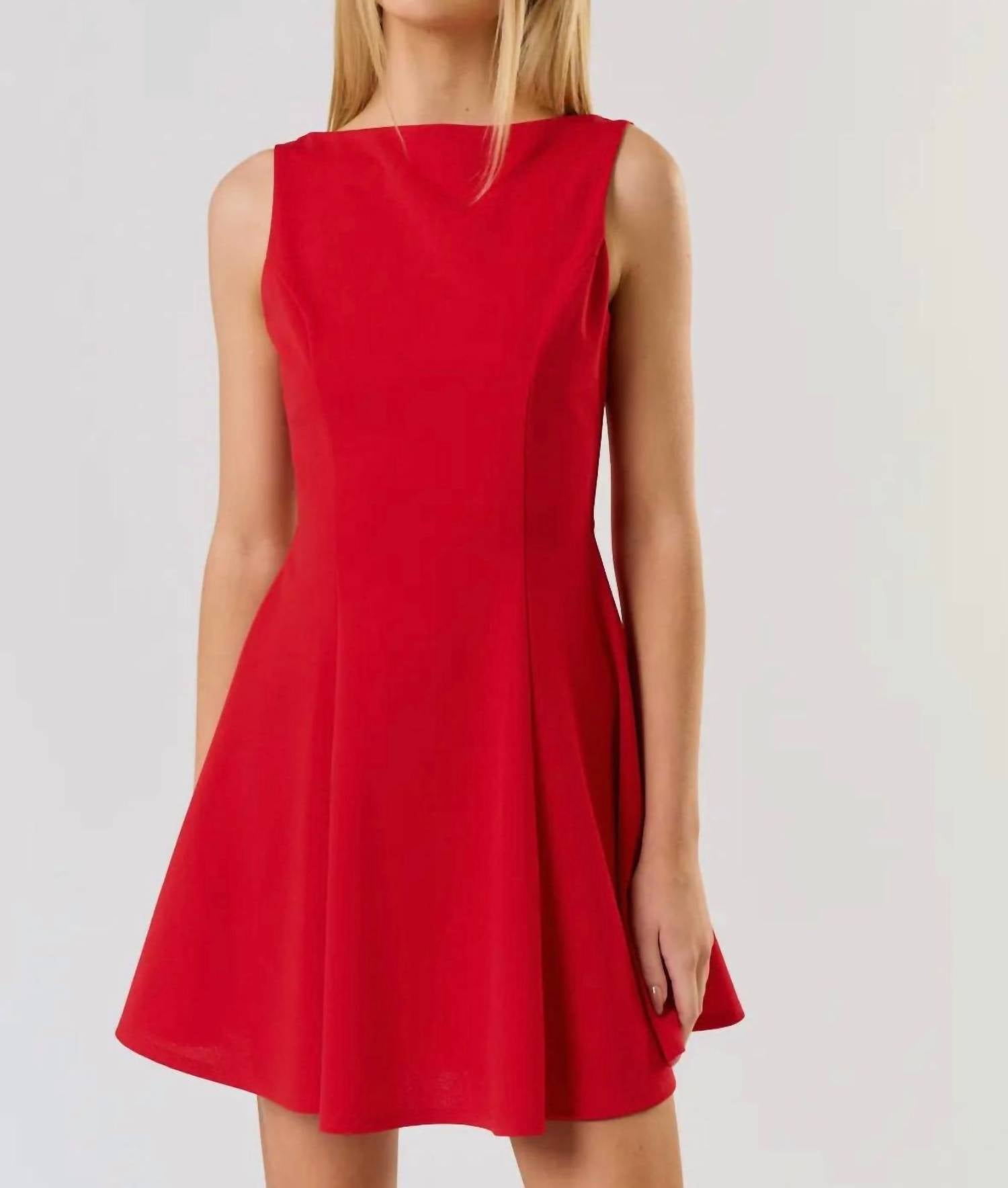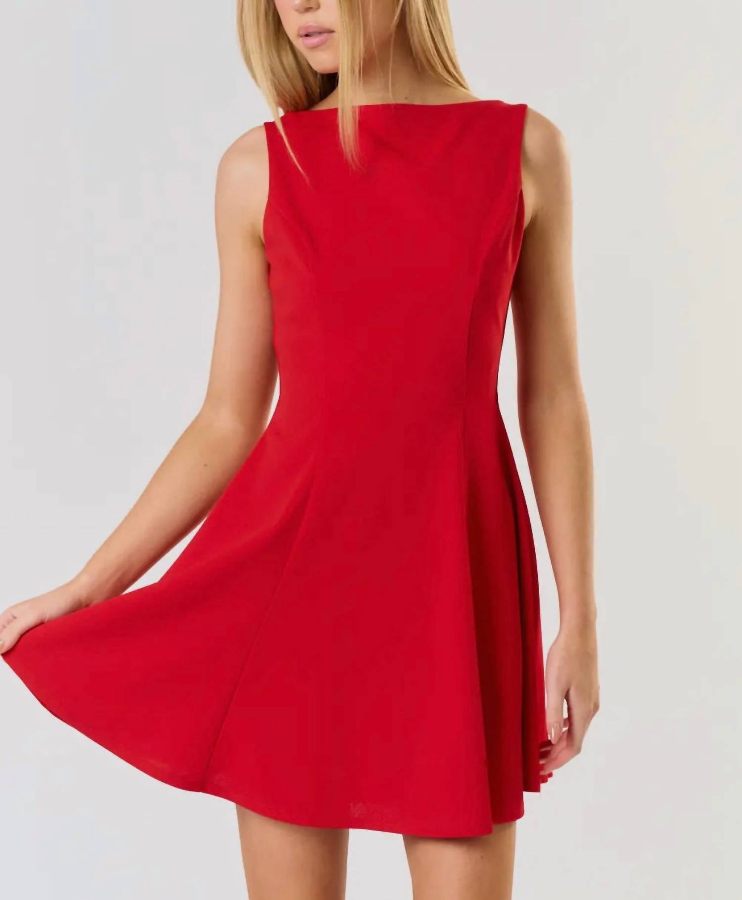 The kind of easy and flattering dress you'll be reaching for all season long. Meet the Rachel Low Back Skater Mini Dress by Blue Blush, a sleeveless piece crafted from 100% polyester for a chic, contemporary feel. Its boat neckline adds a touch of sophistication, while the zip closure ensures a secure fit. Perfect for a dinner party or spring outing, this A-line mini dress embodies the Y2K trend in a bold red hue. Care: Machine wash only. Model is 5'10" and wearing a small. Available in sizes small, medium, and large.