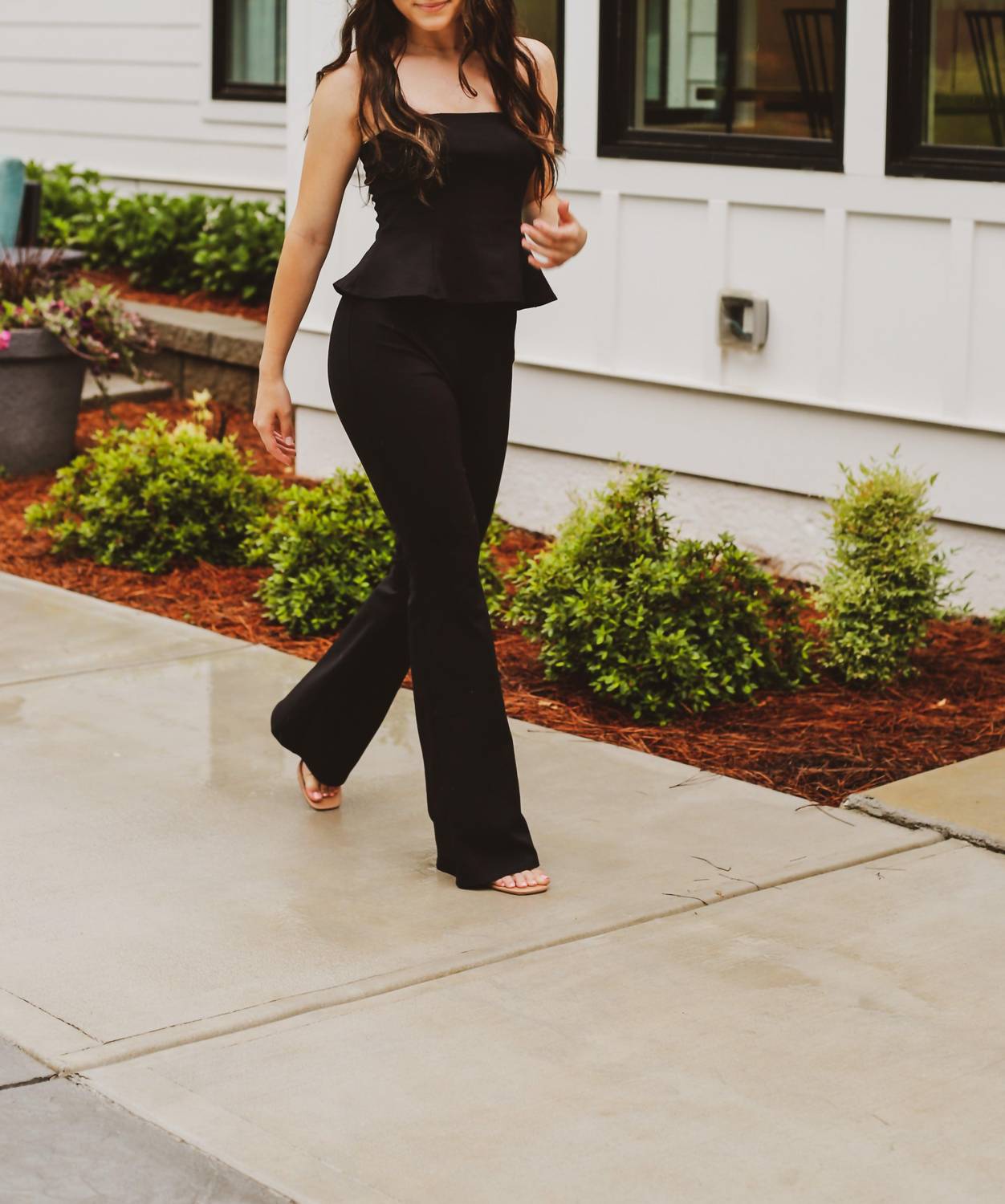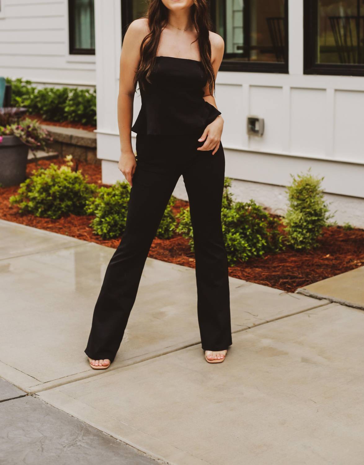 This set features an elastic flared top with a strapless design and pull-on full-length pants.