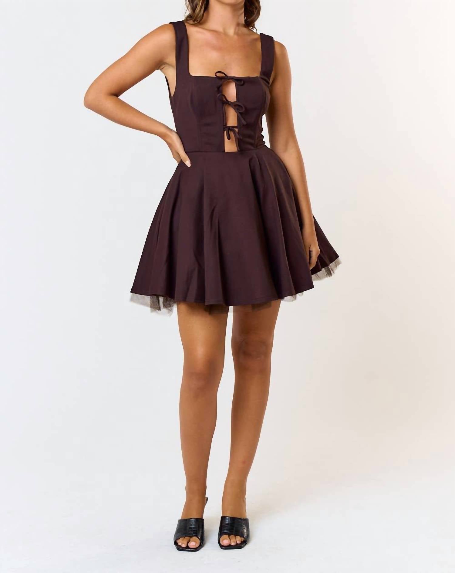 The perfect mini dress for those warmer months. Embrace minimalist elegance with the Tie Front Square Neck Flared Mini Dress by Blue Blush, perfect for your next holiday party. This sleeveless, solid brown mini dress features an A-line silhouette and a sophisticated square neckline. Crafted from durable polyester, it offers a pull-on closure for ease and comfort. Ideal for the spring season and special Thanksgiving occasions.