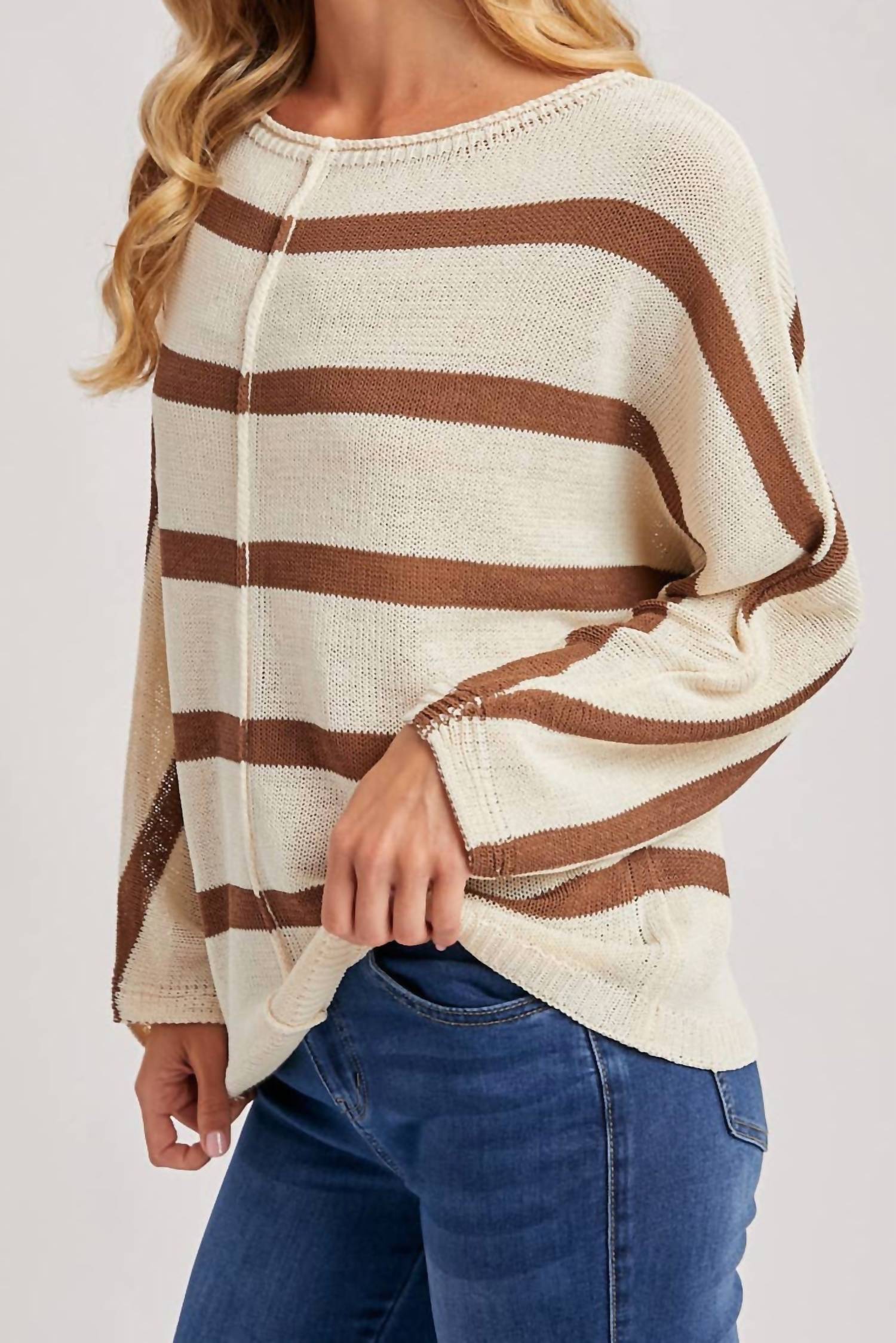 Experience the perfect blend of comfort and style with this trendy crew neck sweater, designed to effortlessly elevate your wardrobe. Pair it with your favorite denim and loafers for the perfect look. The BluIvy Lightweight Cozy Sleeve Sweater in Coco Stripe offers a charming blend of comfort and style with its long sleeves and distinctive striped pattern. Its lightly knit fabric is emphasized by horizontal stripes and complemented by diagonal stripes on the sleeves, creating a playful yet polished look. With a boatneck design and a relaxed, slightly oversized fit, this sweater delivers an effortlessly chic minimalist aesthetic. The pull-on closure ensures ease, making it an ideal choice for a casual dinner party this fall.