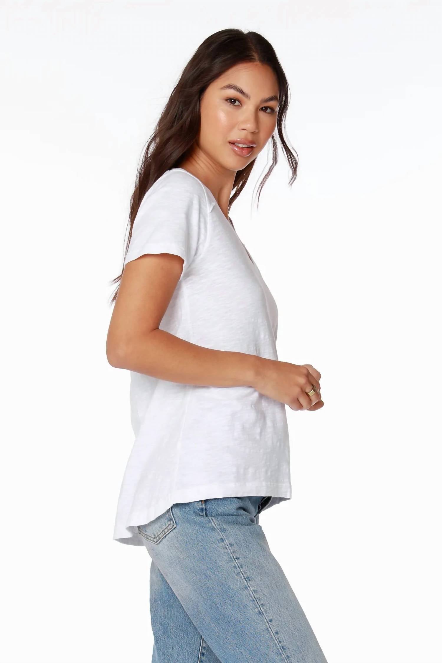 Look no further, you just found your perfect tee! Discover effortless style with the Shoulder Seam V Neck Tee by bobi, a minimalist essential with a chic high-low hem and raw edge shoulder seams. Crafted from 100% cotton in a slubbed jersey finish, this short-sleeve tee offers comfort and breathability. Garment Length: 24"/26". Closure: Pull On. Care: Machine wash. Model is wearing a size small.