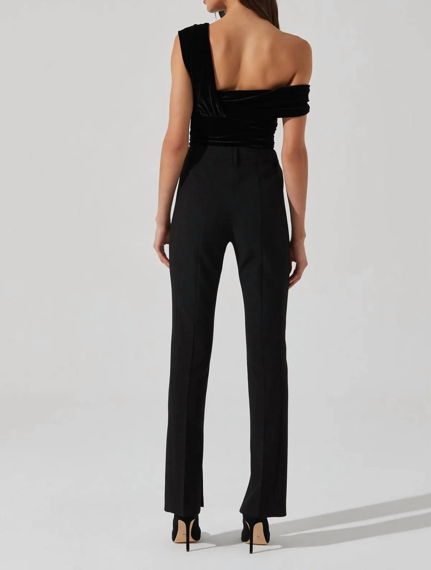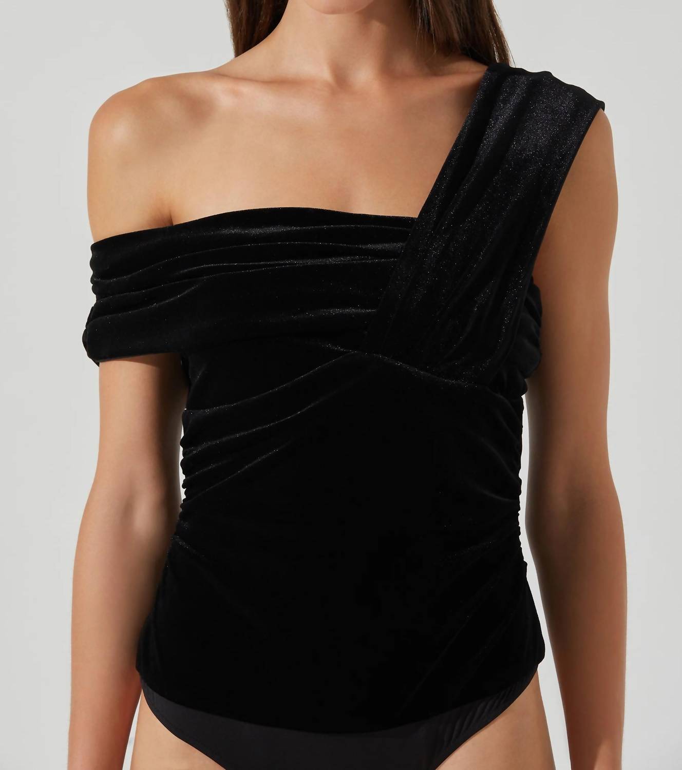 Form fitting and comfortable - this bodysuit check all of the boxes. Introducing the Nera Bodysuit by ASTR, a stunning off-shoulder piece designed to captivate in solid black. This sleeveless bodysuit features elegant gathering on both sides with a crossover strap detail for a chic silhouette. Crafted with a composition of 92% Polyester and 8% Elastane for the self, and lined with 90% Polyester and 10% Elastane, it ensures a comfortable fit. Closure: Side zipper and snap closure at the bottom. Care: Dry clean only. Model wears a size S with measurements of 28" length and 30.5" bust, standing at 5'10".