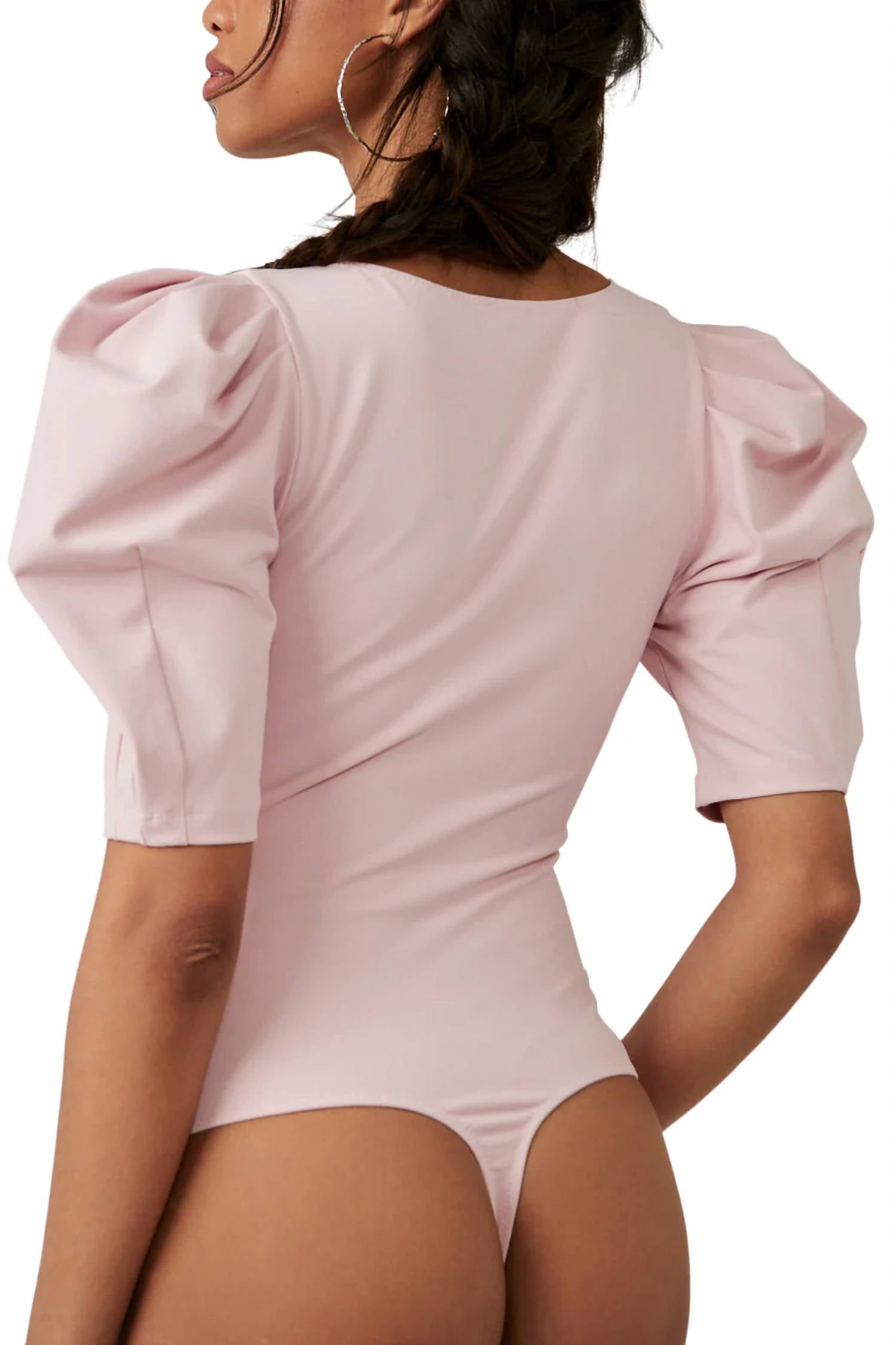 Form fitting and comfortable - this bodysuit check all of the boxes. Delicate soft pink formfitting piece. Features short statement puff sleeves with pleated details and a deep V-neckline, enhancing your silhouette. With a snap closure and high-cut thong bottom. Offers both style and comfort. Crafted from 88% nylon and 12% spandex. Designed to support wear with or without a bra. Hand wash cold inside out, use non-chlorine bleach if needed, line dry, and cool iron on reverse side if needed.