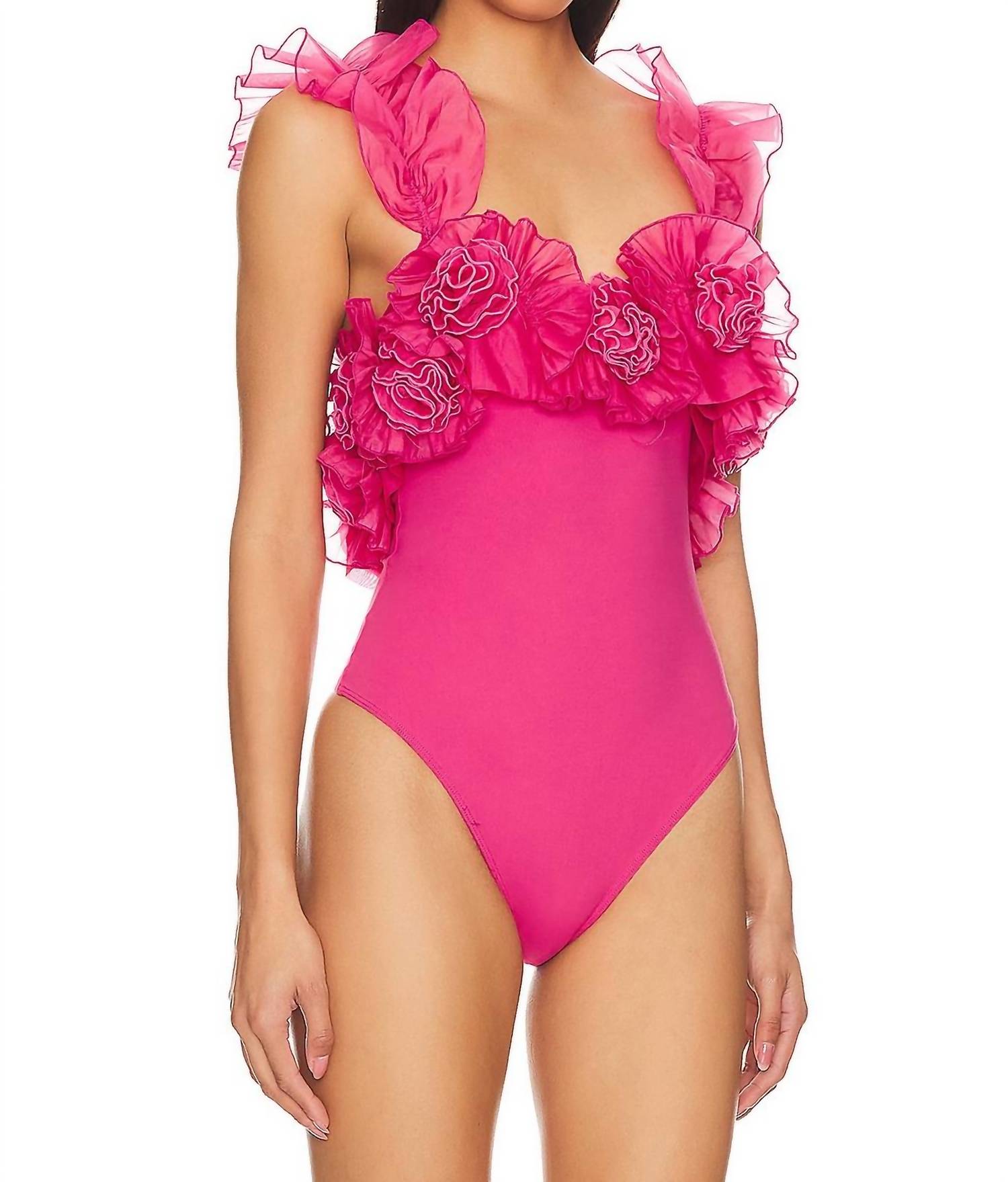 Pair this number with your favorite high-waisted jeans. Discover the Until Next Time Bodysuit by Free People in a captivating Raspberry hue, designed to captivate with its playful flair. This sleeveless bodysuit combines a self composition of 88% nylon and 12% spandex with a contrast of 100% polyester. Made in China, it features a gusset snap button closure and a stretch jersey fabric bodice complemented by ruffled chiffon shoulder straps with rosette trim. For care, simply hand wash to maintain the garment's vibrant look and feel.
