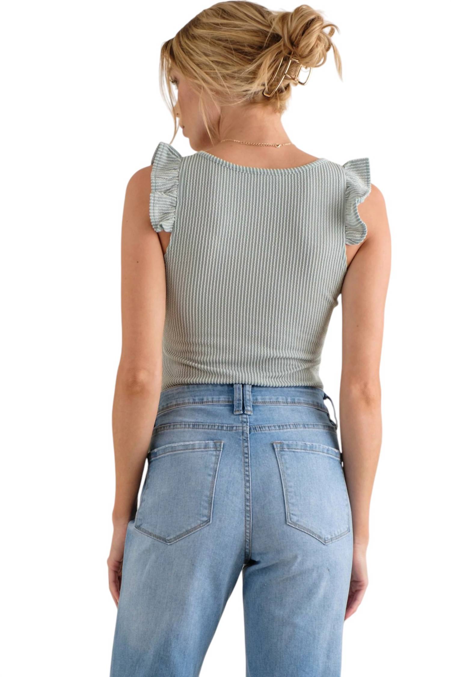 This bodysuit features a textured ribbed material and flutter sleeves, designed in a sleeveless style. Made from 100% polyester.