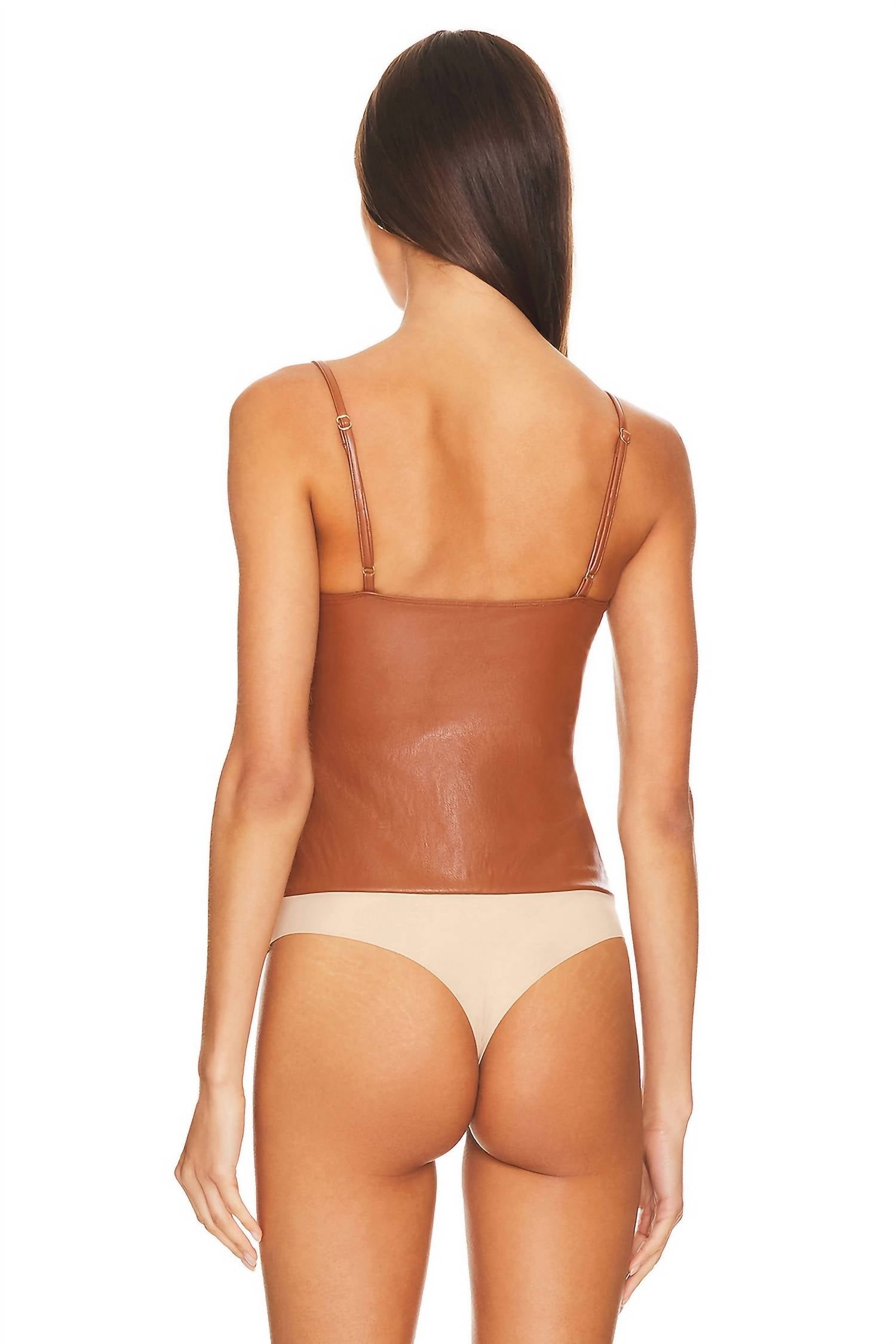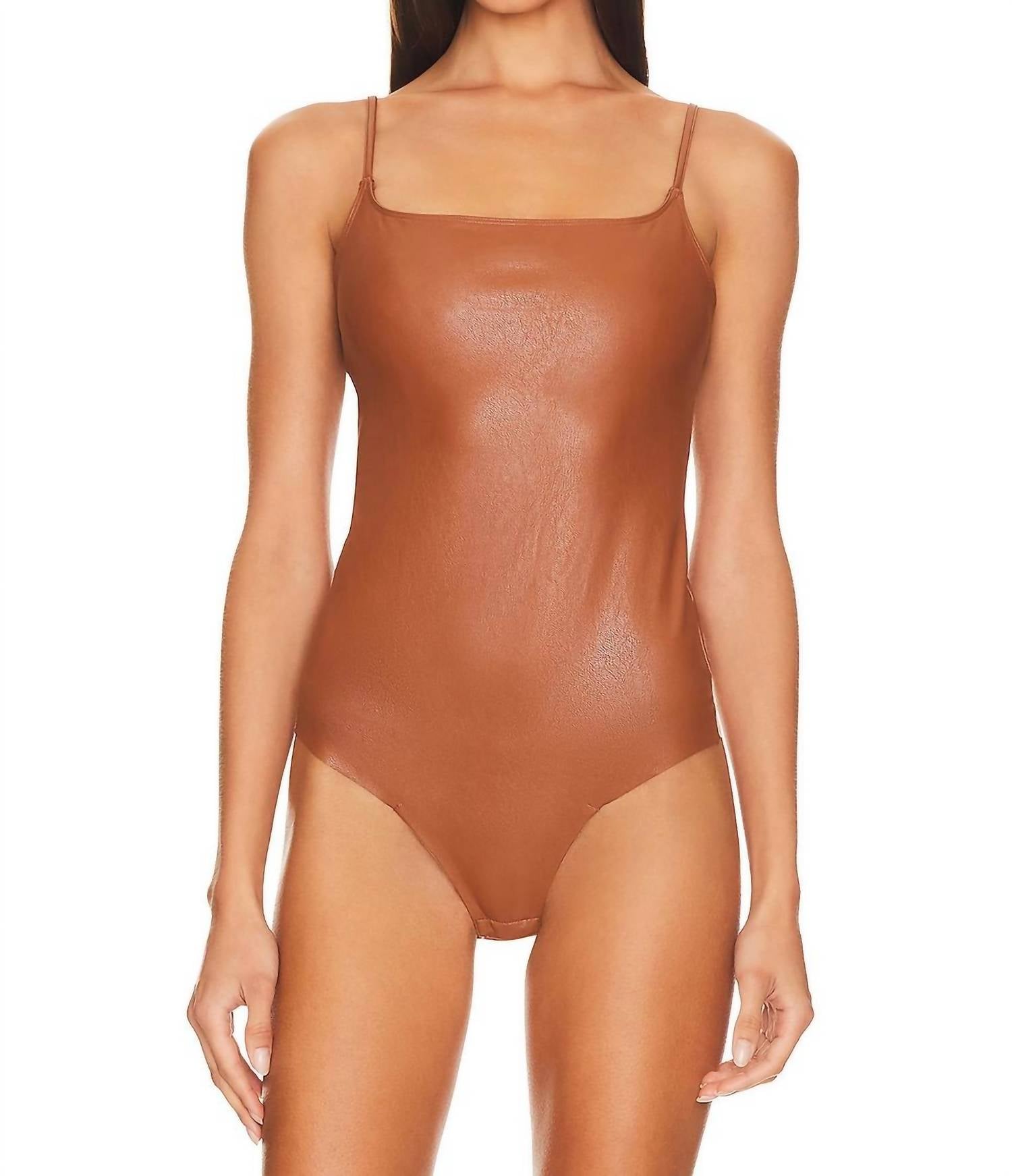 Who doesn't love a good bodysuit? Elevate your vacation style with the Faux Leather Cami Bodysuit by Commando, offering sleek sophistication in a solid lavender hue. This bodysuit features spaghetti straps and a trendy squareneck, crafted from a luxurious faux leather blend (55% polyurethane, 44% viscose, 1% elastane) with four-way stretch for a real leather look and feel. The signature raw-cut thong bottom (78% nylon, 22% elastane) ensures a seamless fit, while the gusset (86% cotton, 14% Lycra) adds comfort. Closure is achieved with a tie, and care is easy with machine wash instructions.