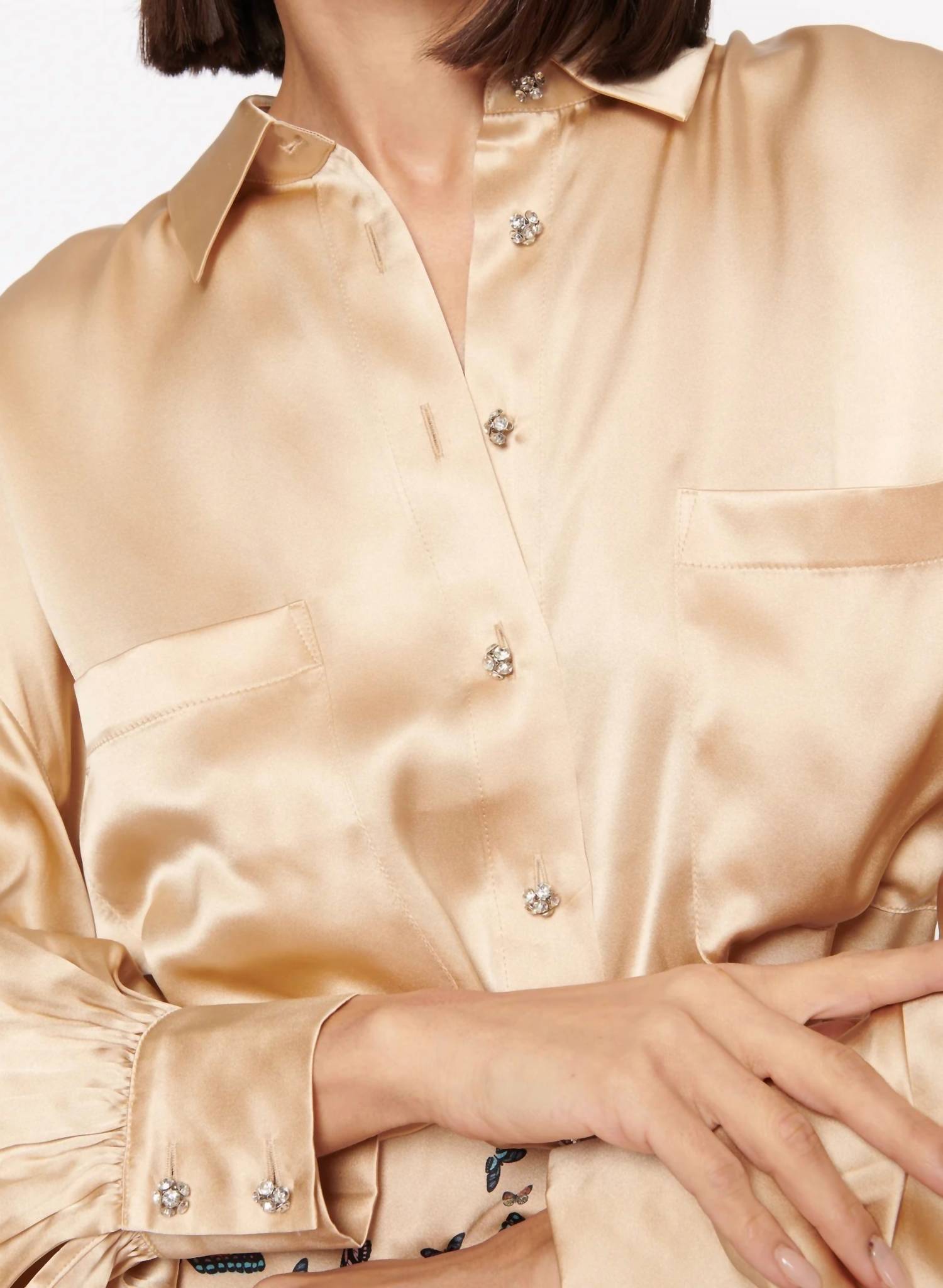 Who doesn't love a good bodysuit? Bodysuit is constructed from a glossy silk charmeuse and is a versatile and effortless fit. This collared bodysuit is a drop shoulder, long sleeved silhouette, featuring a functional center-front placket with crystal buttons. The Belkis Charmeuse Bodysuit is finished with functional wrist-cuffs and front patch pockets. True to size. Cheeky bottom. Models wear size XS. Dry Clean & Steam Only.