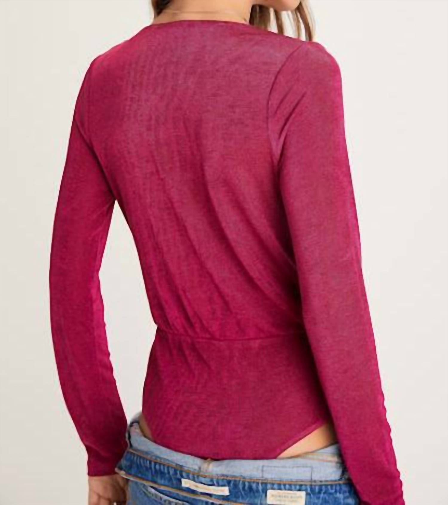 Pair this number with your favorite high-waisted jeans. Introducing the Free People Turnt Long Sleeve V-neck Bodysuit in Dark Rhubarb, perfect for any minimalist wardrobe. Made from 98% Polyester, 2% Elastane this chic bodysuit showcases a plunging V-neckline and stylish pleating, with a body-hugging fit from its sheer lace cheeky undies. Features long sleeves and pull-on closure for ease and comfort. Length: 31.25 inches, Sleeve Length: 23.75 inches, Bust: 46.5 inches. Care: Machine wash cold and line dry.
