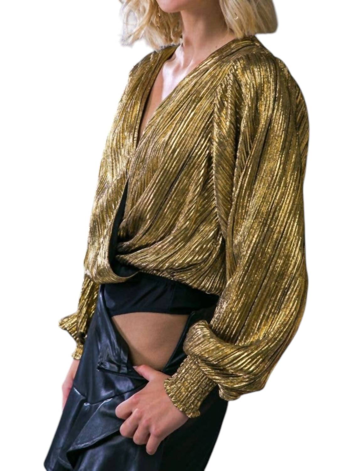 Gold Foiled Plisse Bodysuit. Features a surplice neckline and long blouson sleeves with smocked cuffs. Mesh bikini bottom with snap closure for convenience. Made from 100% polyester with a 95% nylon and 5% spandex lining