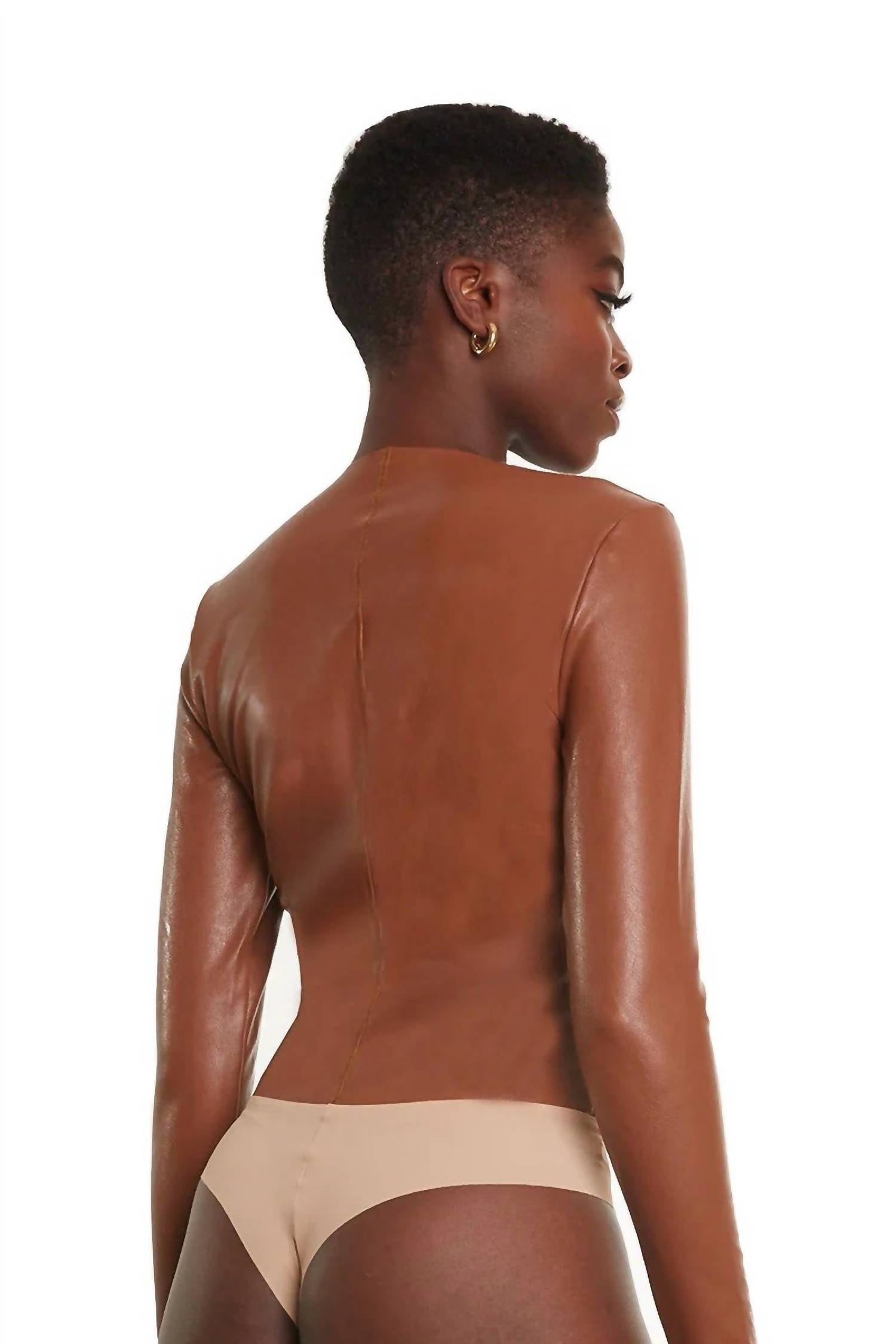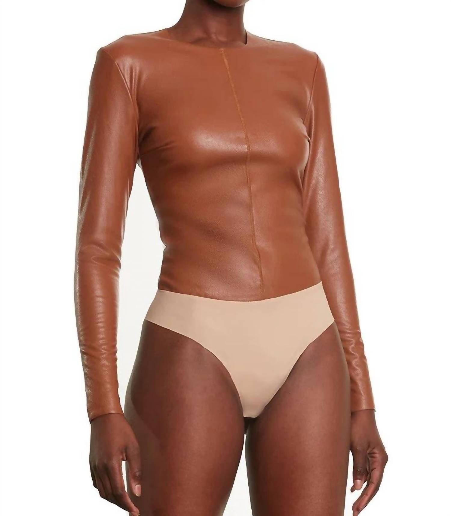 Four-way stretch faux leather body (55% polyurethane, 44% viscose, 1% elastane). Signature Raw-Cut Thong Bottom (78% nylon, 22% elastane), Gusset (86% cotton, 14% lycra). Fit-tested by real women. Real leather. Firming fabric with light compression. Raw-cut edges.