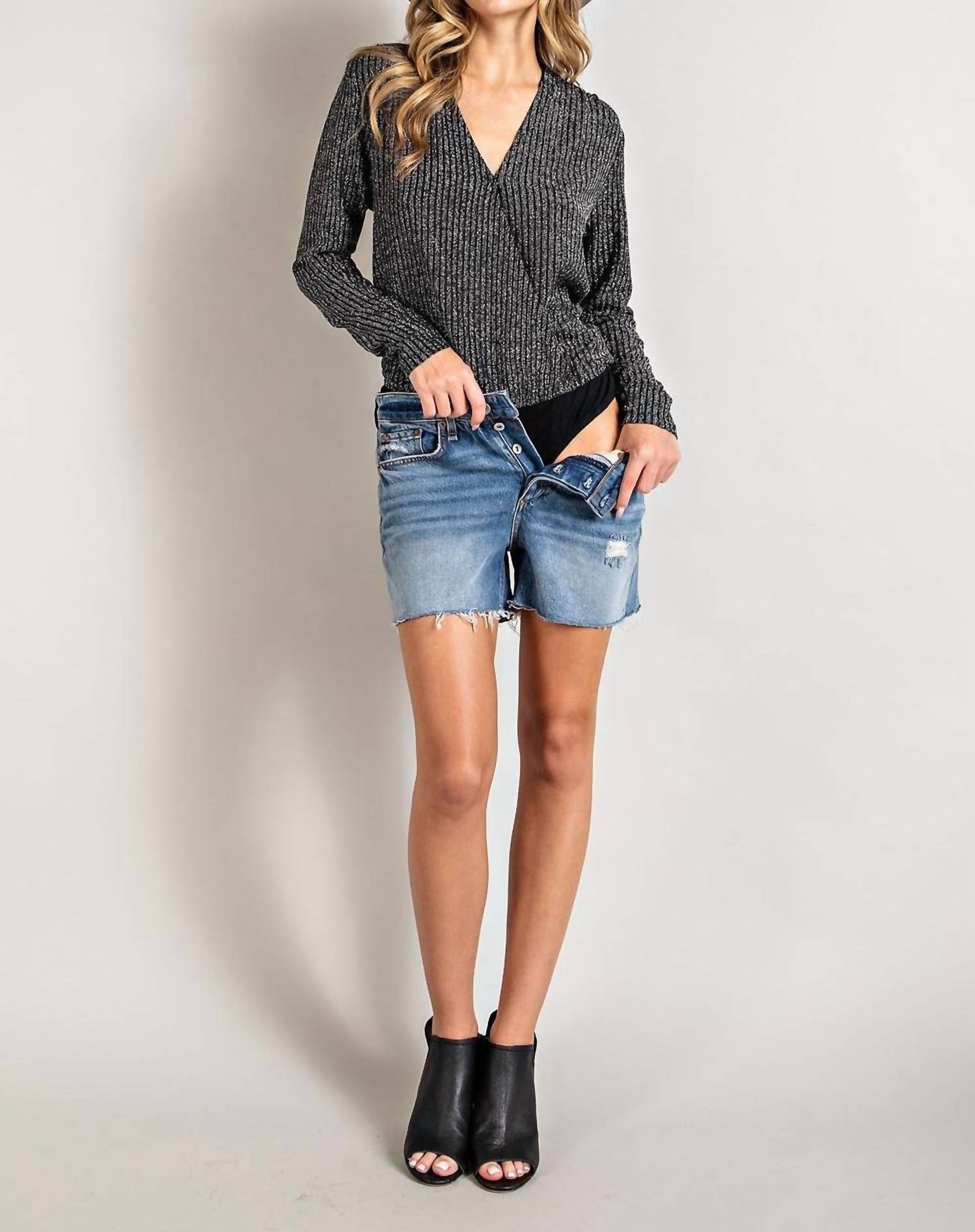A Black Metallic Fabric With Enough Bling To Dress Up Anything. Designed With A V-Neckline In A Surplice Bodysuit With Long Sleeves. 70% Nylon, 25% Wire, 5% Spandex.