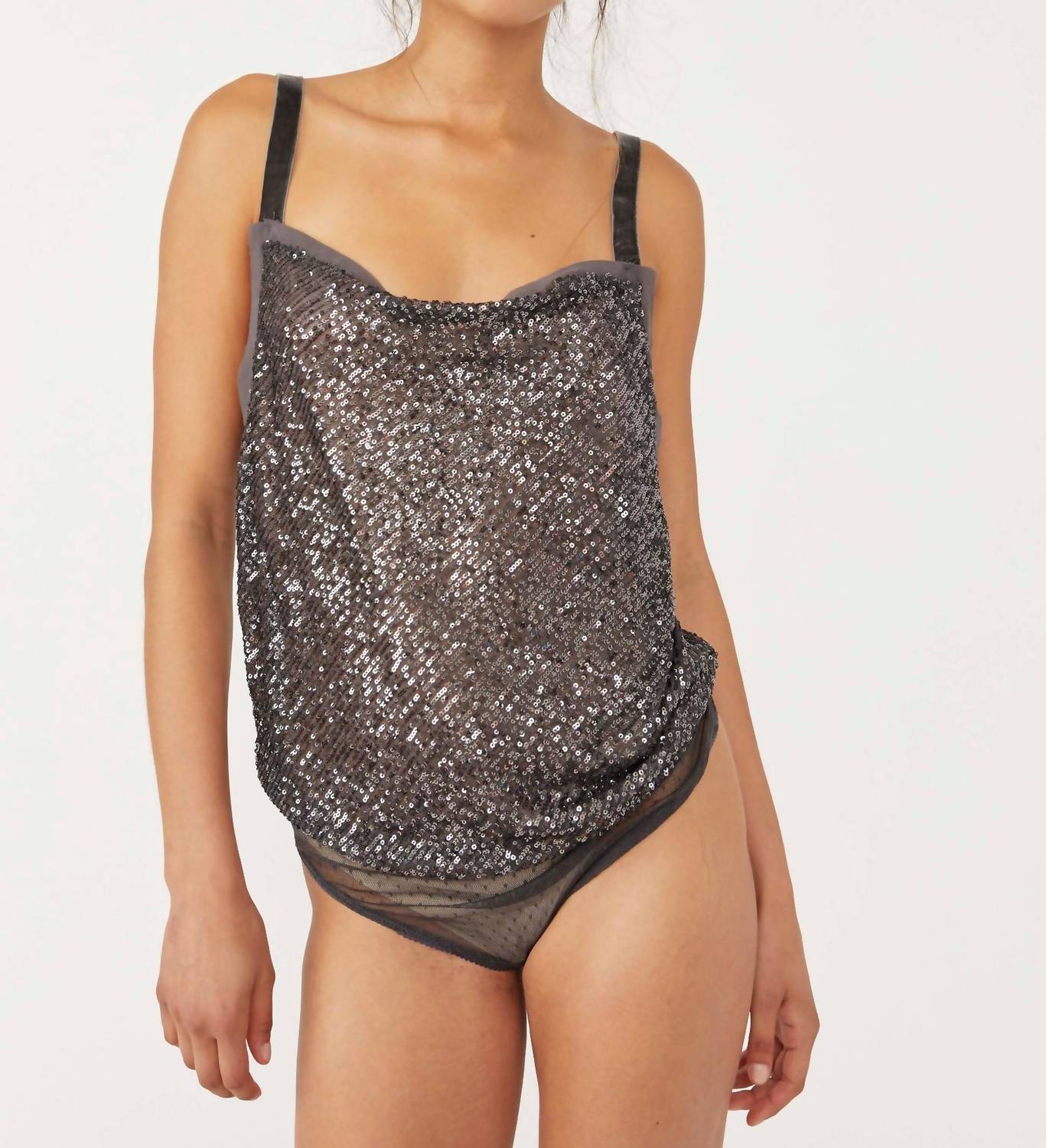 Pair this number with your favorite high-waisted jeans. Introducing the Shimmer & Shine Bodysuit by Free People, a stunning choice for a night out with its eye-catching sequins. This sleeveless design features spaghetti straps and a chic cowlneck in a sophisticated charcoal grey. Crafted from polyester, it offers a textured pattern with a pull-on closure for easy wear. Care instructions include hand washing to maintain its sparkling allure.